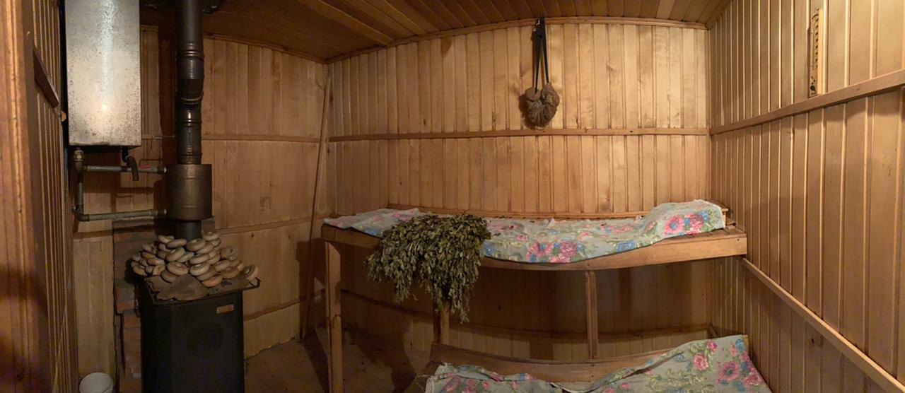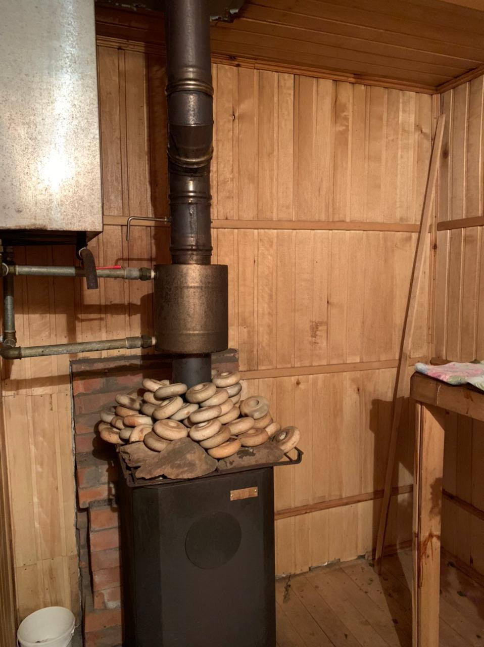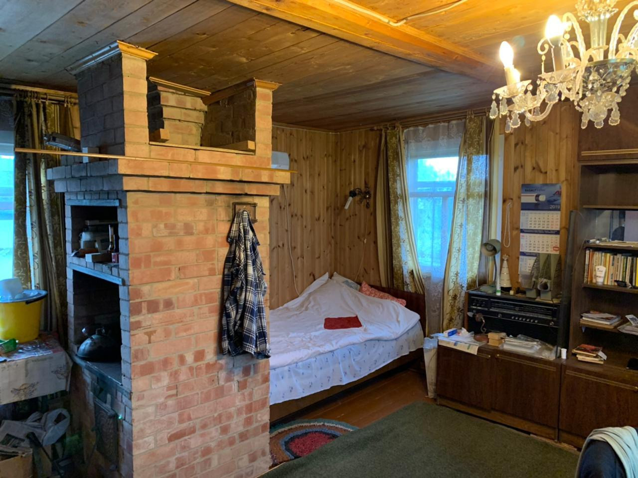 Фундамент из блоков, стены бревно, отделка вагонка, отопление печное.