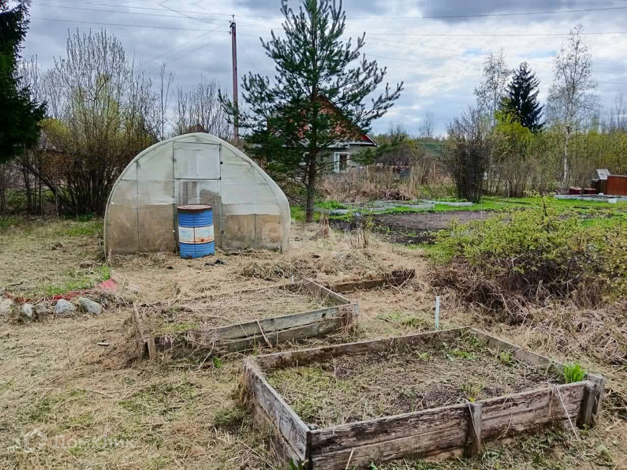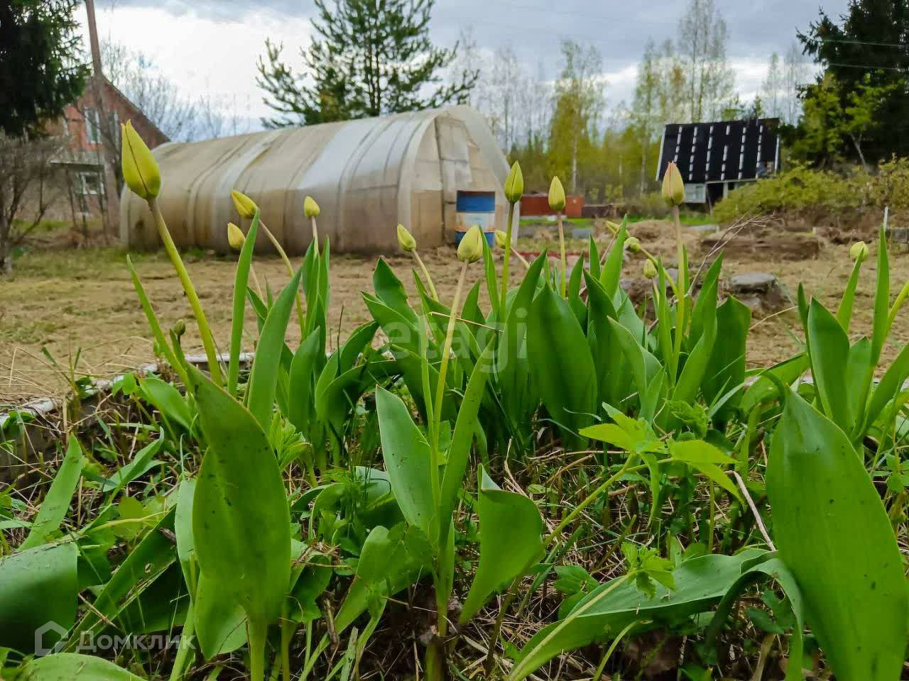 Участок разработан, много плодовых деревьев и кустов : яблони, груши, орешники, красная и черная смородина, жимолость. А так же много цветов: сирень, розы, тюльпаны.