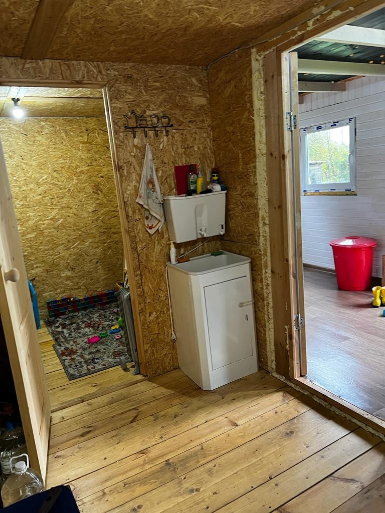 На участке есть летний каркасный домик 28 квадратных метров. Есть старый хоз блок. Электричество день/ночь, заведено в домик.