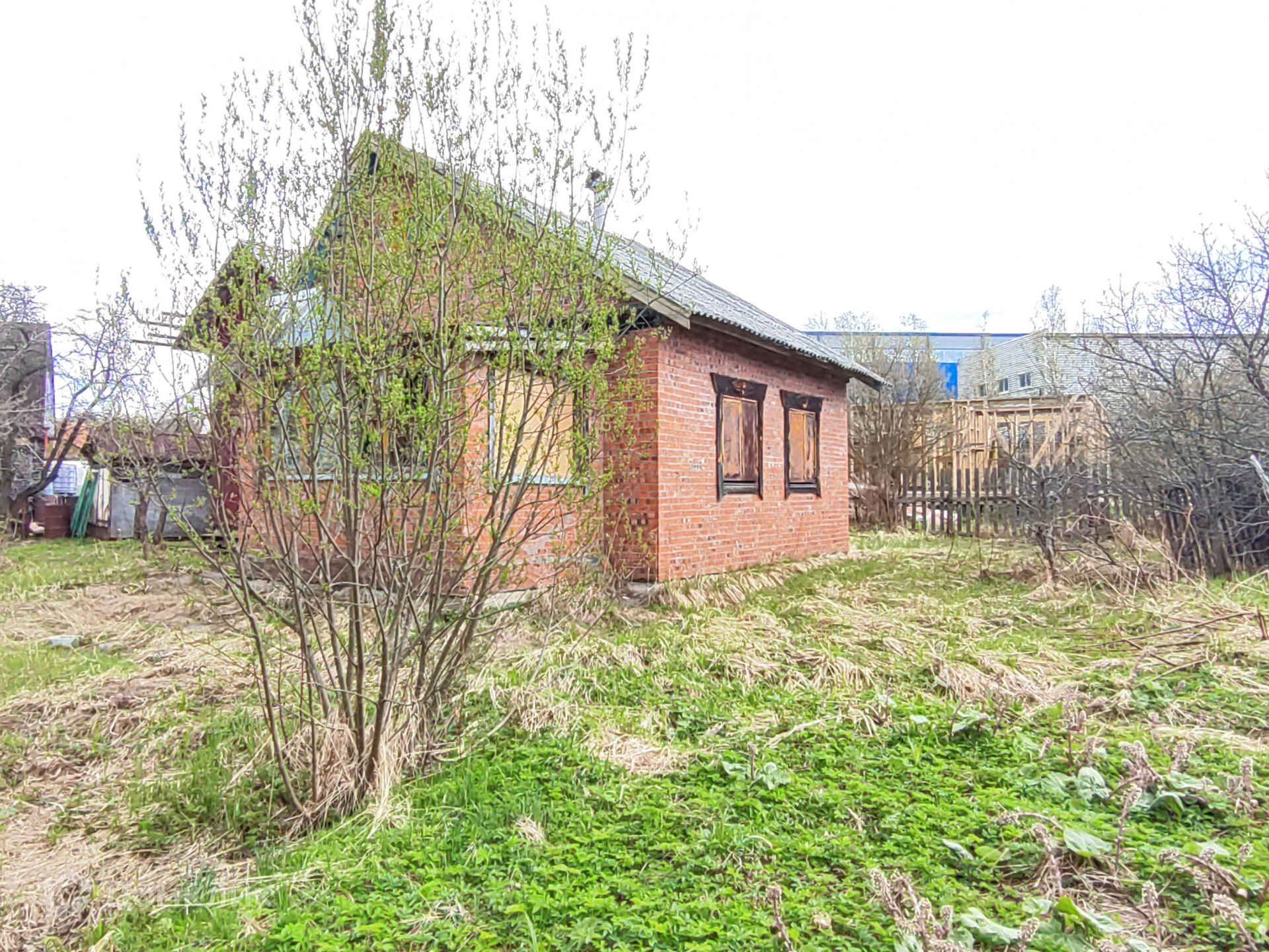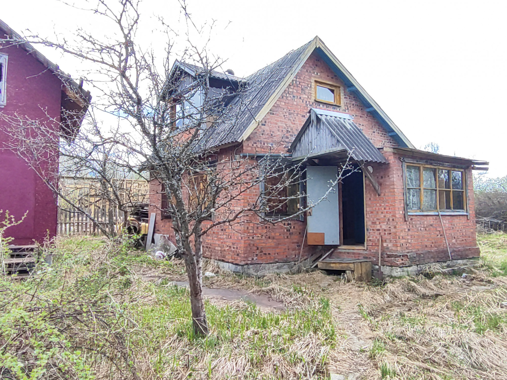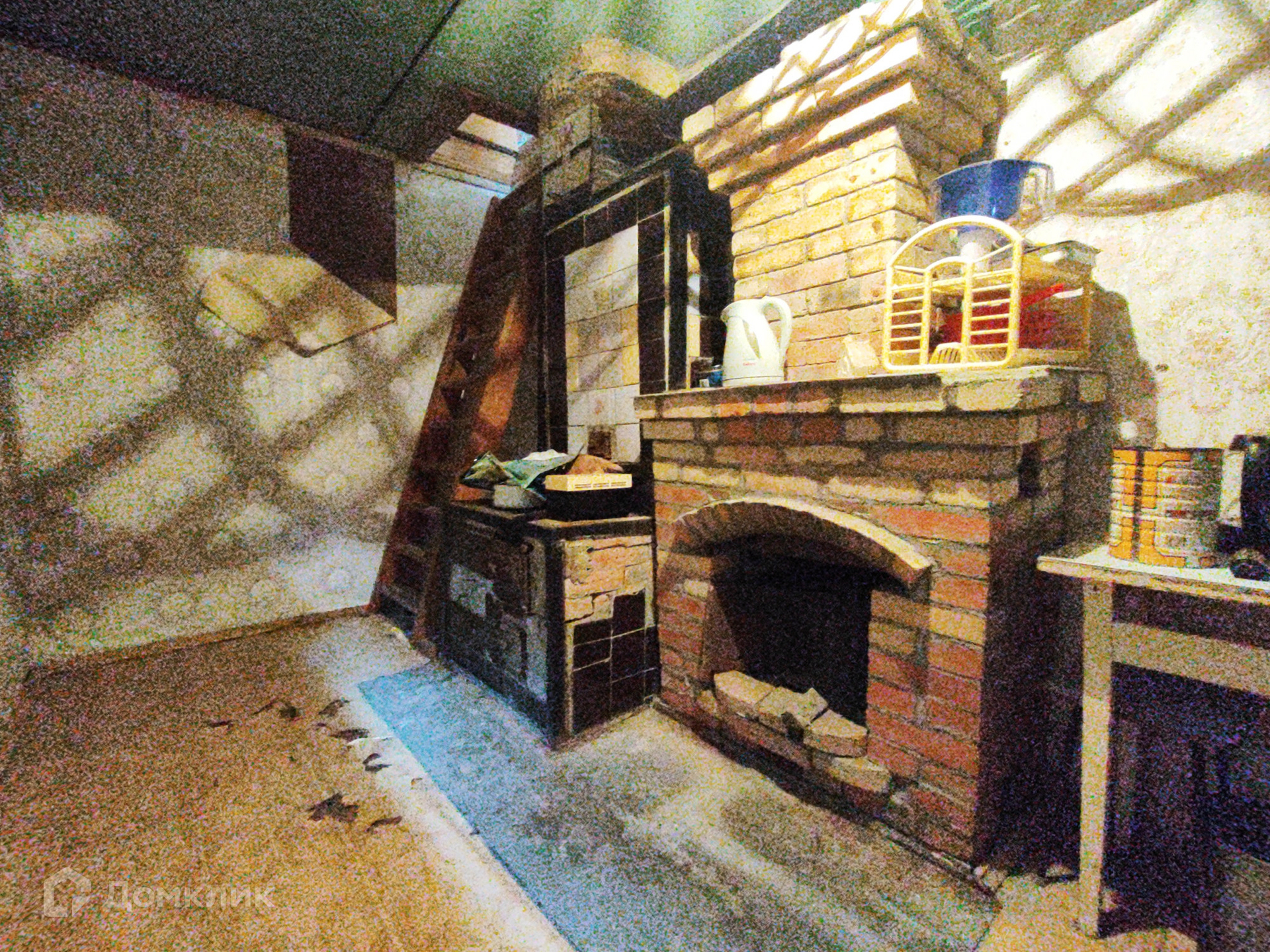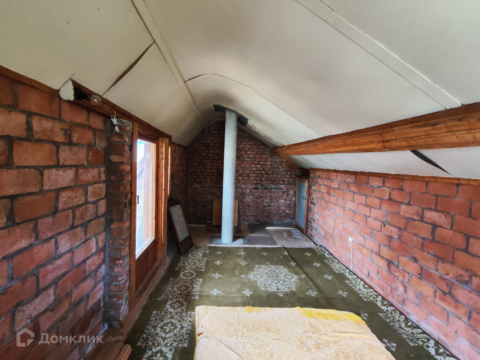Кирпичный дом 1 этаж – 1 комната+ кухня, 2 этаж- комната с балконом. Крыша-шифер. Фундамент –блоки. Перекрытие между этажами бетонные плиты. Окна деревянные, в кухне установлена печь-камин. Дом требует ремонта.