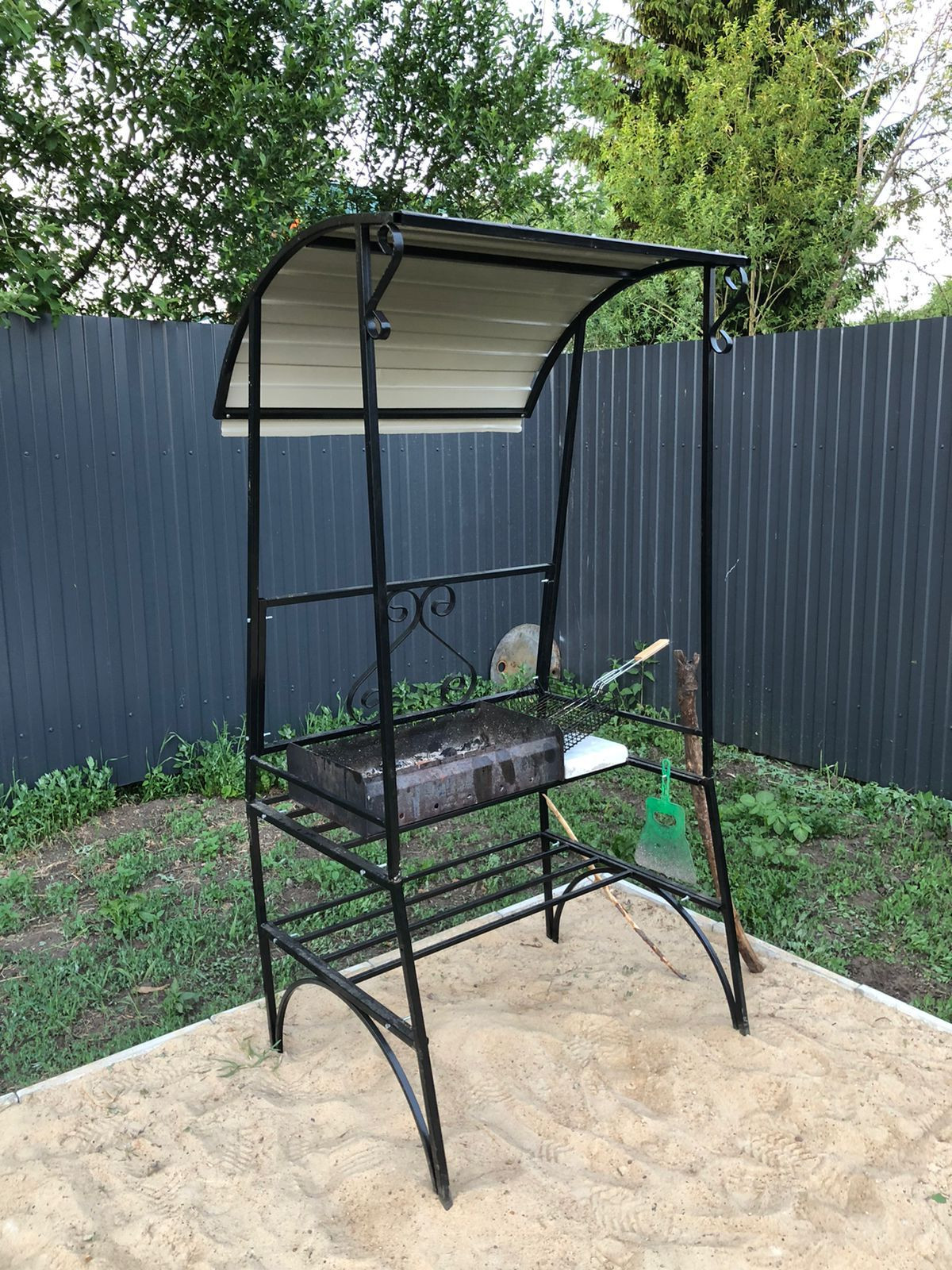 Есть мангальная зона с небольшим мангалом и 2 скамейками