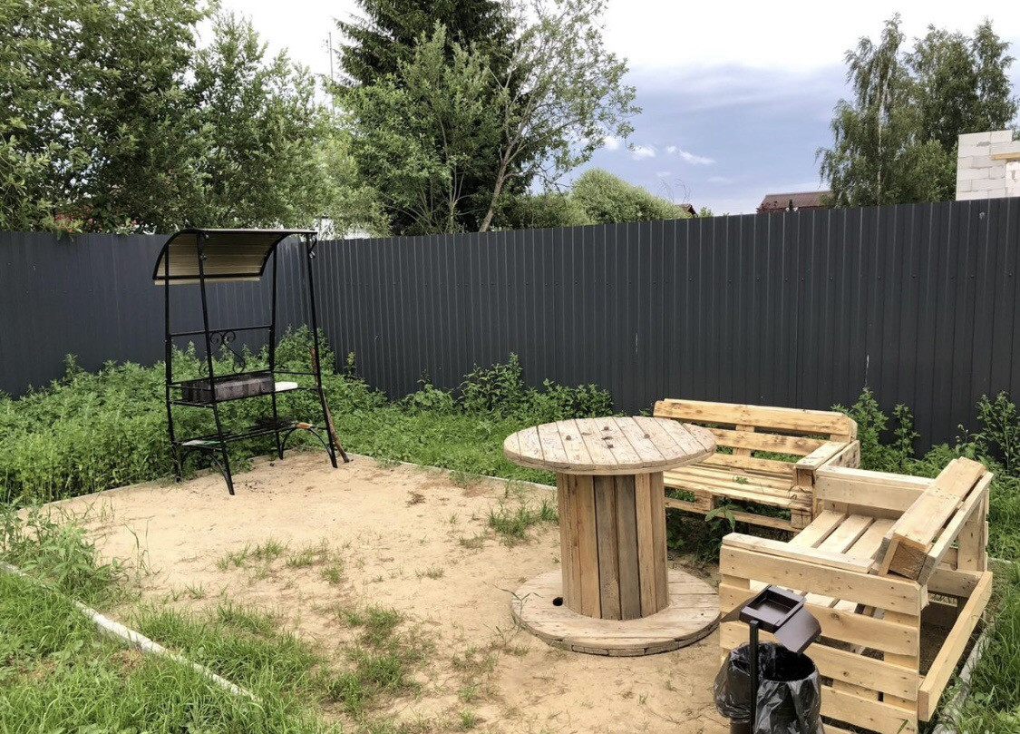 Есть мангальная зона с небольшим мангалом и 2 скамейками