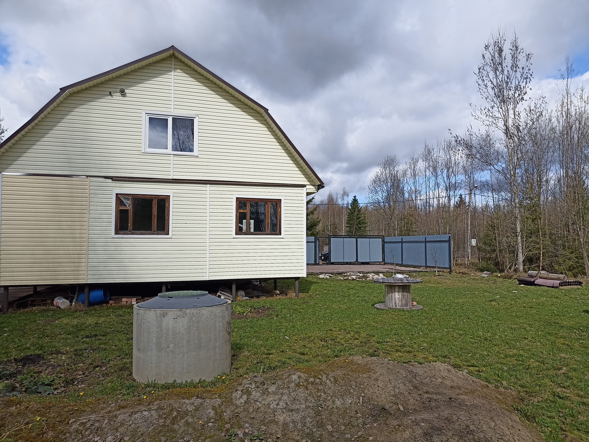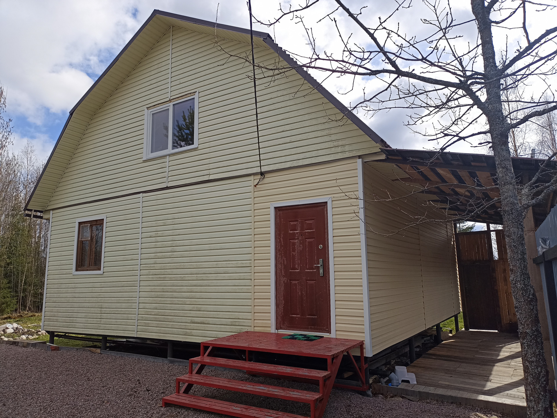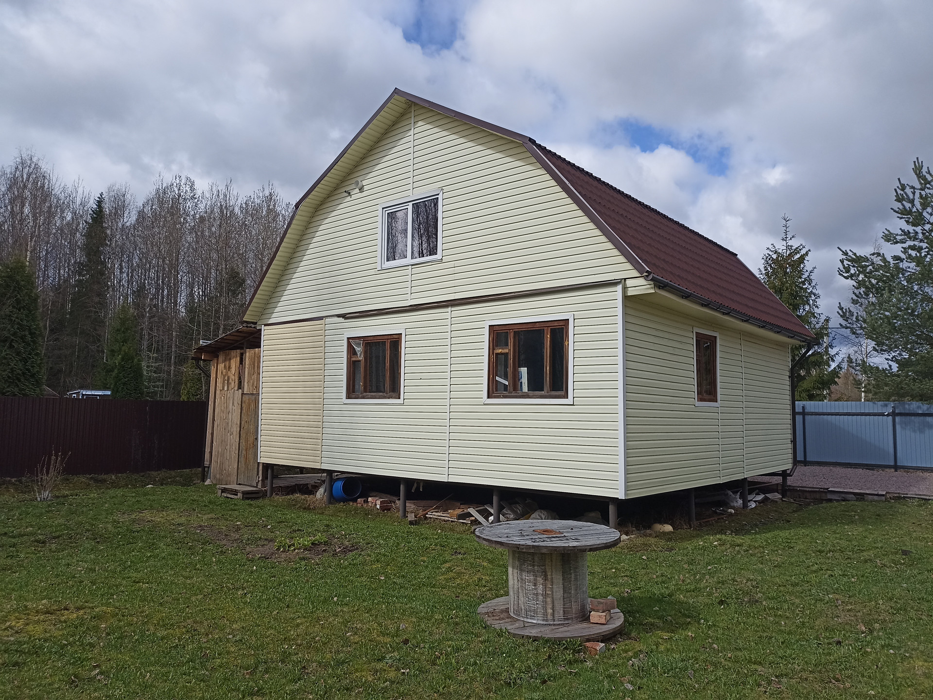 - Материал стен: первый этаж - бревно 20-26 см, второй этаж - каркасные конструкции с утеплением 150 мм, обшит сайдингом, крыша - ондулин(уложен в 2022 году).