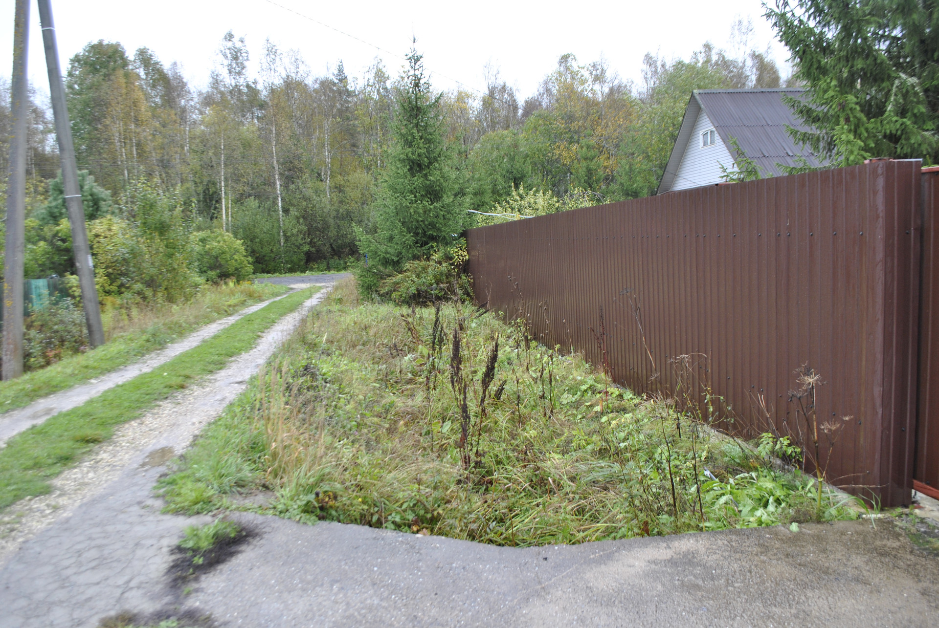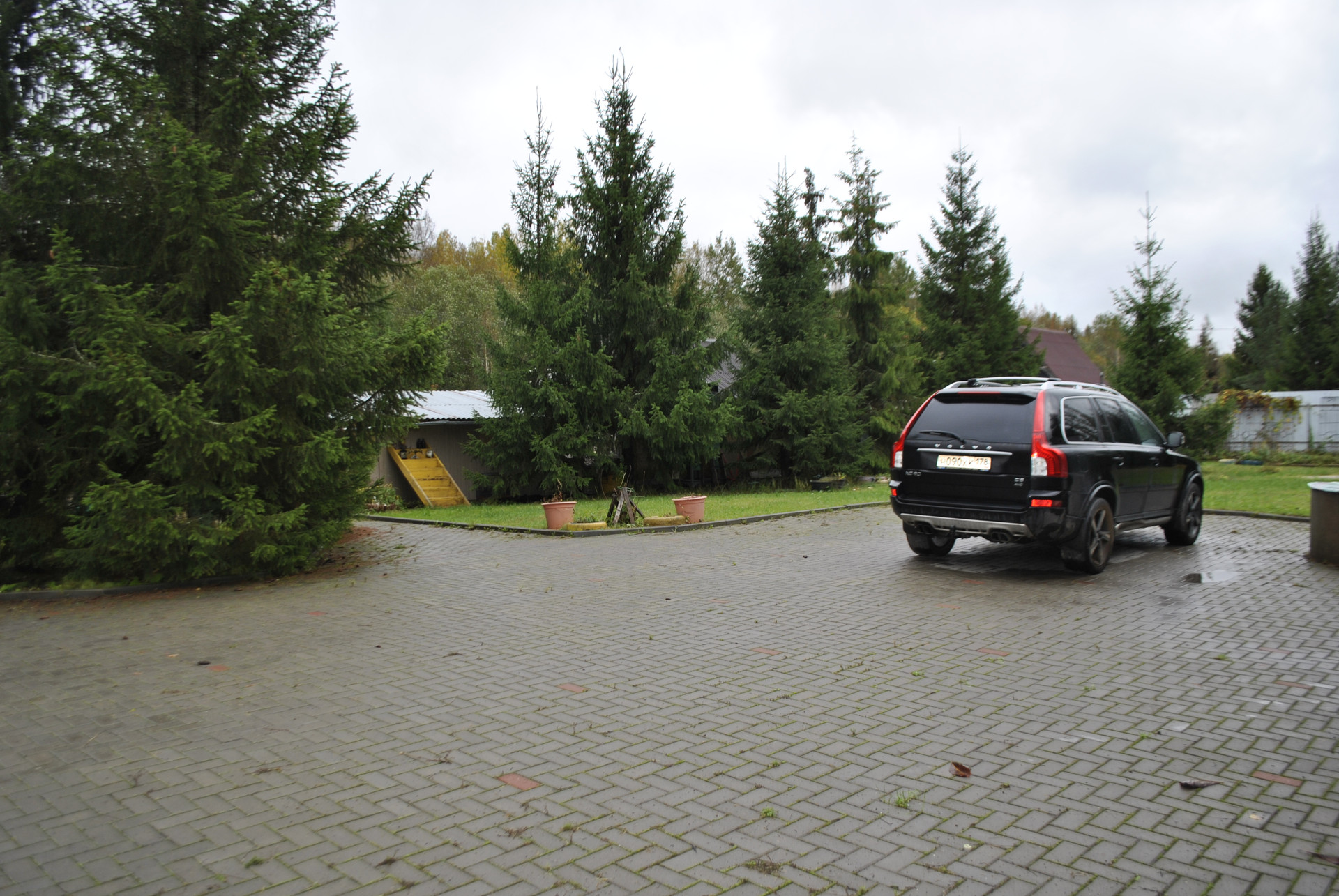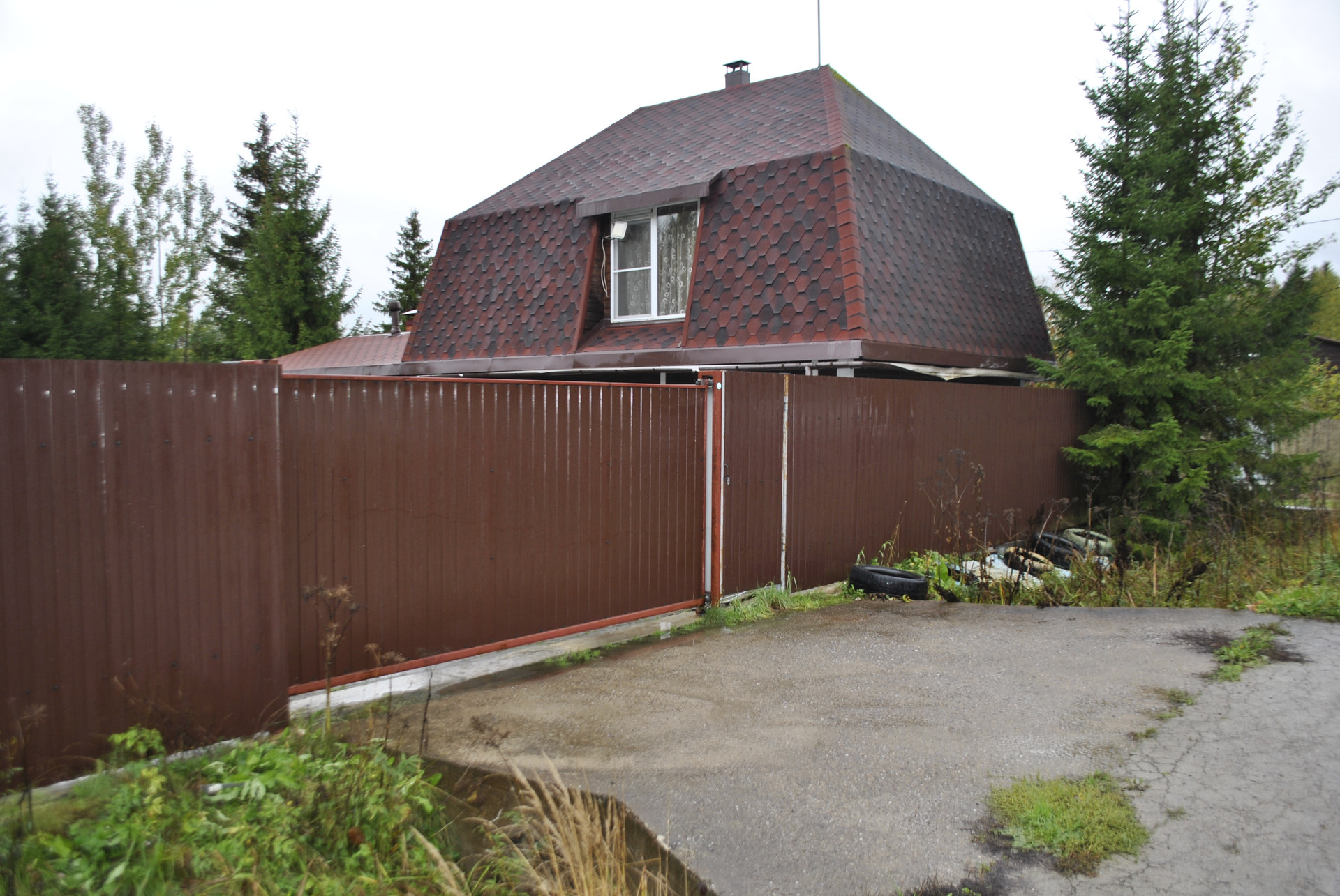 Забор с откатными воротами, большая парковочная площадка на 4 машины.
