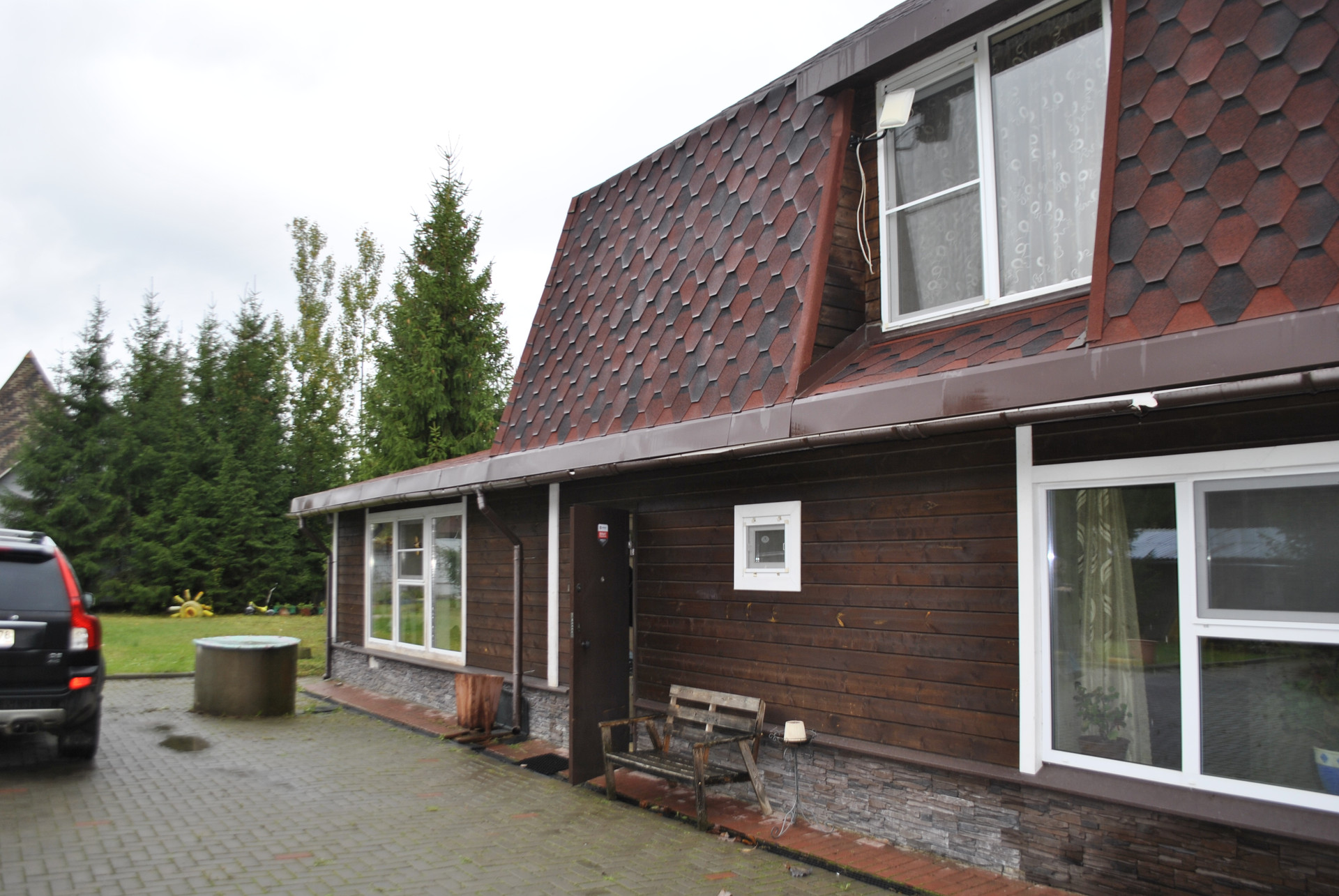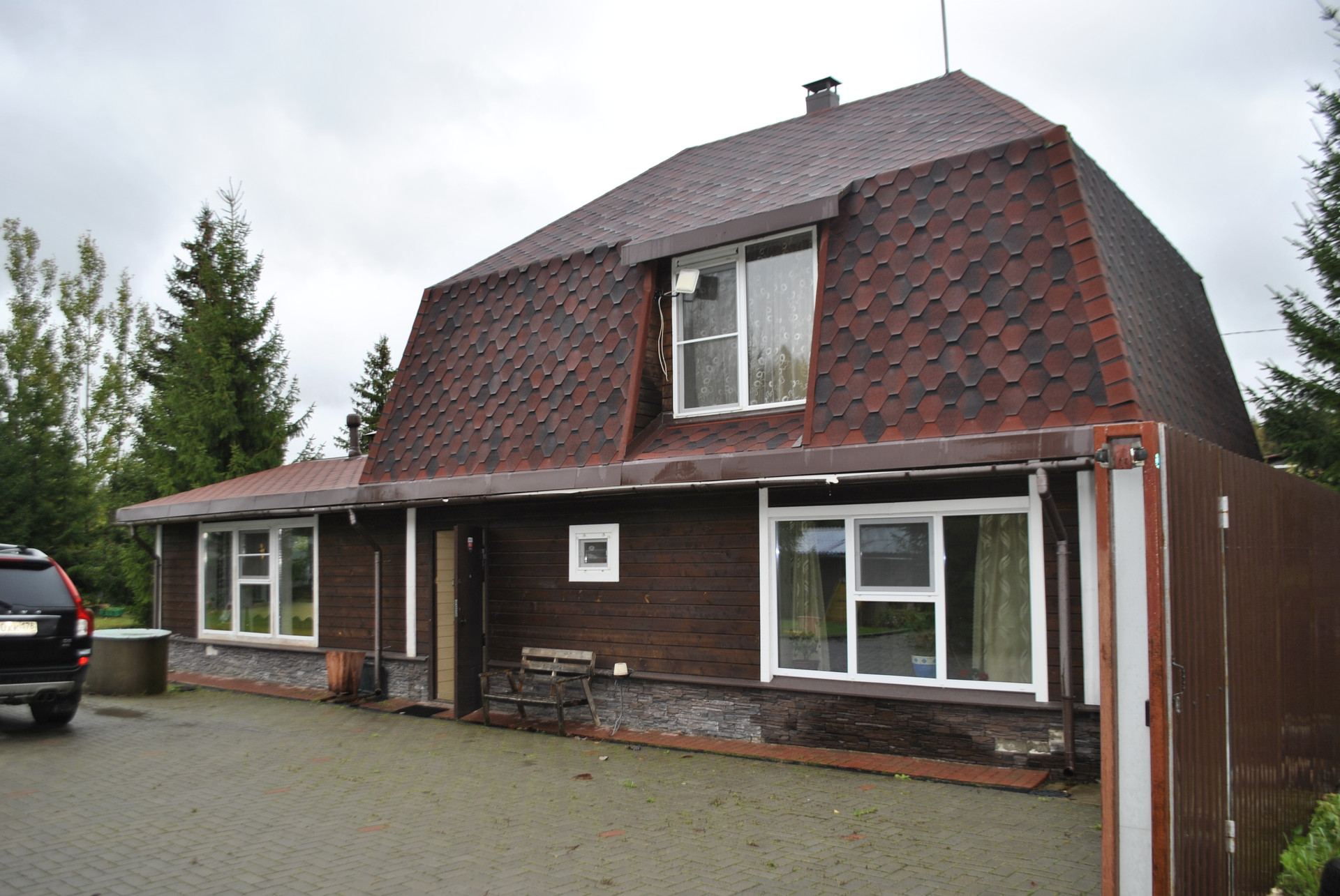 Дом из газобетона -первый этаж, второй бревно. Крыша- гибкая черепица. Фундамент - бетонная плита. Отделка дома - имитация бруса.