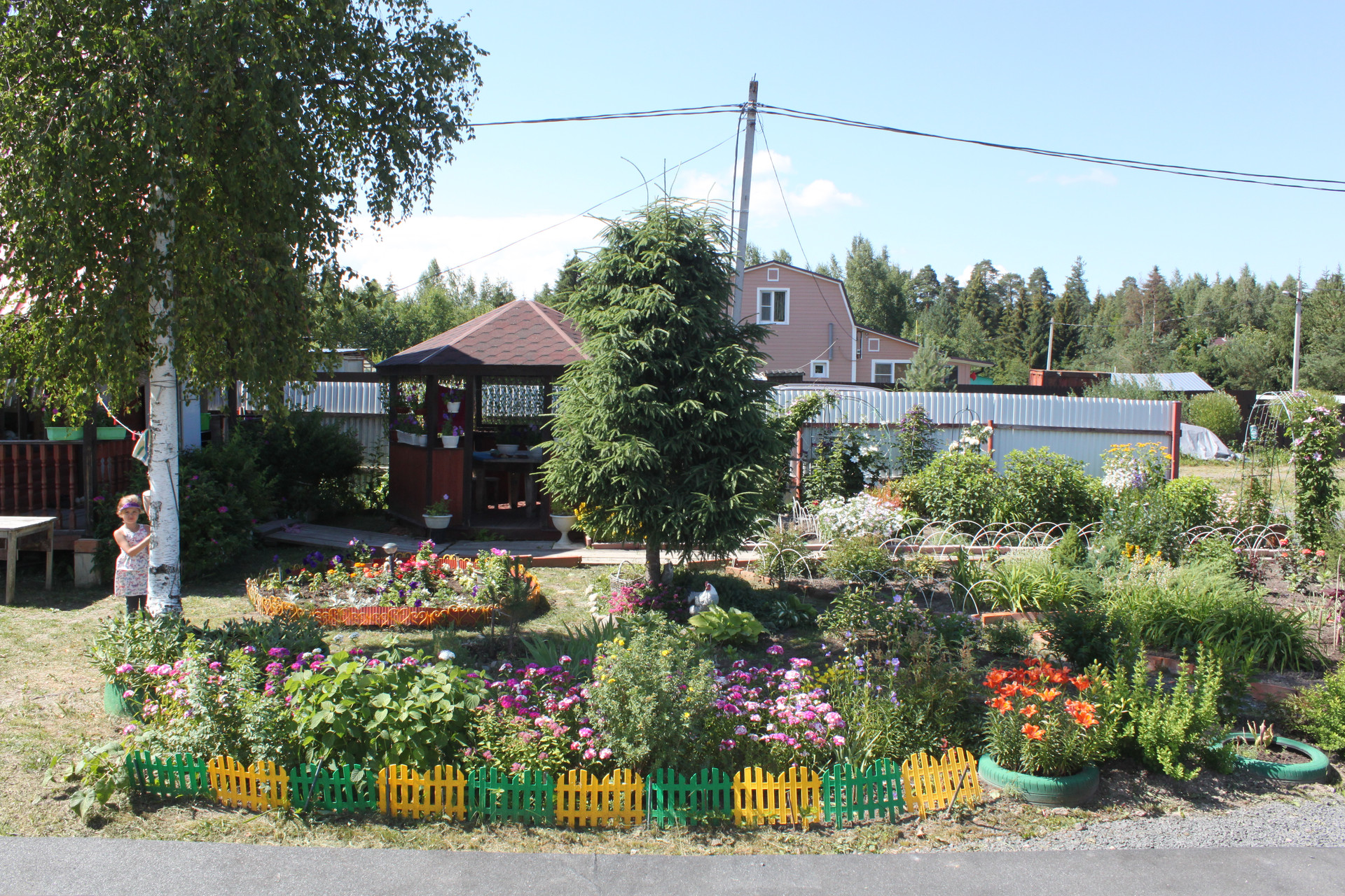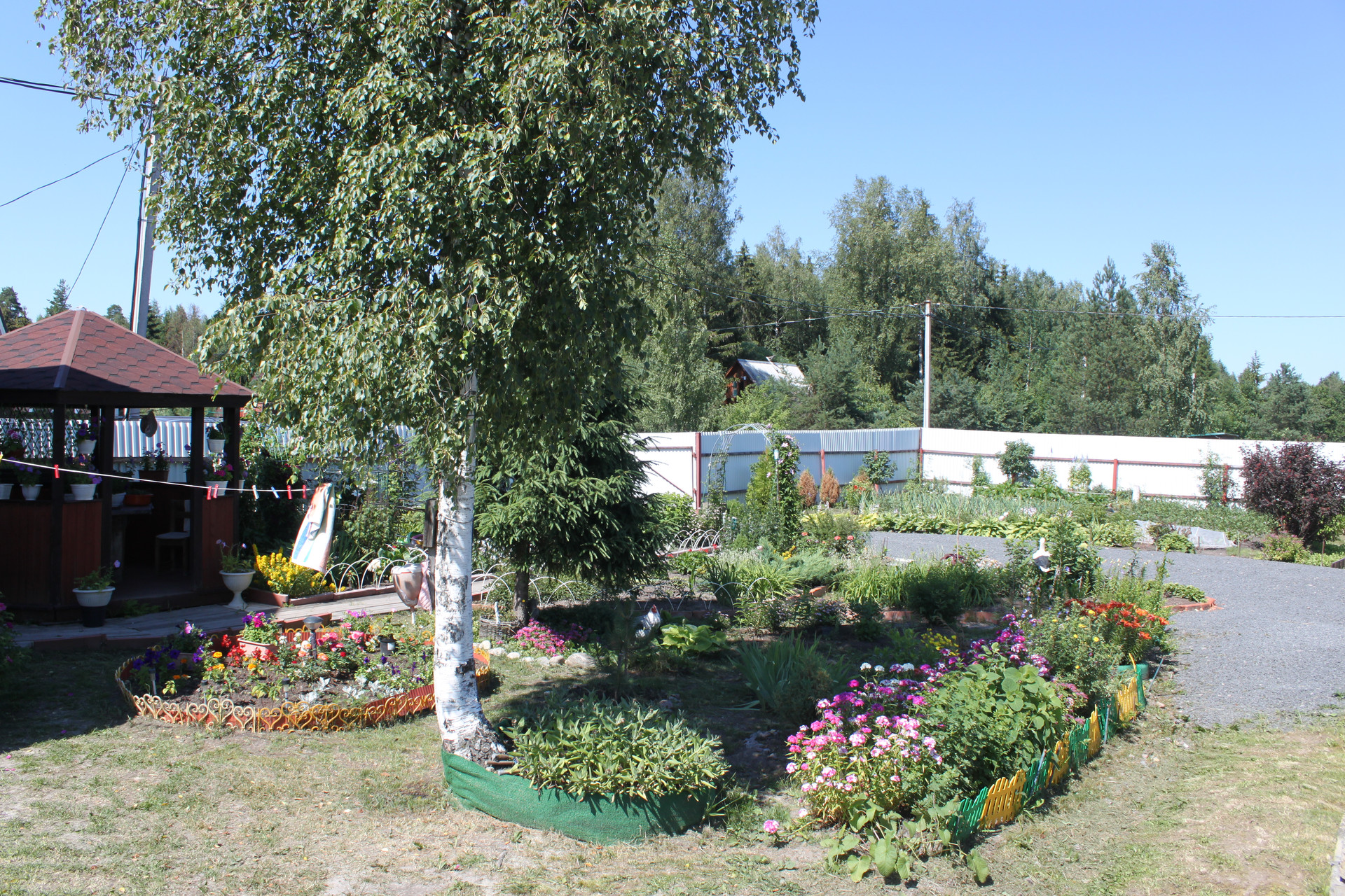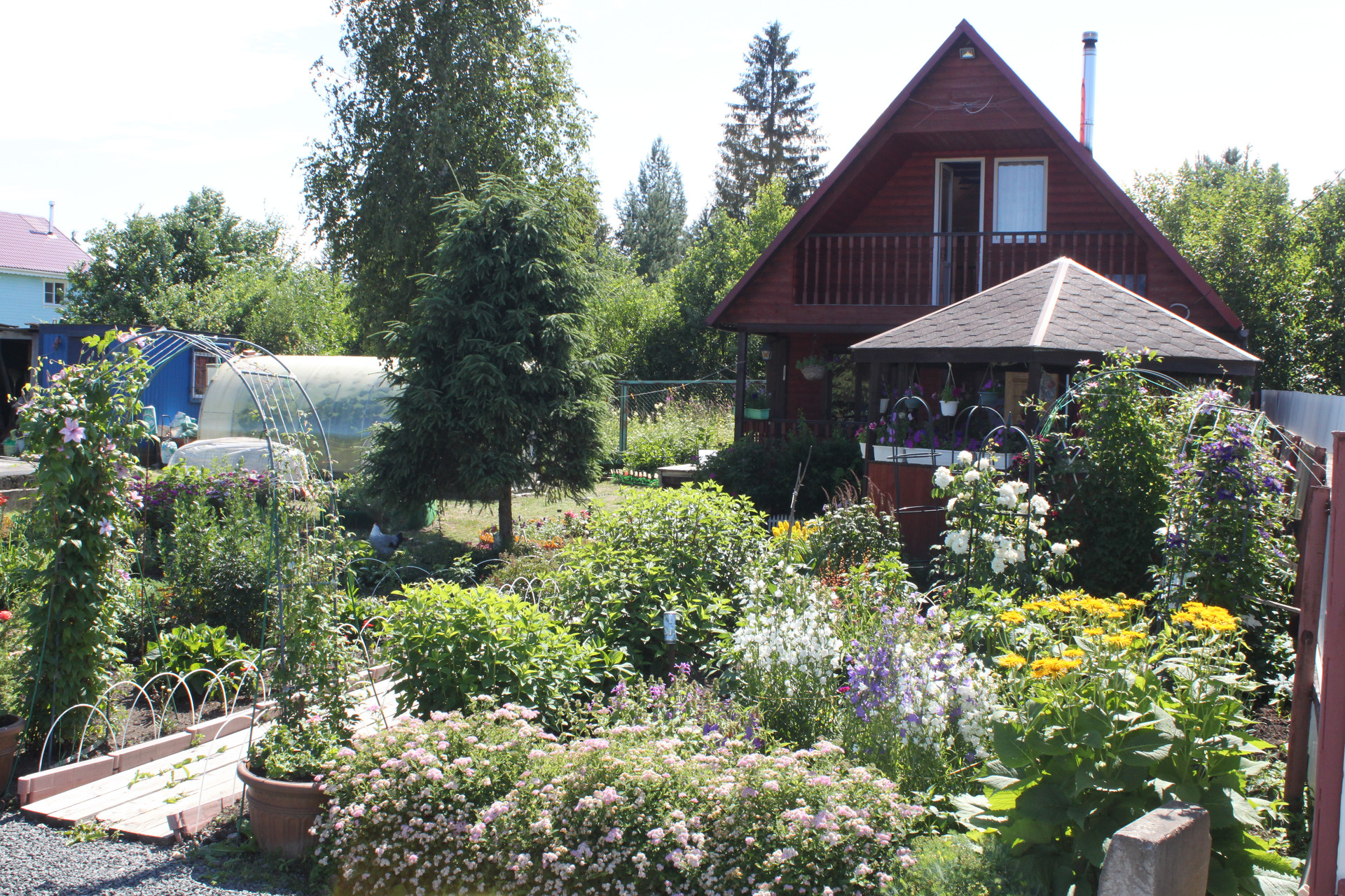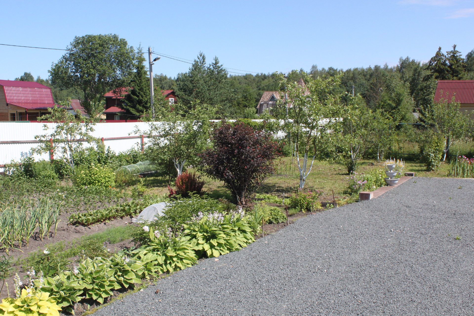 Распахано и пользуется спросом под посадки - 4 сотки. Остальное - в анабеозе. Высажены и плодоносят - 6 яблонь (или 7???) разных сортов (и летние и осенние) Слива жёлтая и синяя, вишня, каринка, черноплодка, малина, клубника, земляника, жимолость, черная смородина, красная. На любой вкус и цвет - ешь - не хочу. Цветуёчки всяки разны.
