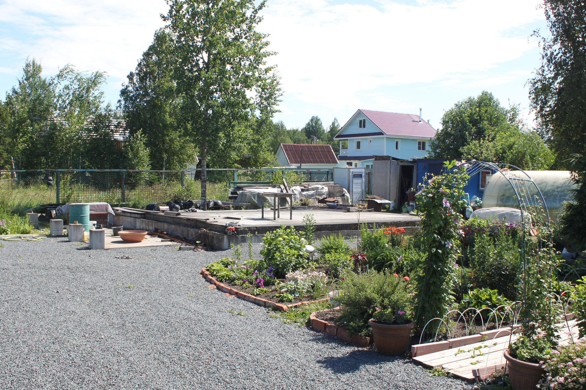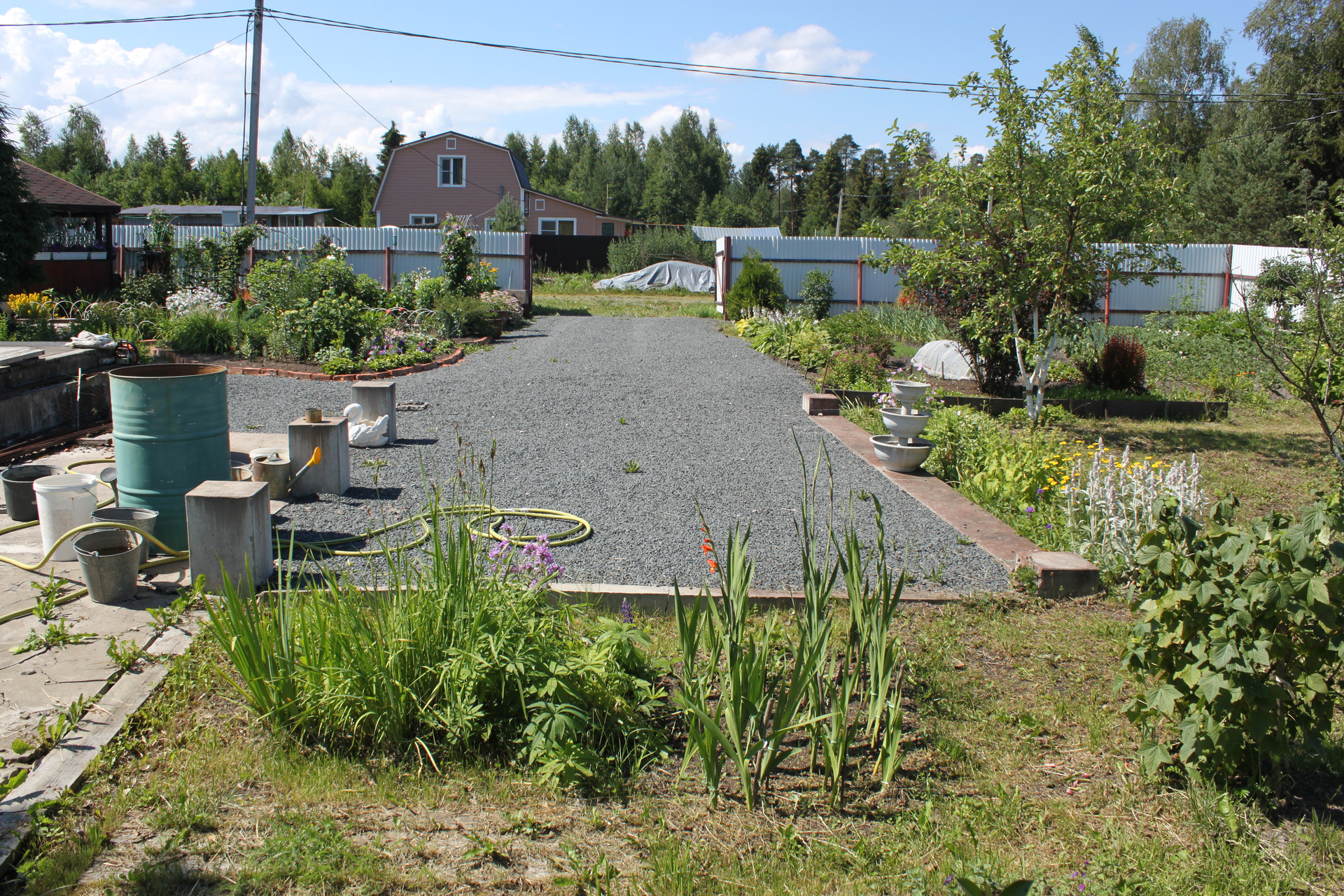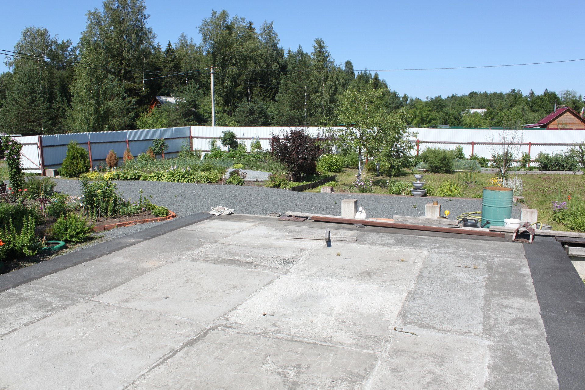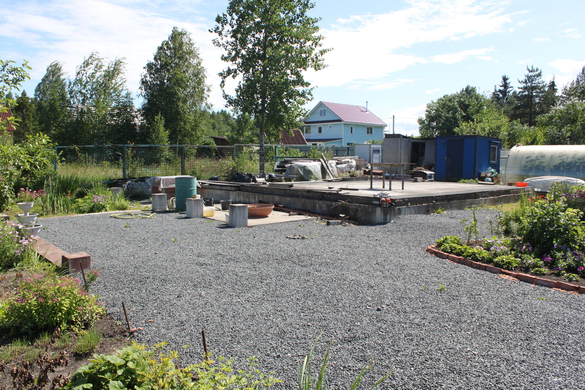 После раскорчёвывания участка был выполнен его частичный дренаж. Посему, в момент схода снега, весь заезд и большая часть участка напоминают знойную прерию саванны засыпанную очень мелким гранитным щебнем фракции 5-20 мм, всегда готовую принять автомобиль любой грузоподъёмности. И даже не один. Вообще заезд рассчитан на 5 не маленьких машин. Кстати сам заезд на участок исполнен в виде монолитных железобетонных подпорных стенок скрывающих под собой толстостенную металлическую трубу для пропуска воды. Конструкция получилась надёжней плотины Гувера в США.