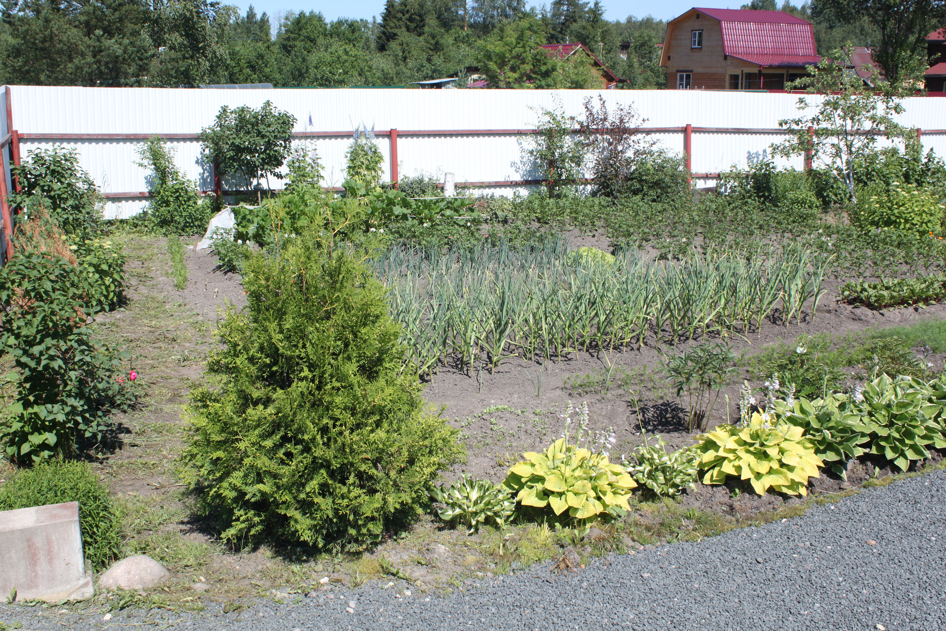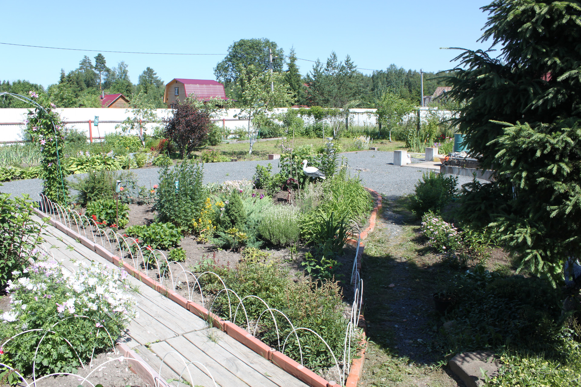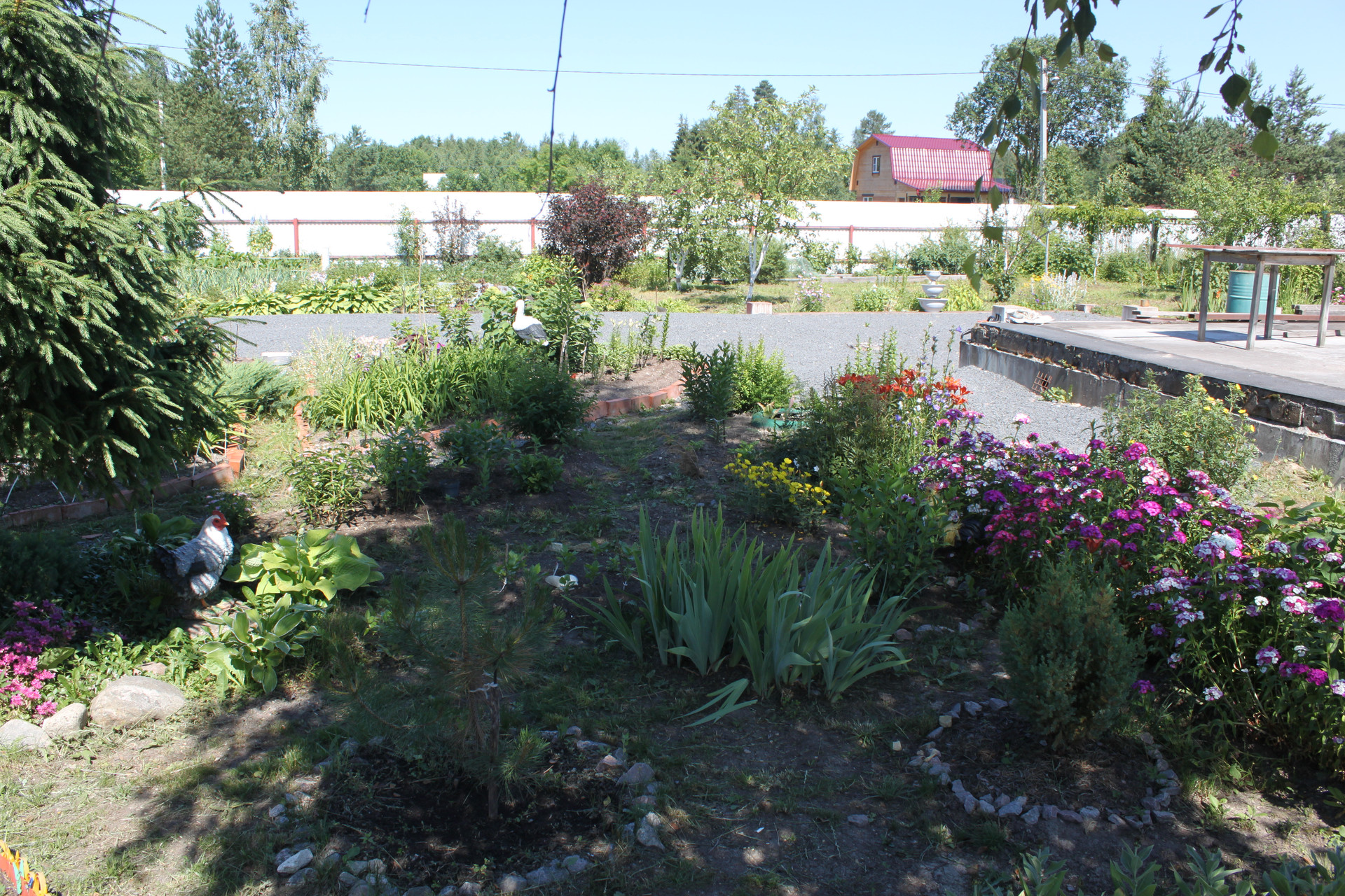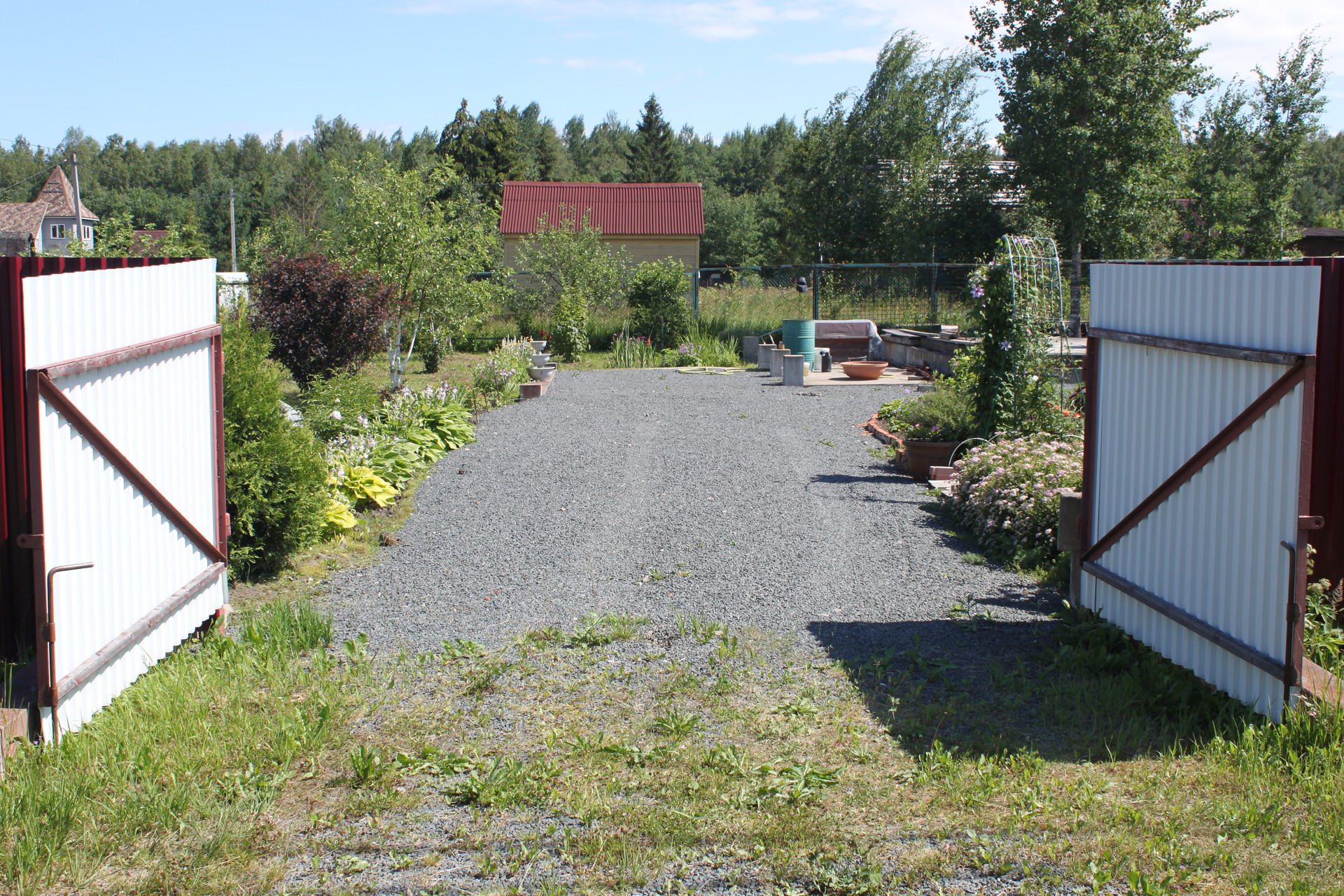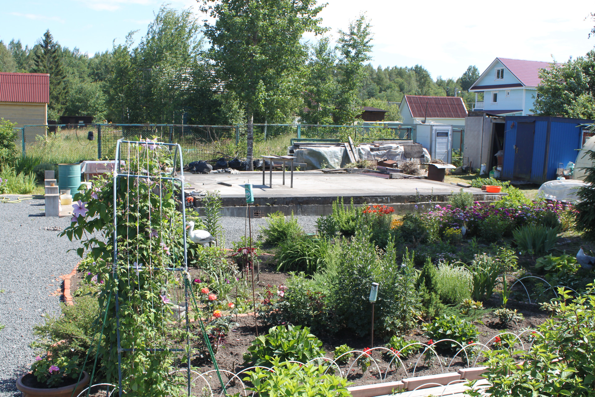 После раскорчёвывания участка был выполнен его частичный дренаж. Посему, в момент схода снега, весь заезд и большая часть участка напоминают знойную прерию саванны засыпанную очень мелким гранитным щебнем фракции 5-20 мм, всегда готовую принять автомобиль любой грузоподъёмности. И даже не один. Вообще заезд рассчитан на 5 не маленьких машин. Кстати сам заезд на участок исполнен в виде монолитных железобетонных подпорных стенок скрывающих под собой толстостенную металлическую трубу для пропуска воды. Конструкция получилась надёжней плотины Гувера в США.