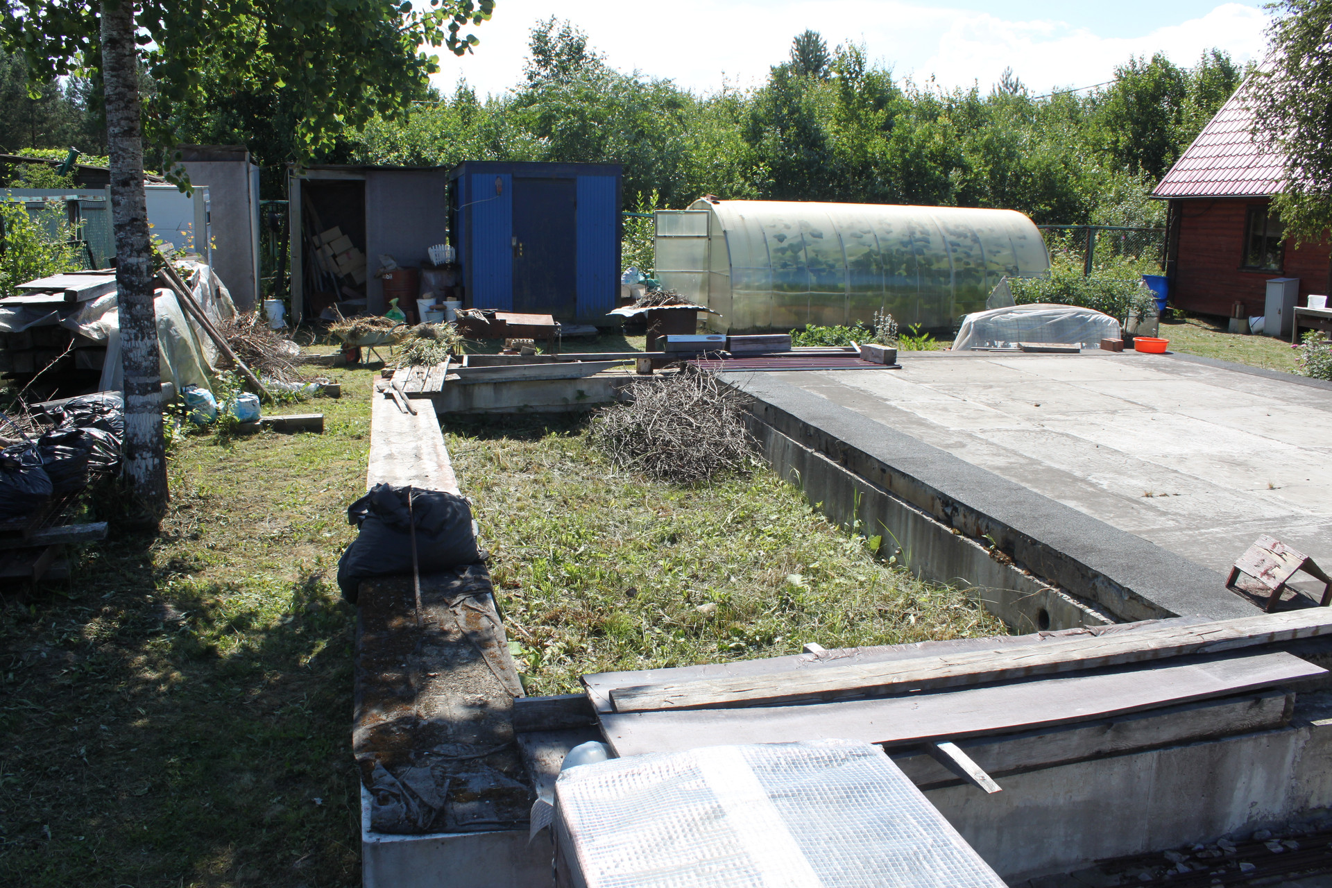 Далее был задуман и представлен в свет фундамент под дом. Причём дом задумывался душевный, не маленький в высоту, поэтому фундамент был выполнен не только на совесть, но и по нагрузкам под трёхэтажный каменный дом. Глубина залегания его составляет 1.8 метра. Выполнен он как "пятистенок" с дополнительной перемычкой под камин и возможностью устройства зимнего погреба. Ну или если кому приспичит в нынешних реалиях - подземного бункера. Размером дом затевался - 8 х 9 метров с двумя выносами - под тёплую веранду 2.7 х 6 м и навес под автомобиль - 4 х 6 метров. Под эти выносы и навес забетонированы монолитные железобетонные столбы глубиной заложения как и фундамент дома - 1.8 метра. Фундамент сей, равно как и дровеник с беседкой внесены в земельные планы ПИБа. На начало 23 года стоимость устройства такого фундамента оценивается более чем в 1.5 лмн рубликов.