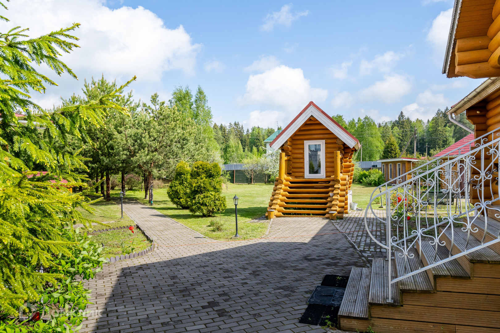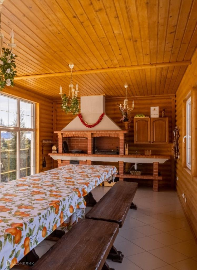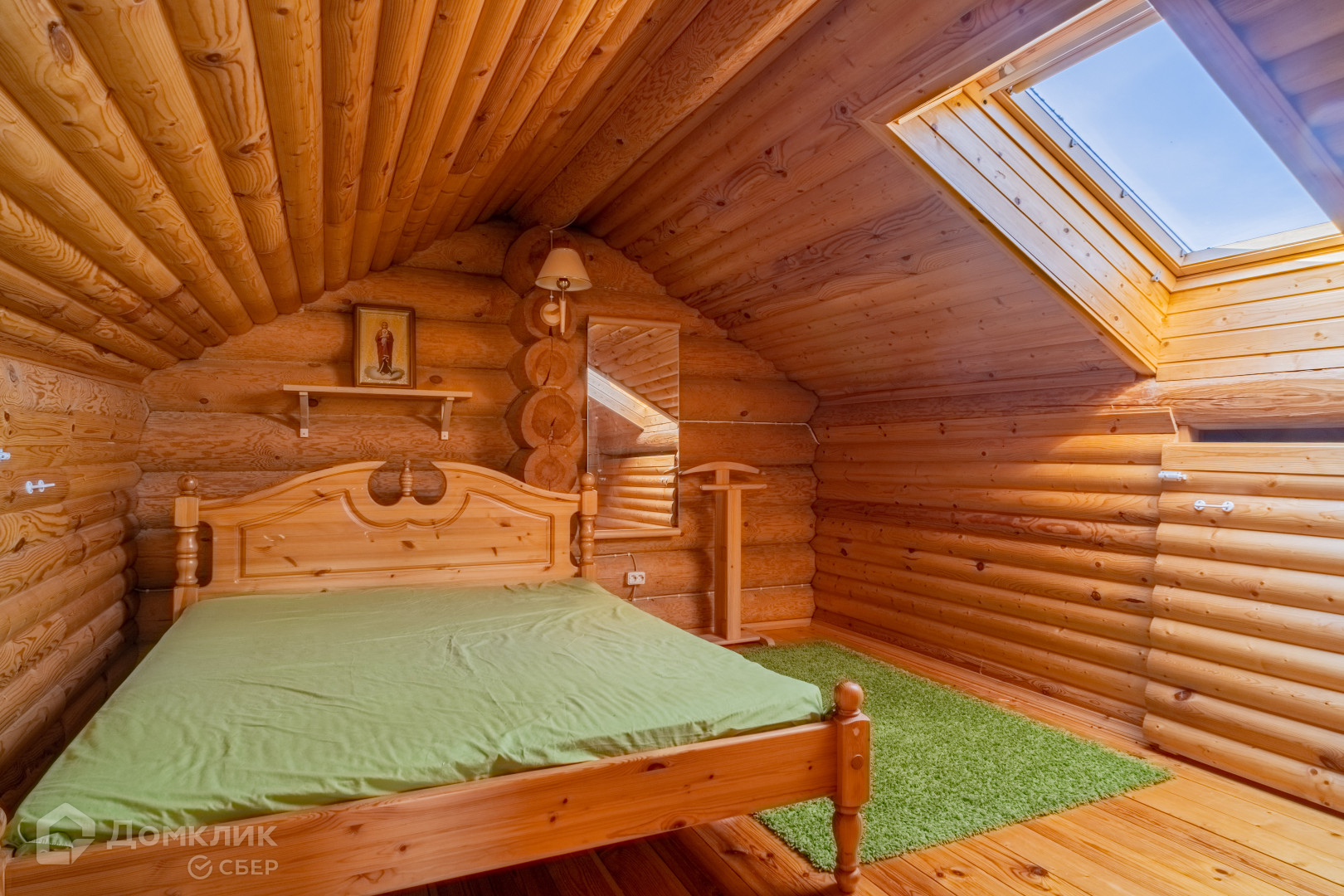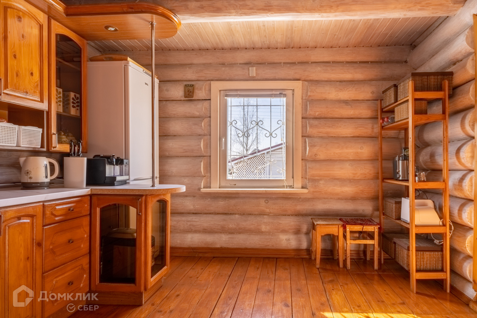 двухуровневый дом из круглого бруса с кухней, гостиной и камином, раздельным сан. узлом, двумя спальнями и встроенными шкафами;