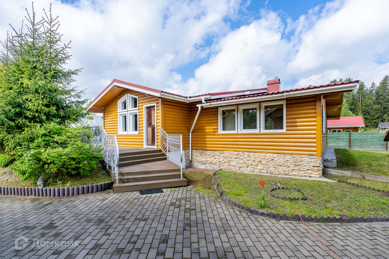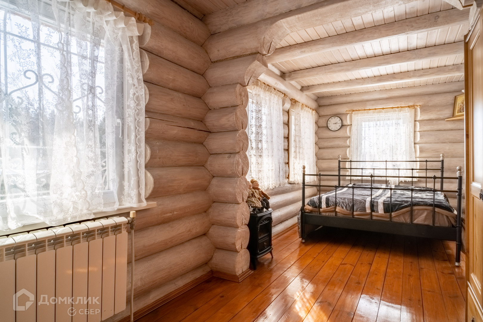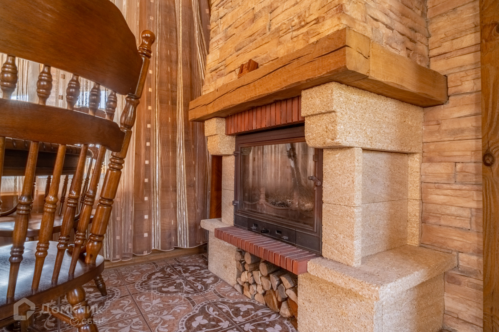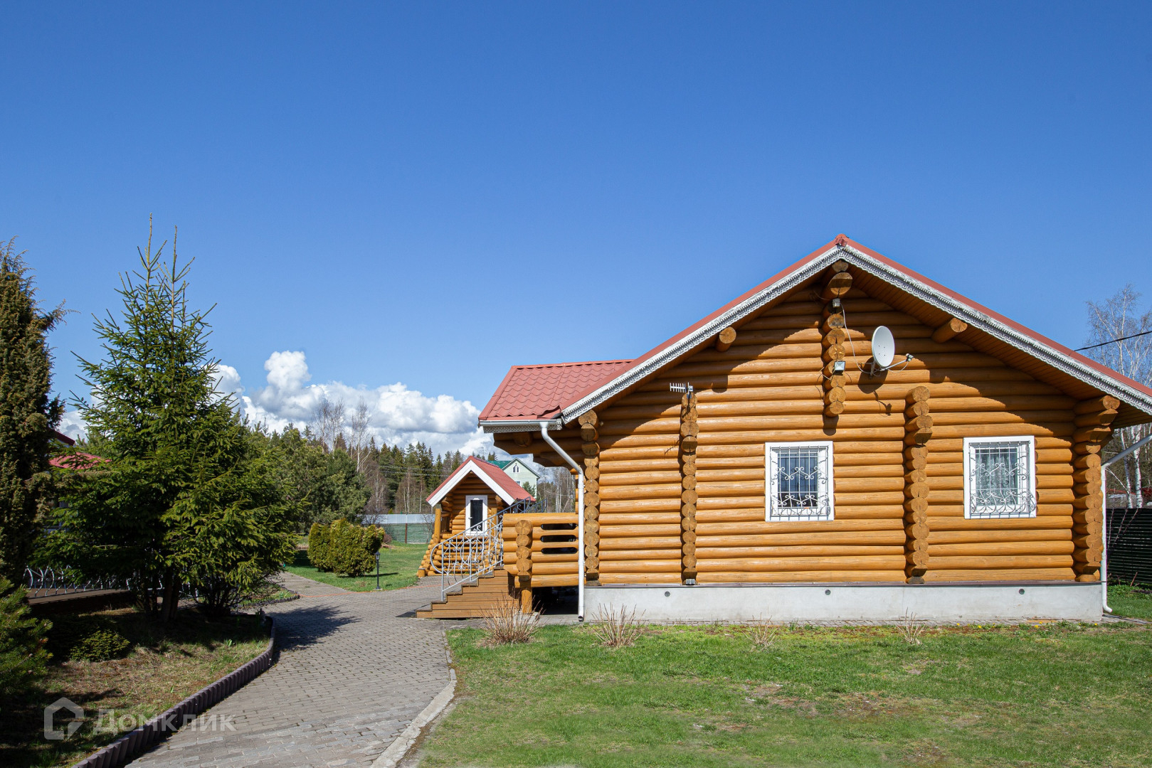 двухуровневый дом из круглого бруса с кухней, гостиной и камином, раздельным сан. узлом, двумя спальнями и встроенными шкафами;