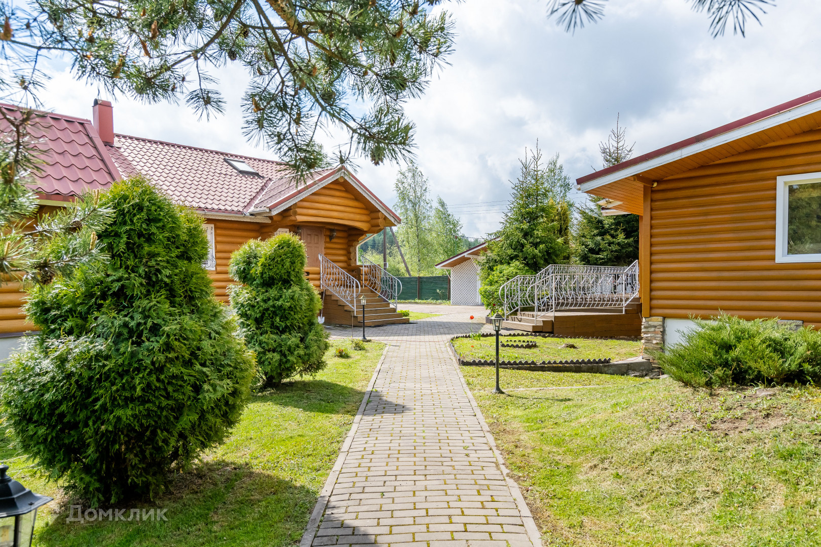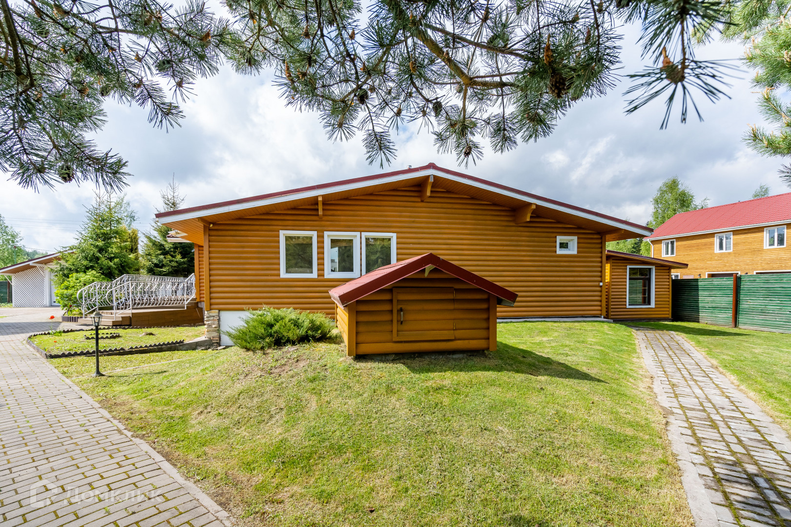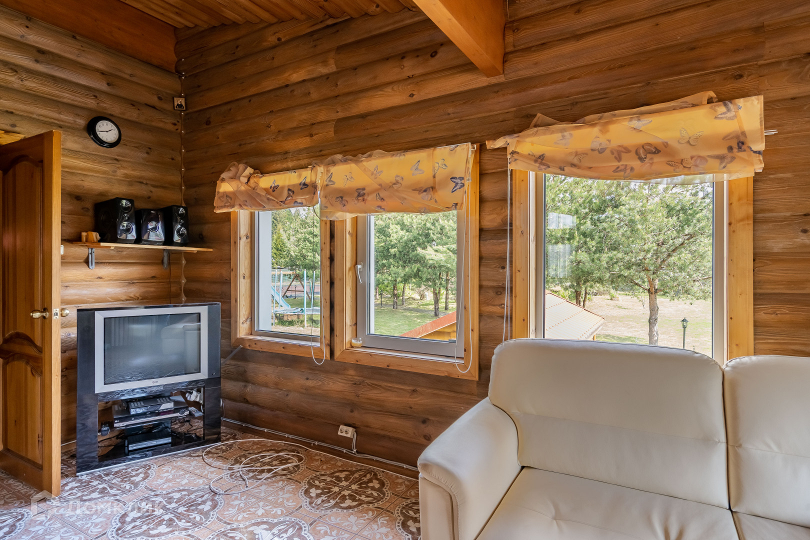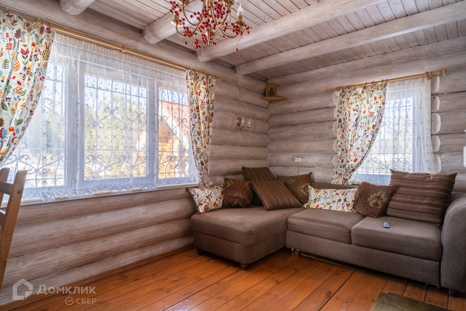 двухуровневый дом из круглого бруса с кухней, гостиной и камином, раздельным сан. узлом, двумя спальнями и встроенными шкафами;