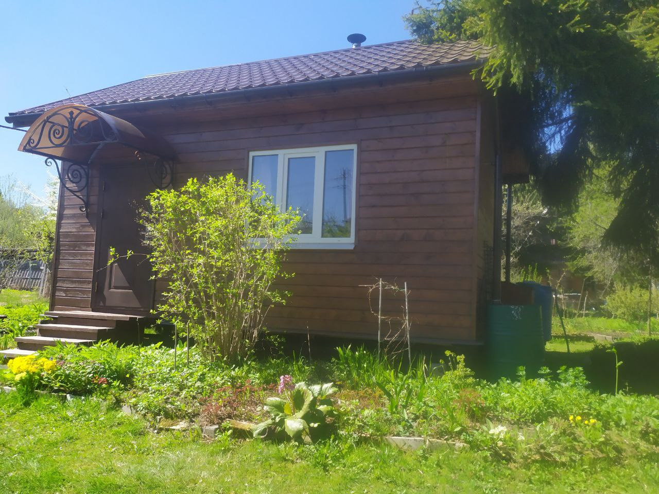 Размер: 6х4.5 м + крыльцо 1мх1,5 м с кованым навесом. Высота стен 2.5 м, высота конька - 1.5 м. Фундамент - винтовые сваи (12 шт).