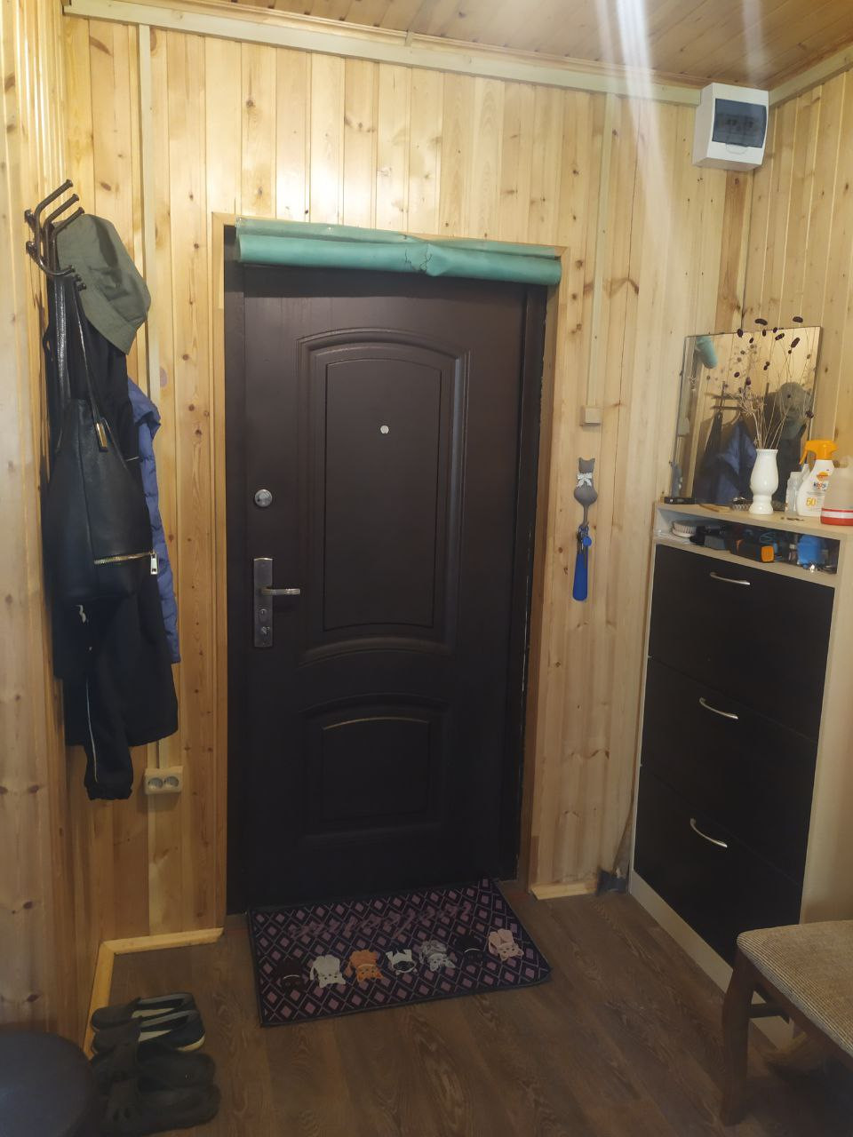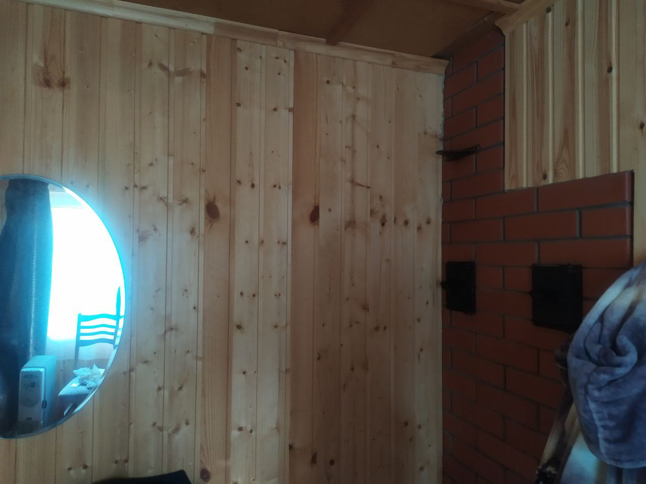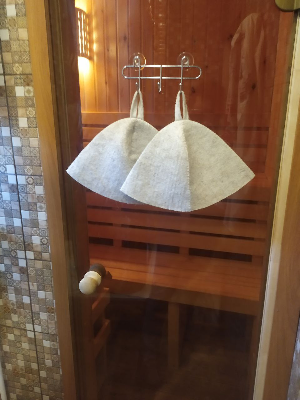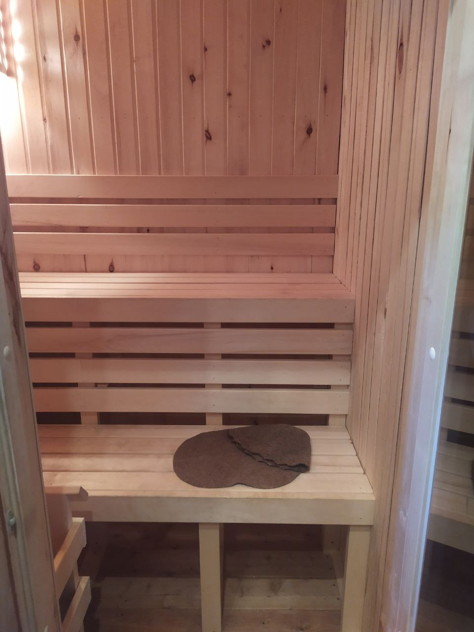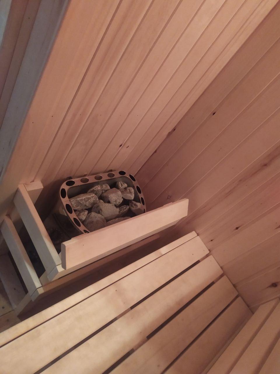 Двери: ДСП с пленкой 800 мм шириной. 1 стеклянная для сауны 700 мм шириной, 1 наружная, металлическая.