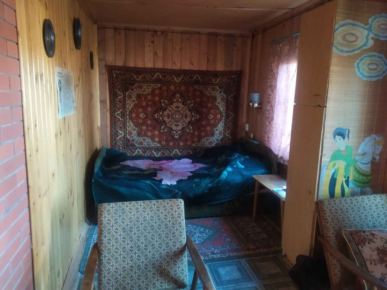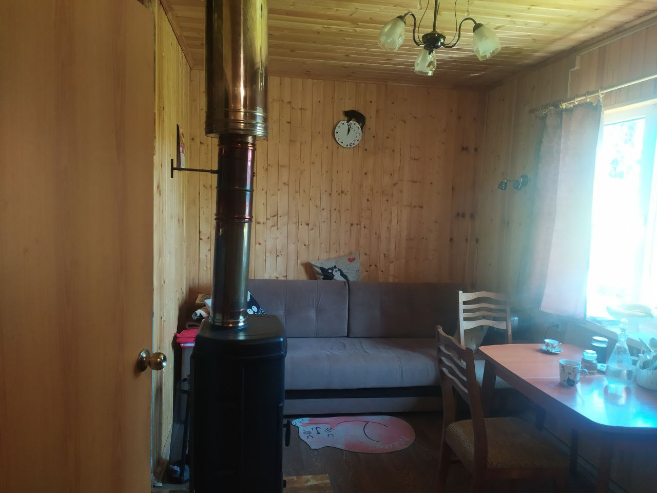 Печь новая, со стеклом, финский кирпич + стальная труба с середины мансарды. Дом на столбчатом фундаменте . Крыша - шифер. Второй этаж без отделки.