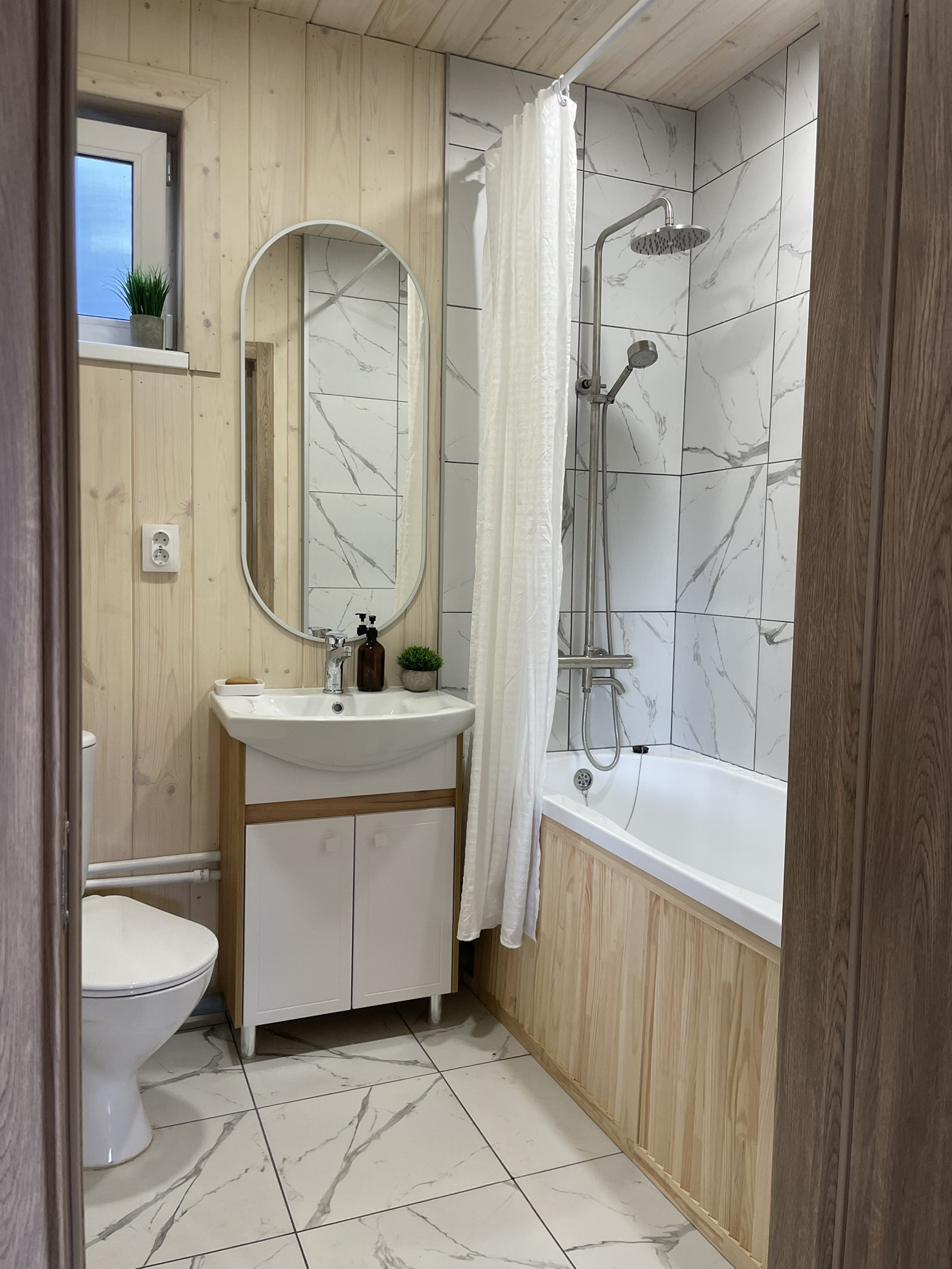 На первом этаже прихожая с теплым полом, кухня гостиная, санузел с ванной, кладовая/гардеробная, большая терраса (23 кв м).