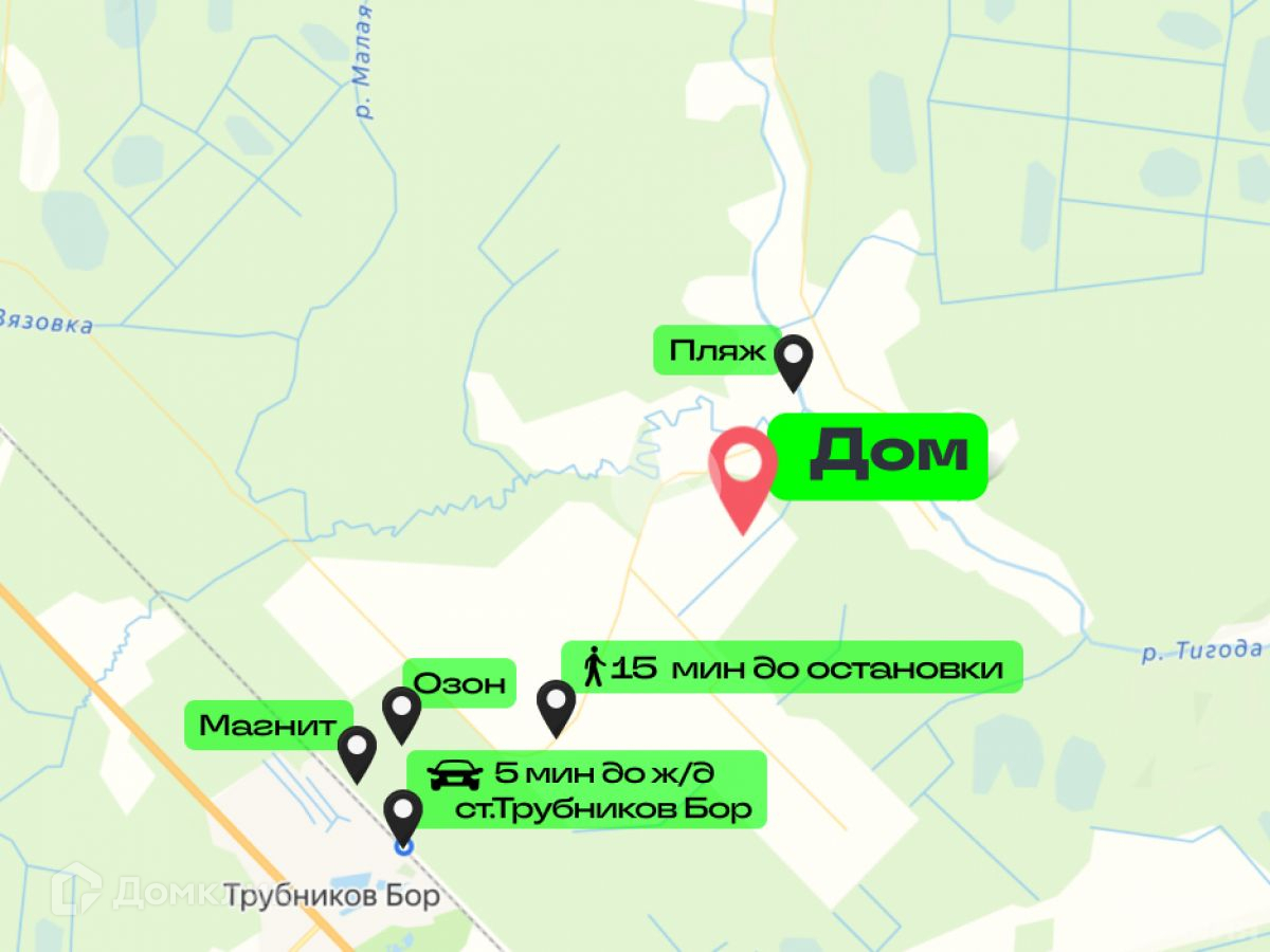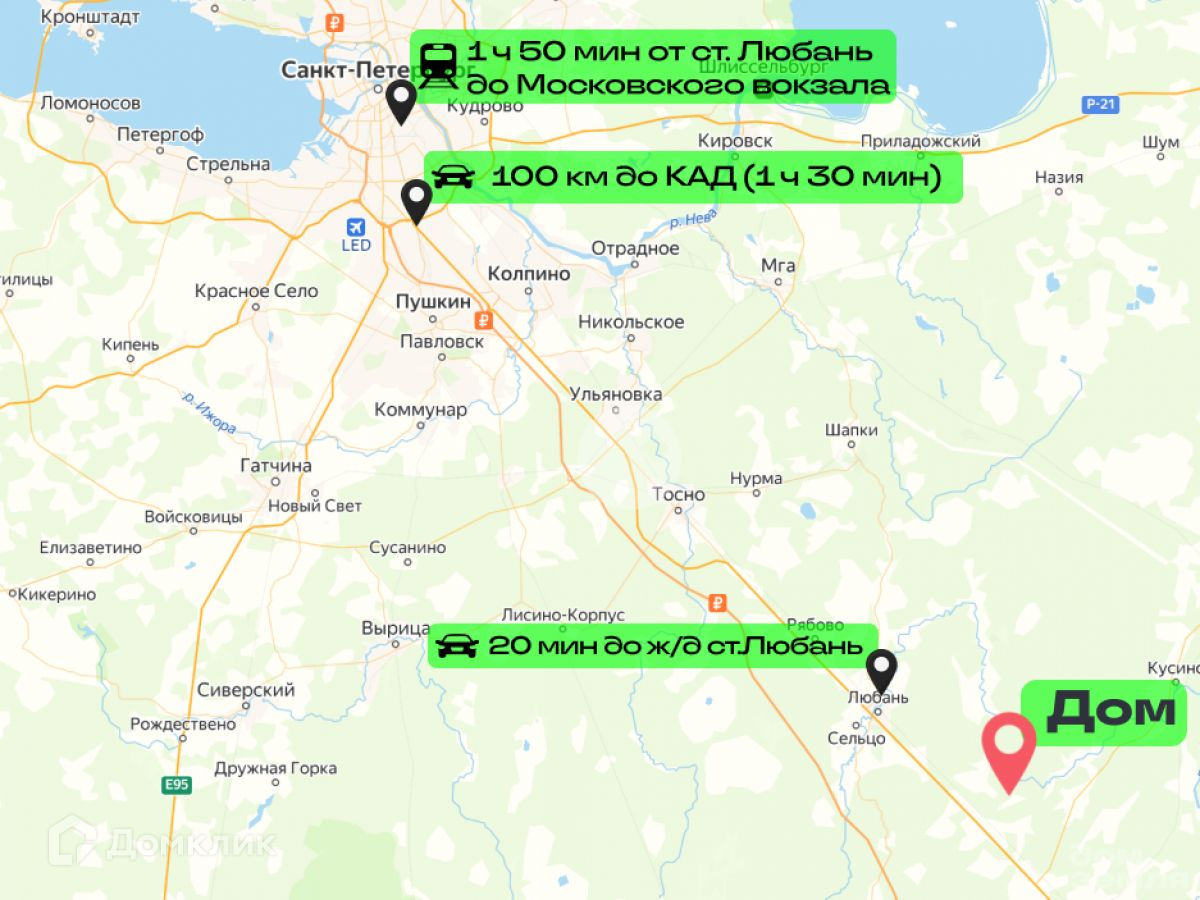 До Ж/Д станции Трубниково в сезон с апреля по октябрь курсирует автобус. Со станции ходит электричка, которая за 1 час 50 минут довезет Вас до Московского вокзала. До Ж/Д станции 15-20 минут прогулочным шагом. Также курсирует автобус до Любани, от Любани до Тосно и от Тосно до Санкт-Петербурга время в пути такое же, как на электричке.