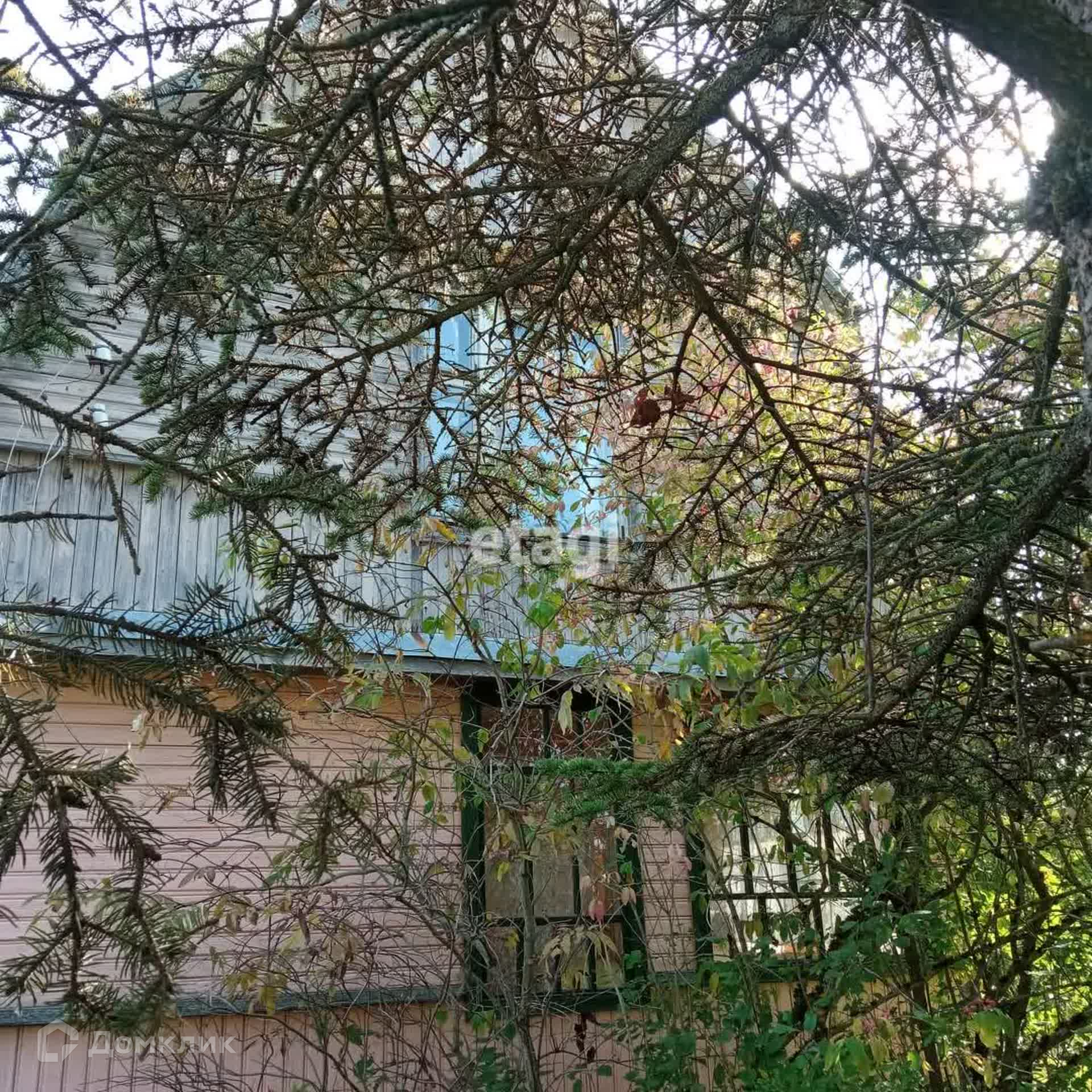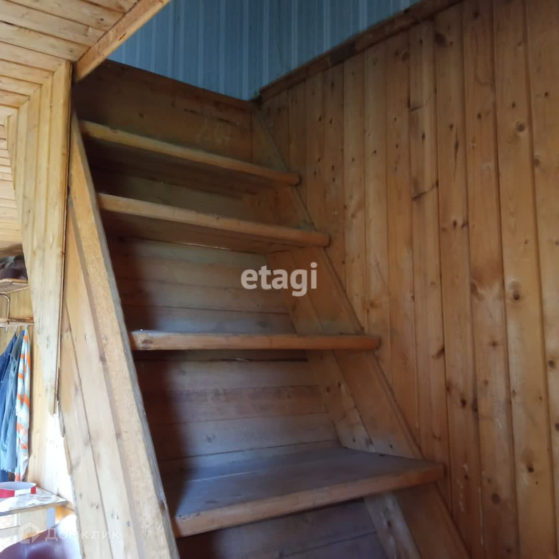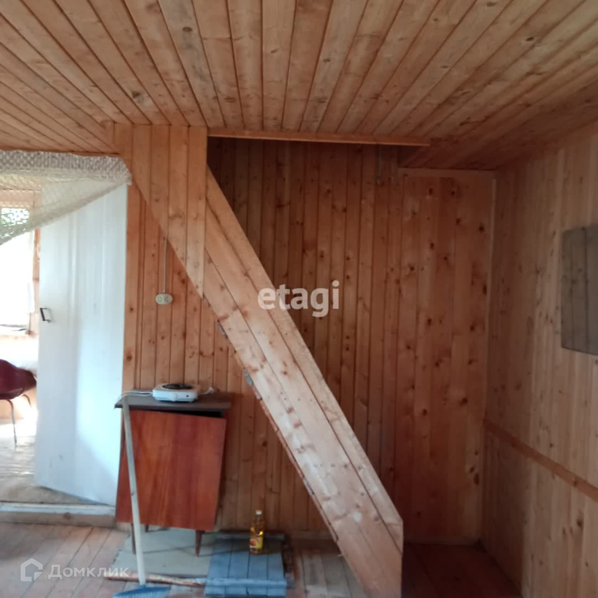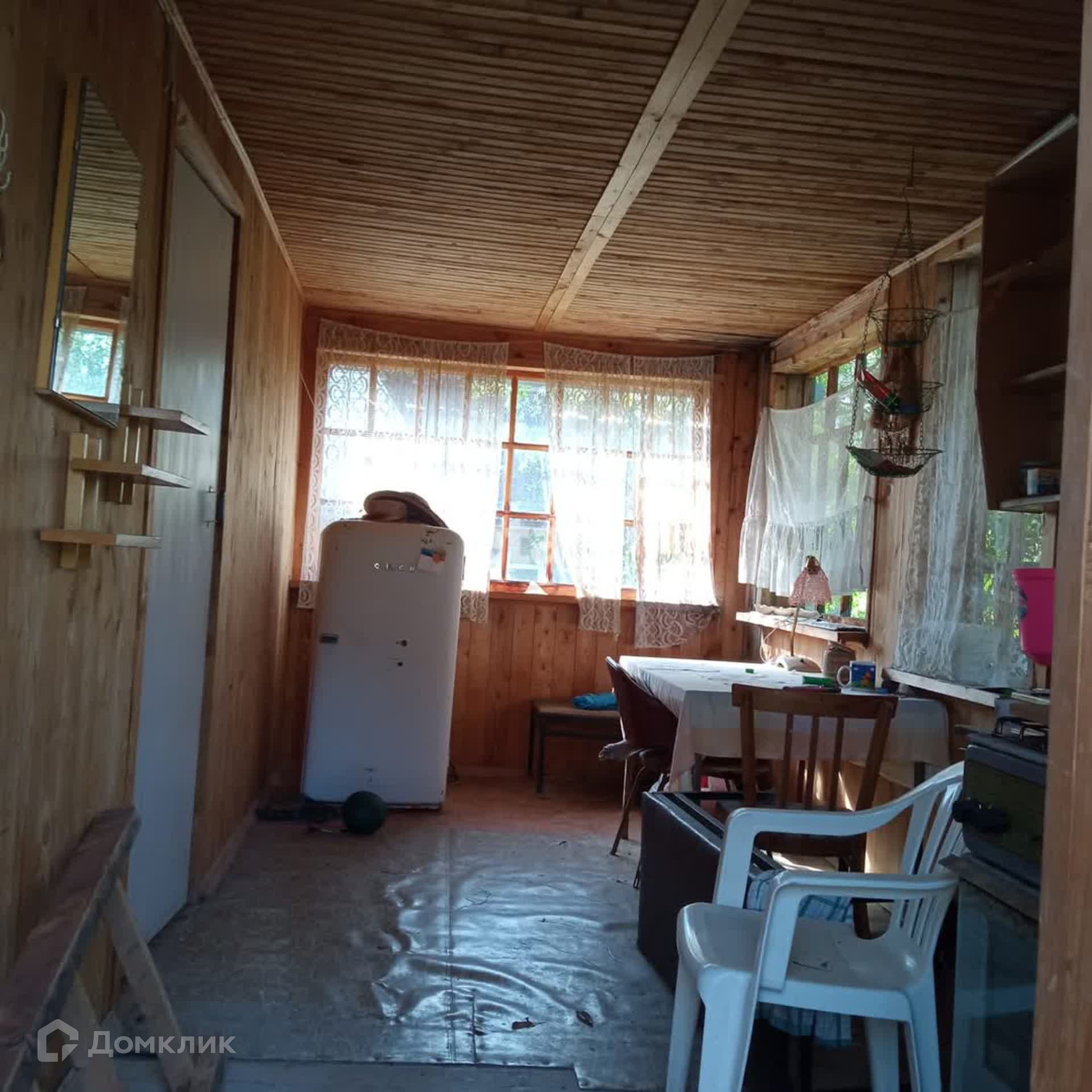 На продаже земельный участок с двухэтажным деревянным домом. Давно не использовался, но в хорошем состоянии. Невысокие потолки на первом этаже, крутая деревянная лестница наверх. На 2-м этаже треснутое окно. На первом этаже фундамент под печку. Есть чердак.