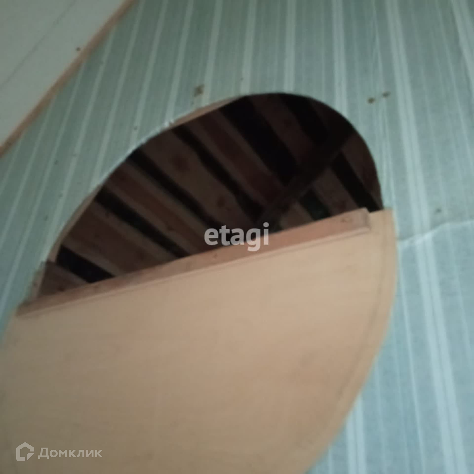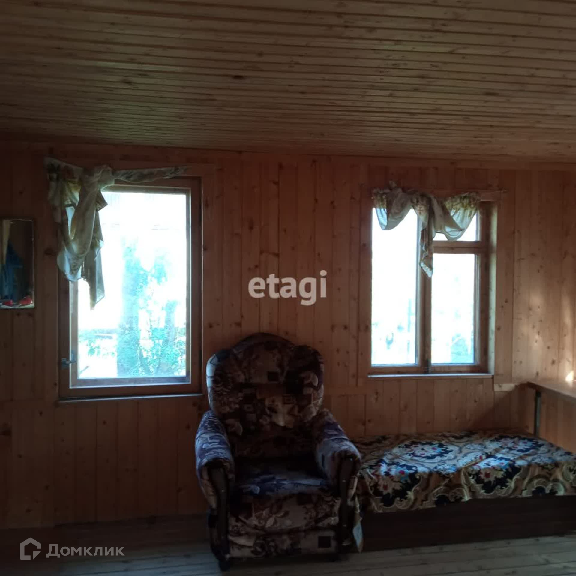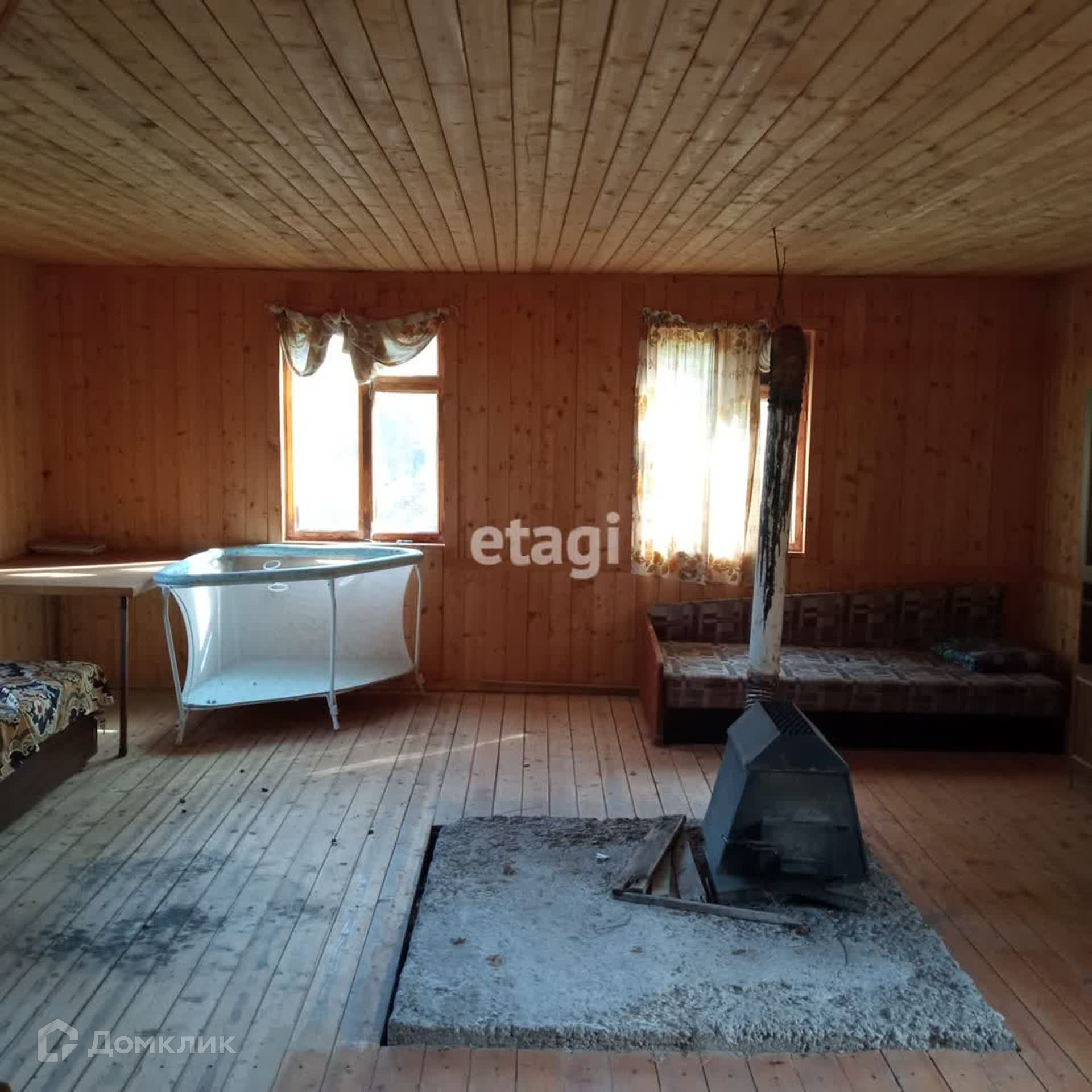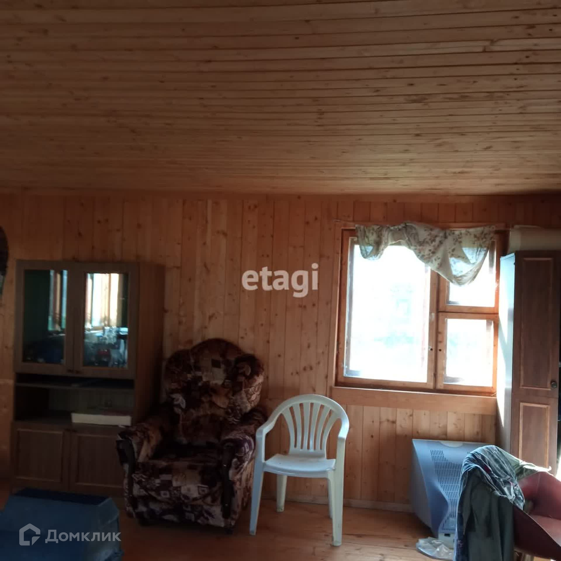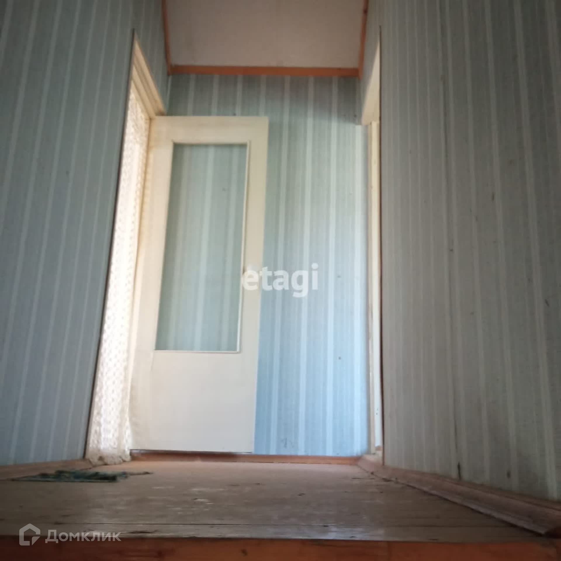 На продаже земельный участок с двухэтажным деревянным домом. Давно не использовался, но в хорошем состоянии. Невысокие потолки на первом этаже, крутая деревянная лестница наверх. На 2-м этаже треснутое окно. На первом этаже фундамент под печку. Есть чердак.