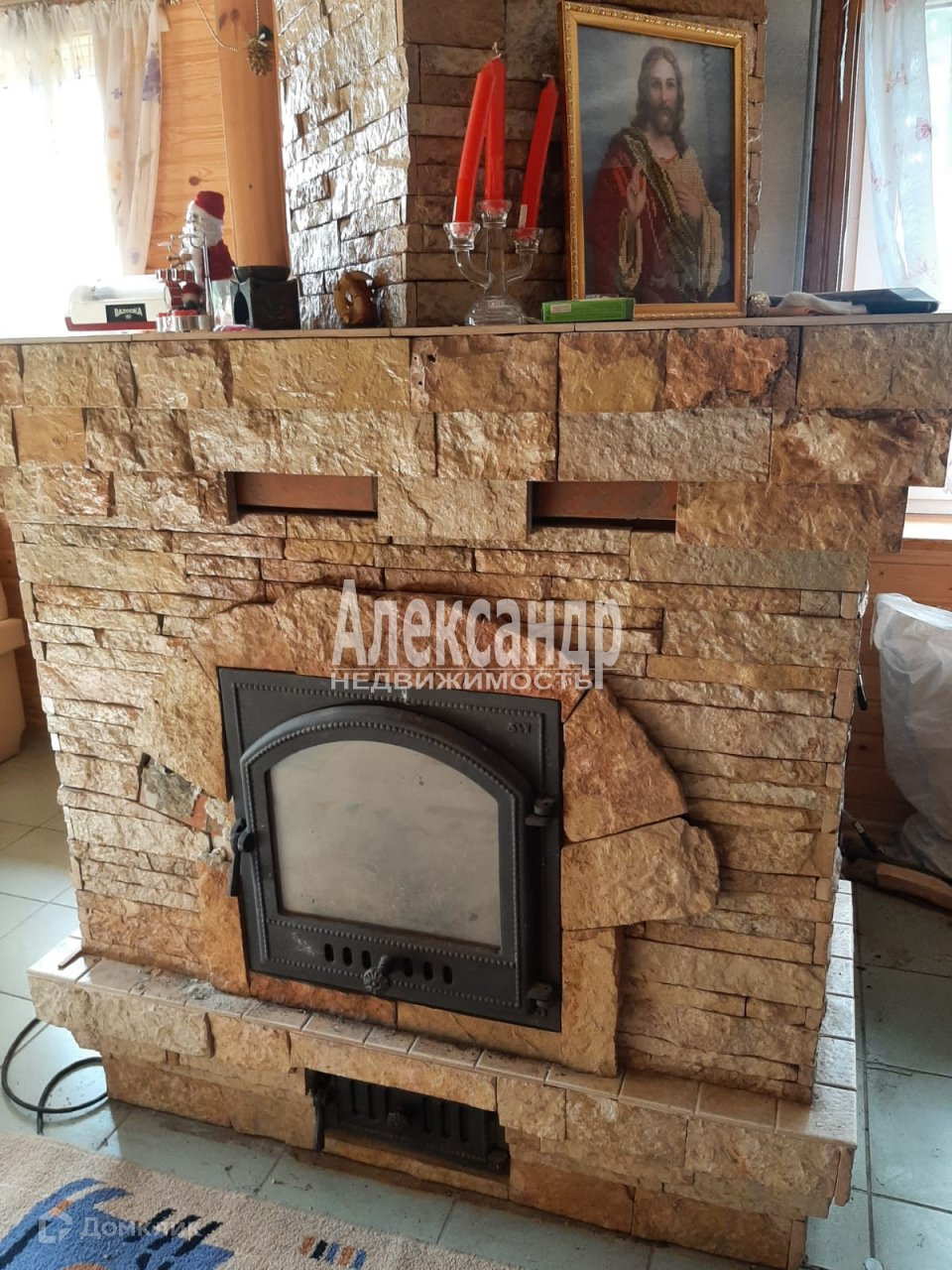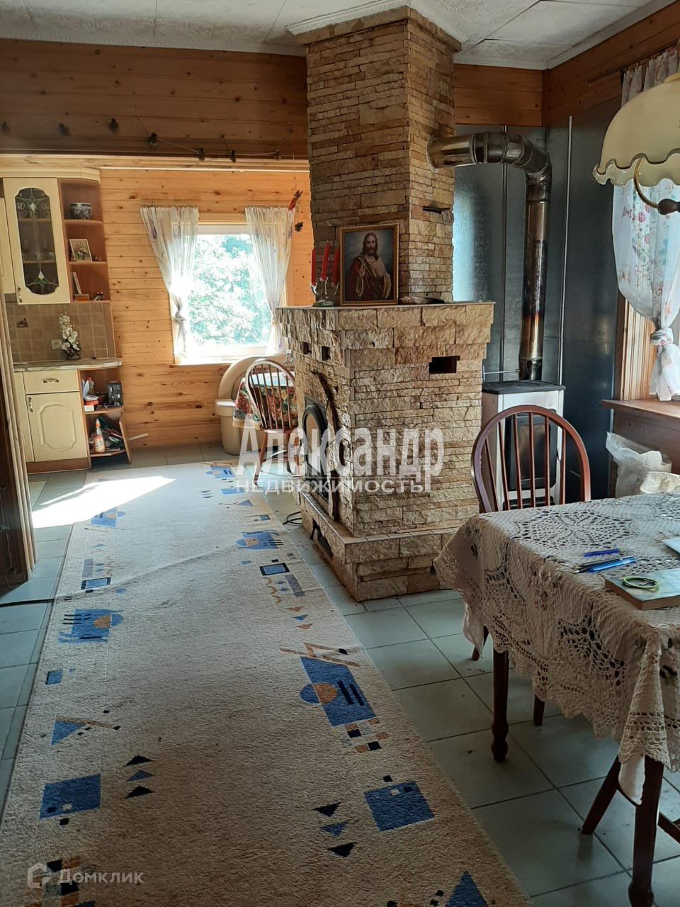 На первом этаже просторная гостинная с камином и печью, жилая комната и кухня.