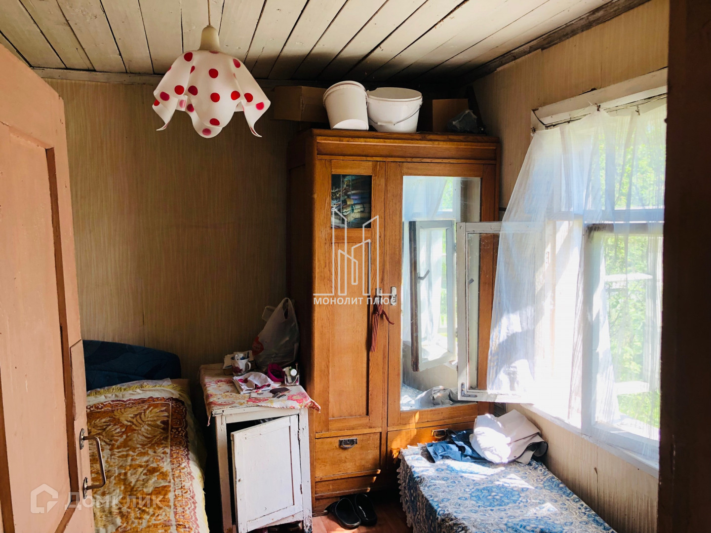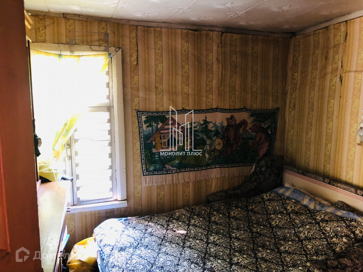 Дом построен из бруса, 1985гп. Фундамент – ж/б, крыша покрыта рубероидом, внутренняя отделка-обои.