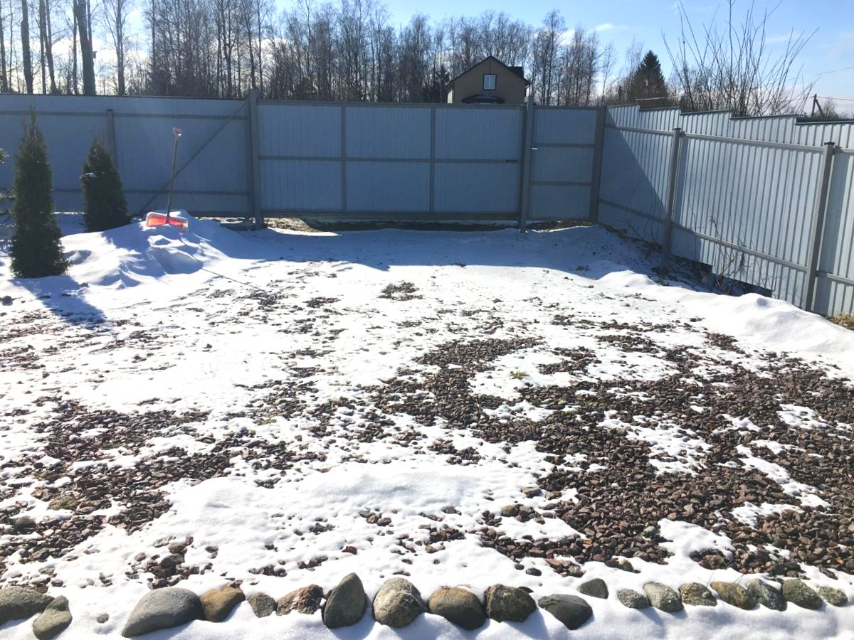 Участок 8 соток отмежеван.Сделан заезд и стоянка для нескольких авто( отсыпано мелким щебнем).По всему периметру огорожен забором (с трёх сторон- профлисты,с четвёртой стороны сетка),устновлены откатные ворота и отдельная калитка.Имеется небольшой хозблок для хранения садового инвентаря и инструментов.Зона барбекю с мангалом.На участке много декоративных растений,аккуратные клумбы.