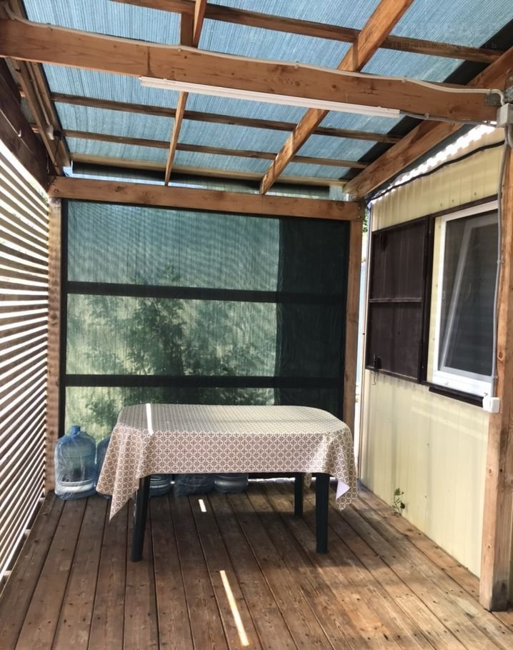Современный жилой модуль местного производства с террасой (15 м2 под светопрозрачной кровлей), оборудованный для комфортного проживания, электричество (3 фазы), вода (скважина) и канализация (септик).