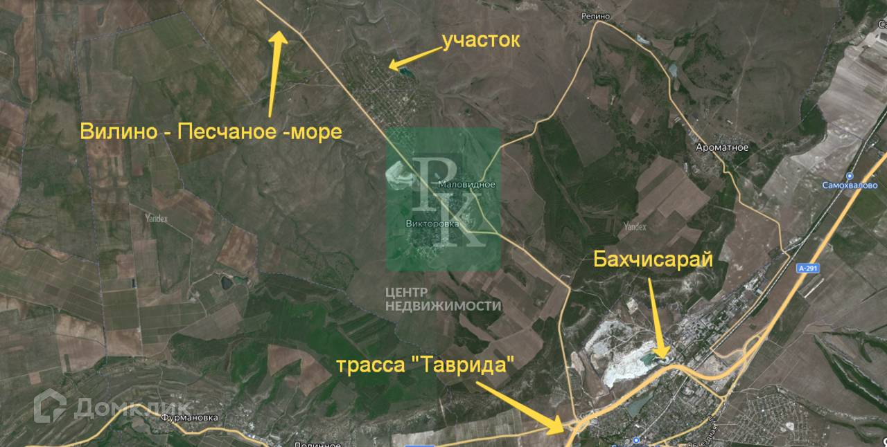 Участок находится в 2-х км от села Маловидное, где построена новая современная школа, есть детский сад, магазины и все что необходимо для комфортного проживания, а в 10 минутах от Викторовки - районный центр г. Бахчисарай. В 15 минутах езды на автомобиле - пляжи поселка Береговое и Песчаное. До остановки общественного транспорта - 800 метров.
