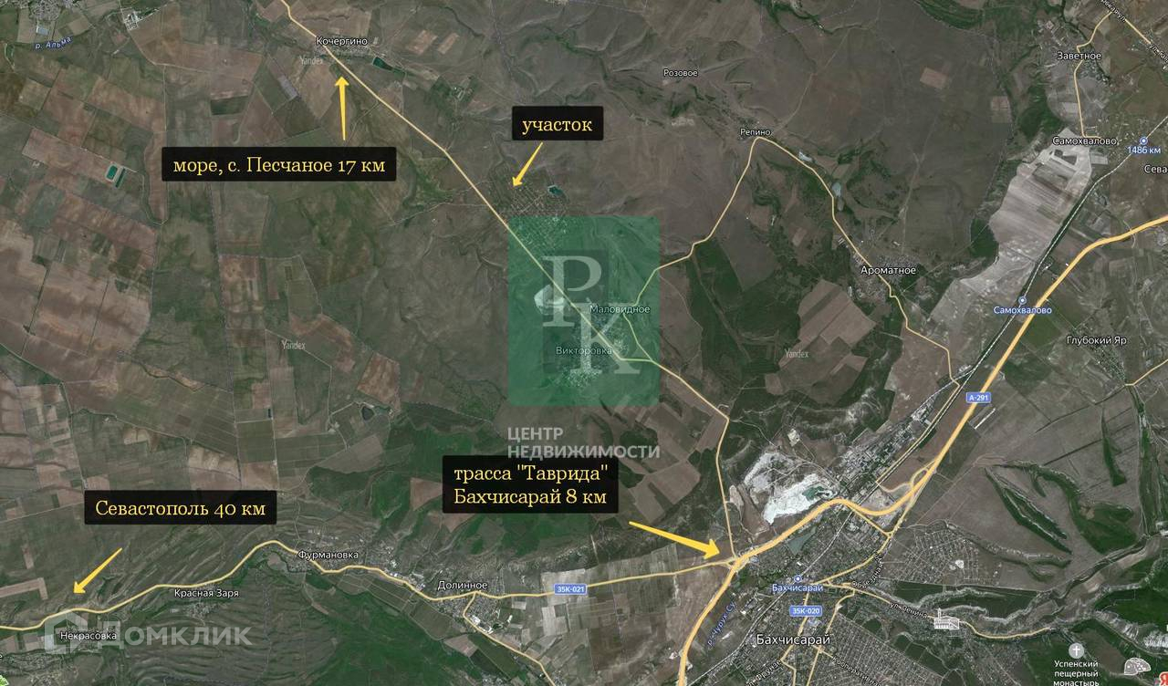 Участок находится в 2-х км от села Маловидное, где построена новая современная школа, есть детский сад, магазины и все что необходимо для комфортного проживания, а в 10 минутах от Викторовки - районный центр г. Бахчисарай. В 15 минутах езды на автомобиле - пляжи поселка Береговое и Песчаное. До остановки общественного транспорта - 500 метров.