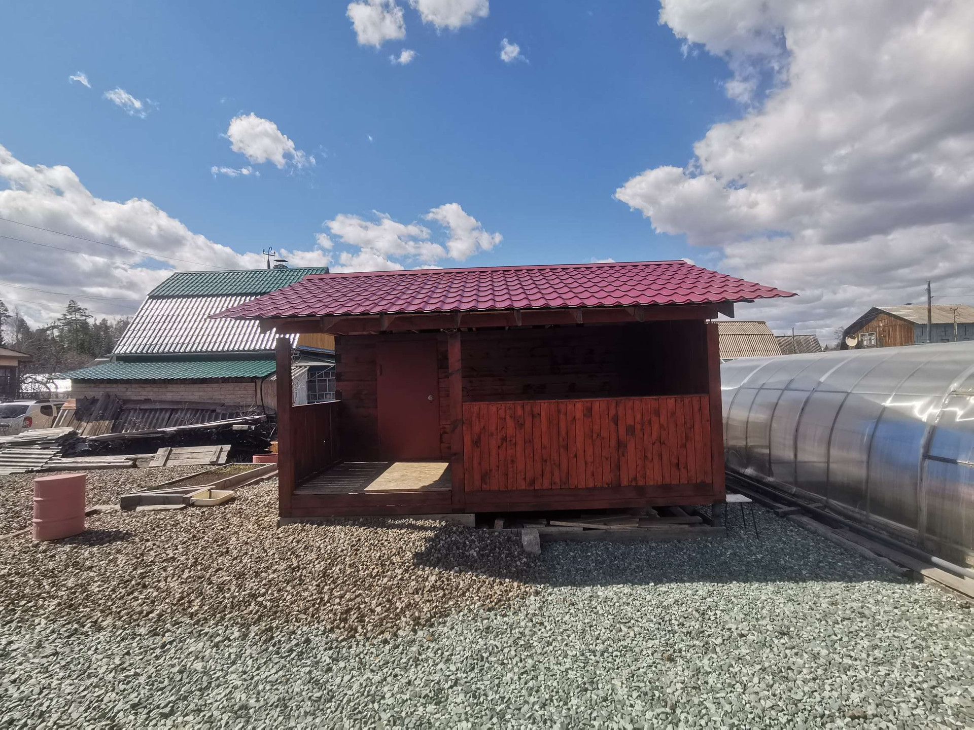 На участке в 2019 году построена баня с верандой из бруса, размером 5\5 метров на свайно- винтовом фундаменте, кровля- металлочерепица, без печи и внутренней отделки.