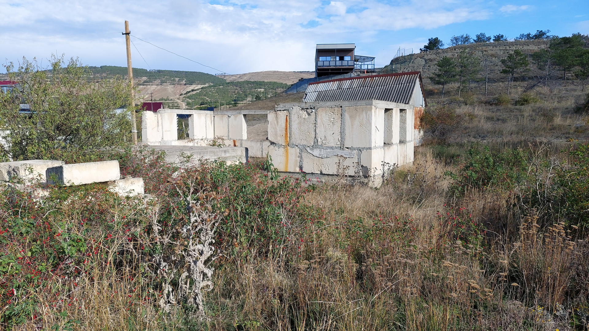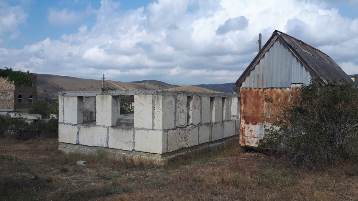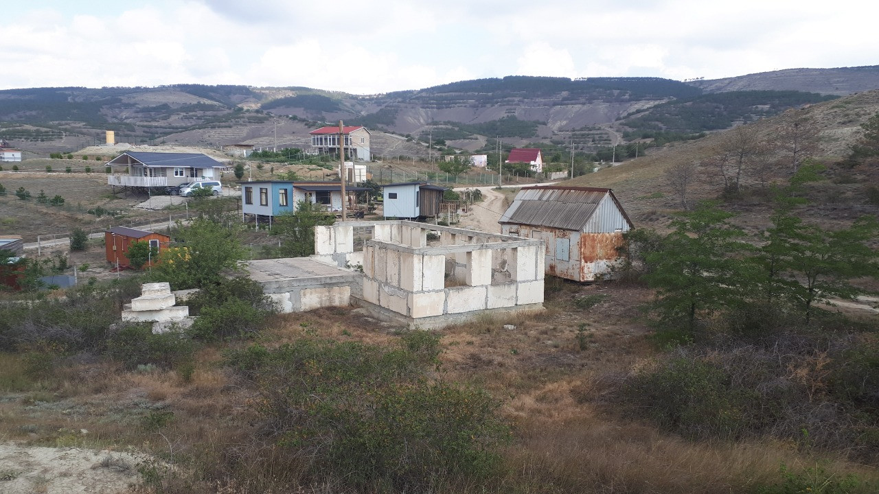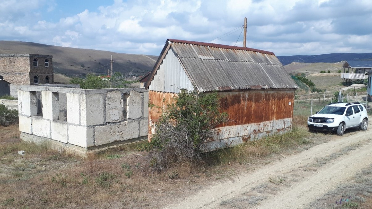 На участке находится фундамент и коробка стен 1-го этажа из блоков (Альминский камень), также есть небольшой домик-вагончик для хозяйственных нужд или временного проживания.