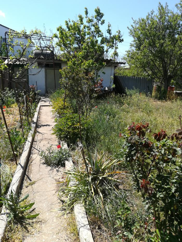 Продается дом-дача в пригороде Евпатории, в 10ти км до центра города. Участок 8 соток. Общ. пл. дома 65 кв.м. В доме 1 большая комната 40 кв.м. и коридор 15 кв.м. Состояние дома хорошее, можно проживать. В цоколе дома- гараж, вместимостью одного легкового авто и подвал. Коммуникации: электричество и водоснабжение (централизованное) В собственности два смежных участка по 4 сотки. Документы готовы к сделке. . Госакт.  Код объекта 93802.