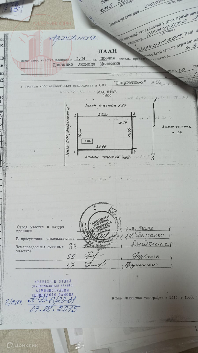 Участок, 4сот , категория земель-земли населенных пунктов, назначение-садоводство. Размер 25х16м, нормальные подъездные пути, жилой массив, лесная посадка, озеро, востребованное место для строительства дома. Из коммуникаций свет, вода, инет. Летом дачи в этом месте сдаются в аренду. Азовское песчаное побережье было и остается излюбленным местом для отдыха с детьми.