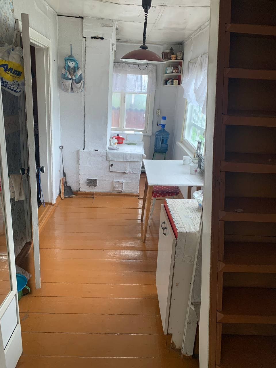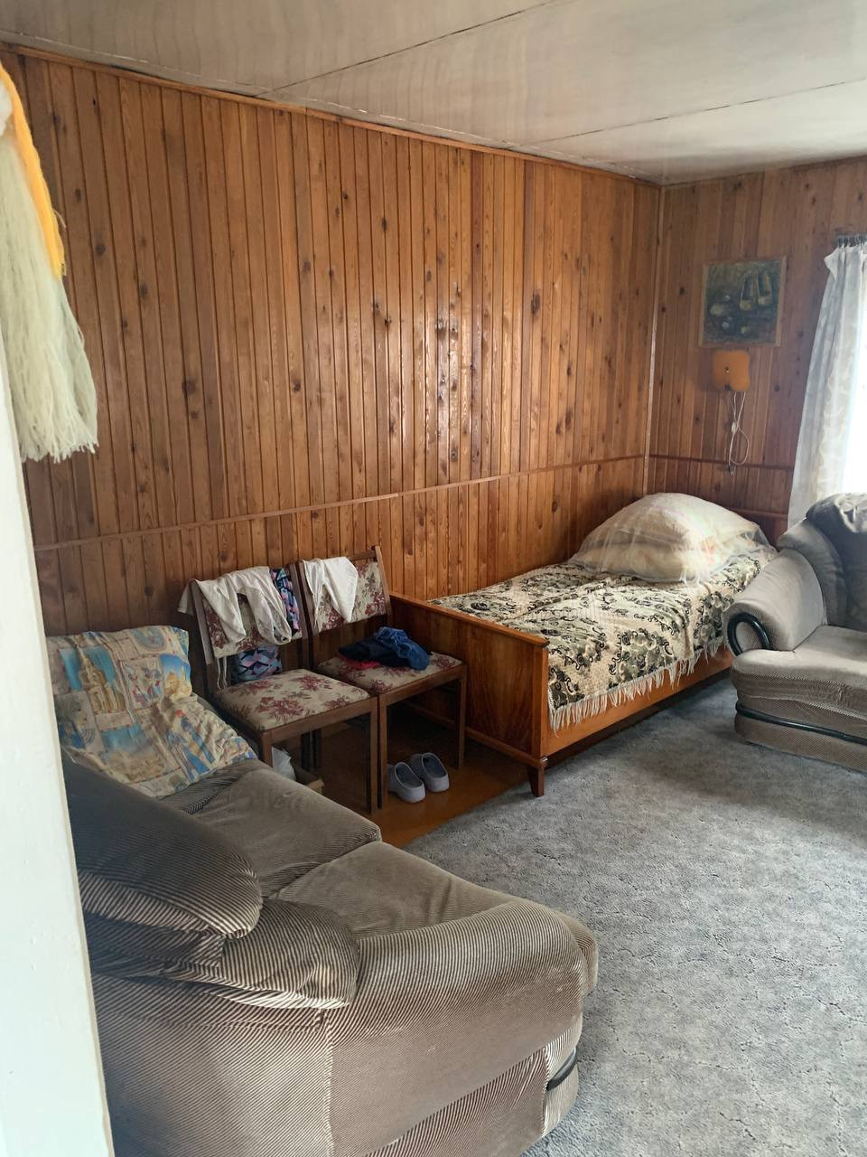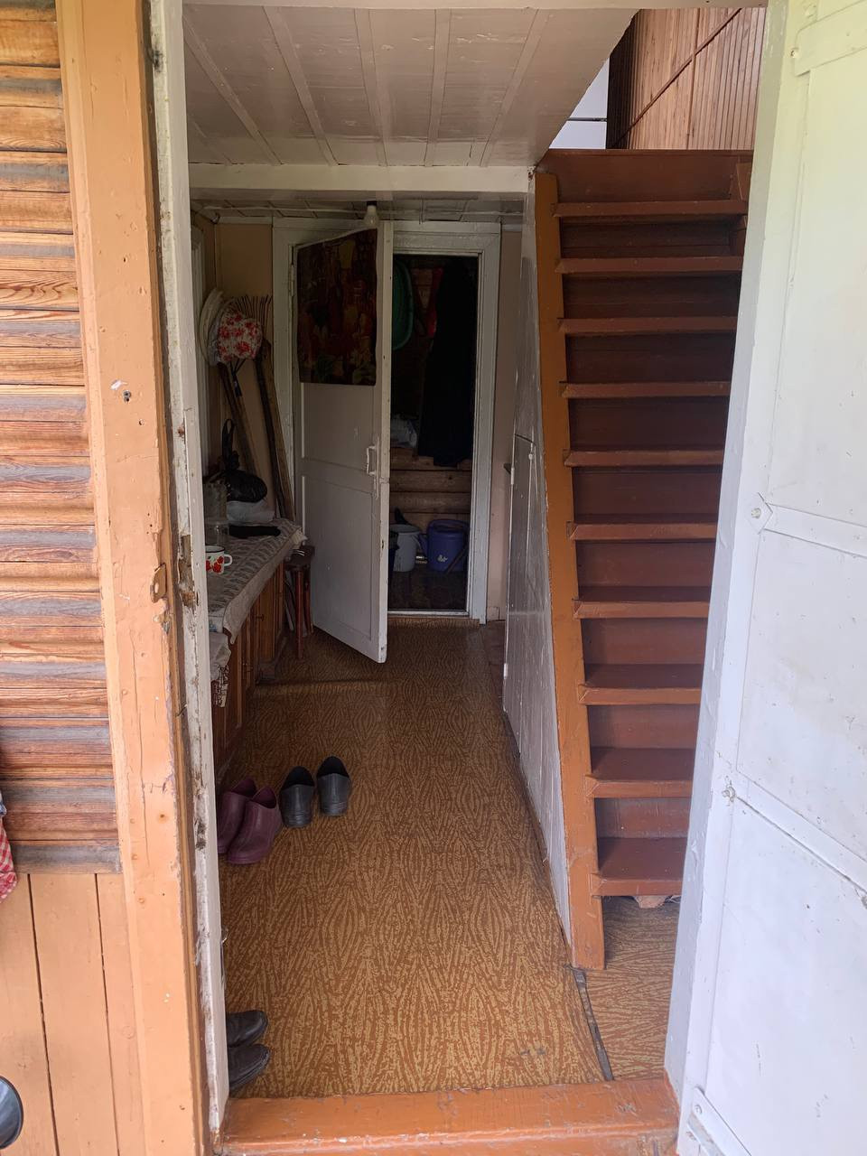 Дом щитовой советской постройки. Общая площадь дома 60 кВ.м. Достаточно теплый для проживания с апреля по октябрь. Нижний этаж дома - гараж для автомобиля и места хранения с погребом. Над ним два верхних этажа с верандой на втором и балконом на третьем. На втором этаже большая отличная дровяная печь с духовкой. Есть летний водопровод, но вода в дом не заведена.