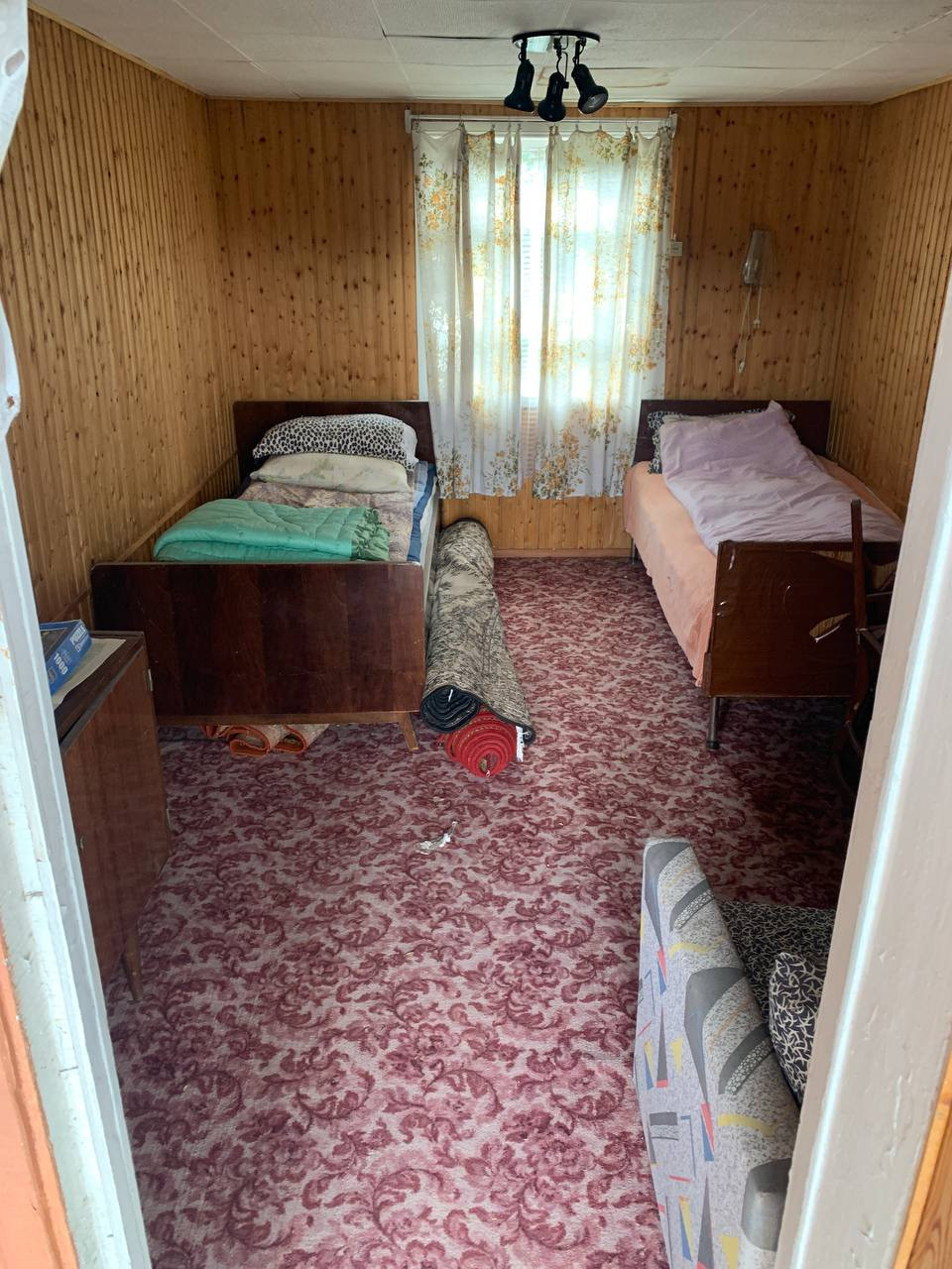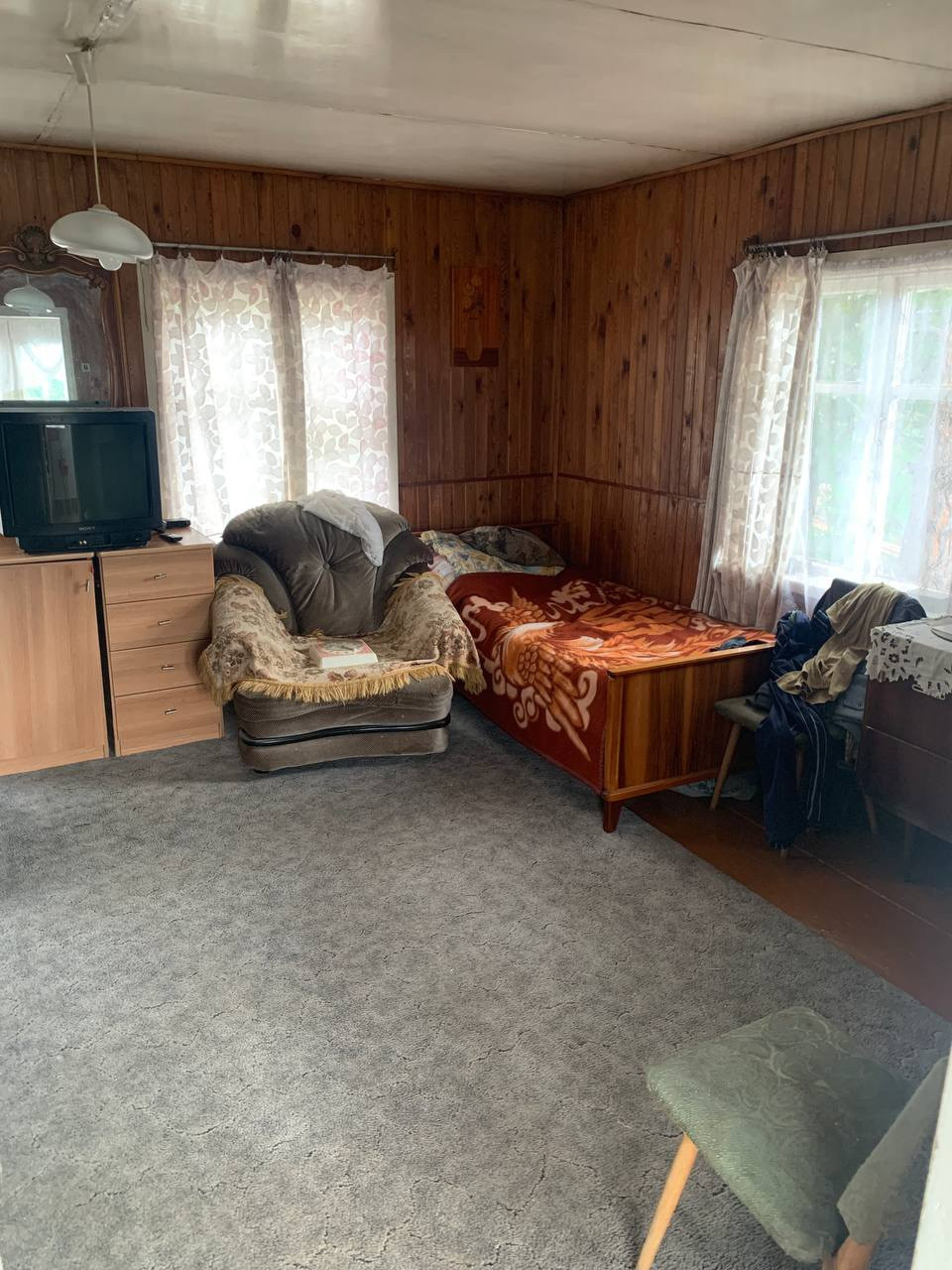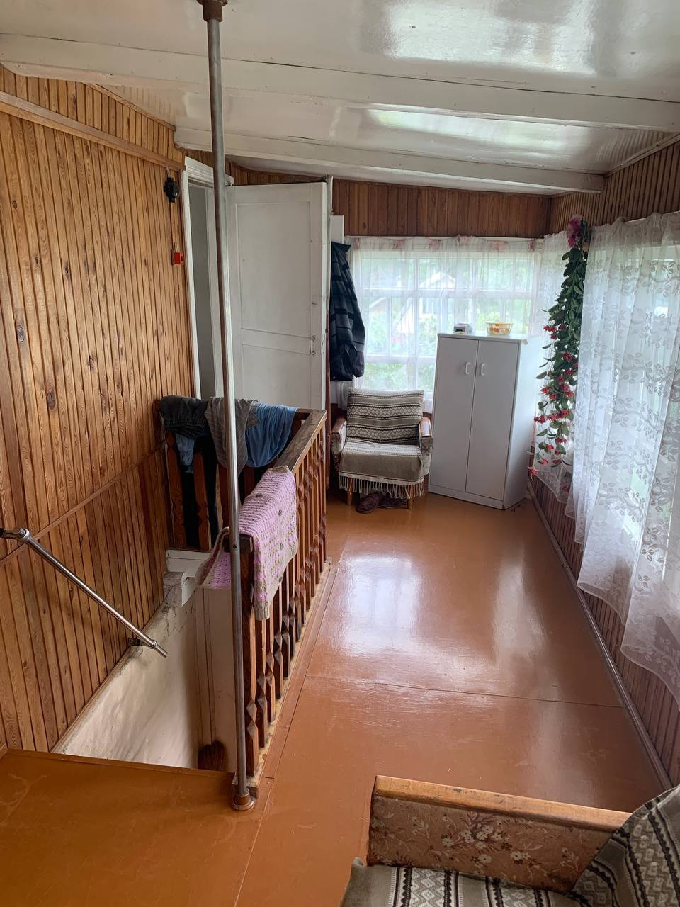 Дом щитовой советской постройки. Общая площадь дома 60 кВ.м. Достаточно теплый для проживания с апреля по октябрь. Нижний этаж дома - гараж для автомобиля и места хранения с погребом. Над ним два верхних этажа с верандой на втором и балконом на третьем. На втором этаже большая отличная дровяная печь с духовкой. Есть летний водопровод, но вода в дом не заведена.