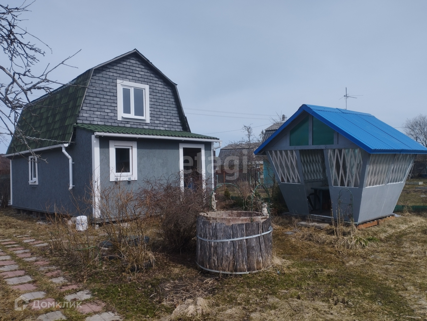 На участке стоит дом из бревна, душевая, хозблок, беседка, колодец.