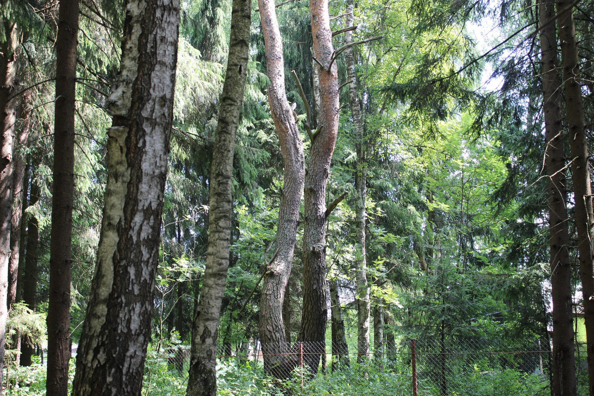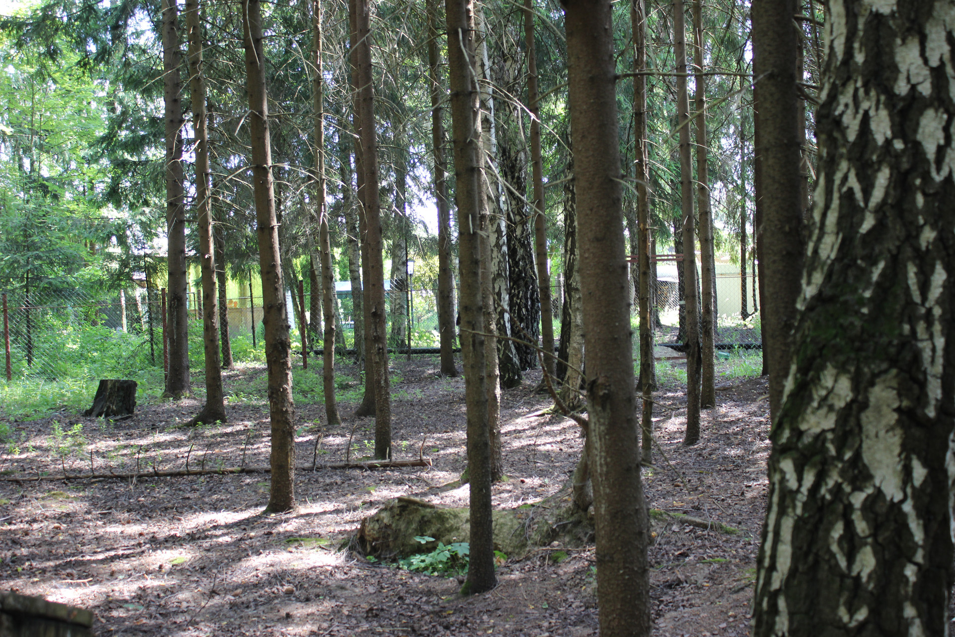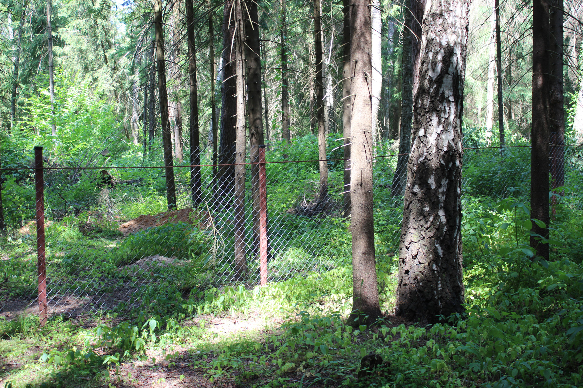 Участок правильной прямоугольной формы. С трех сторон огорожен сеткой рабица. На участке растут лиственные и хвойные деревья. Соседи с 3-х сторон, с 4-й стороны лес.