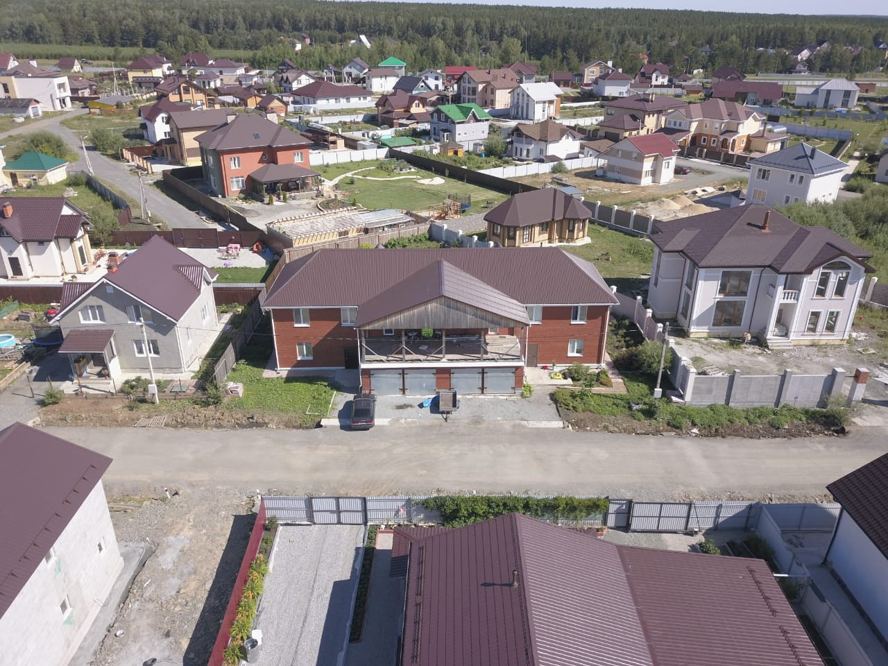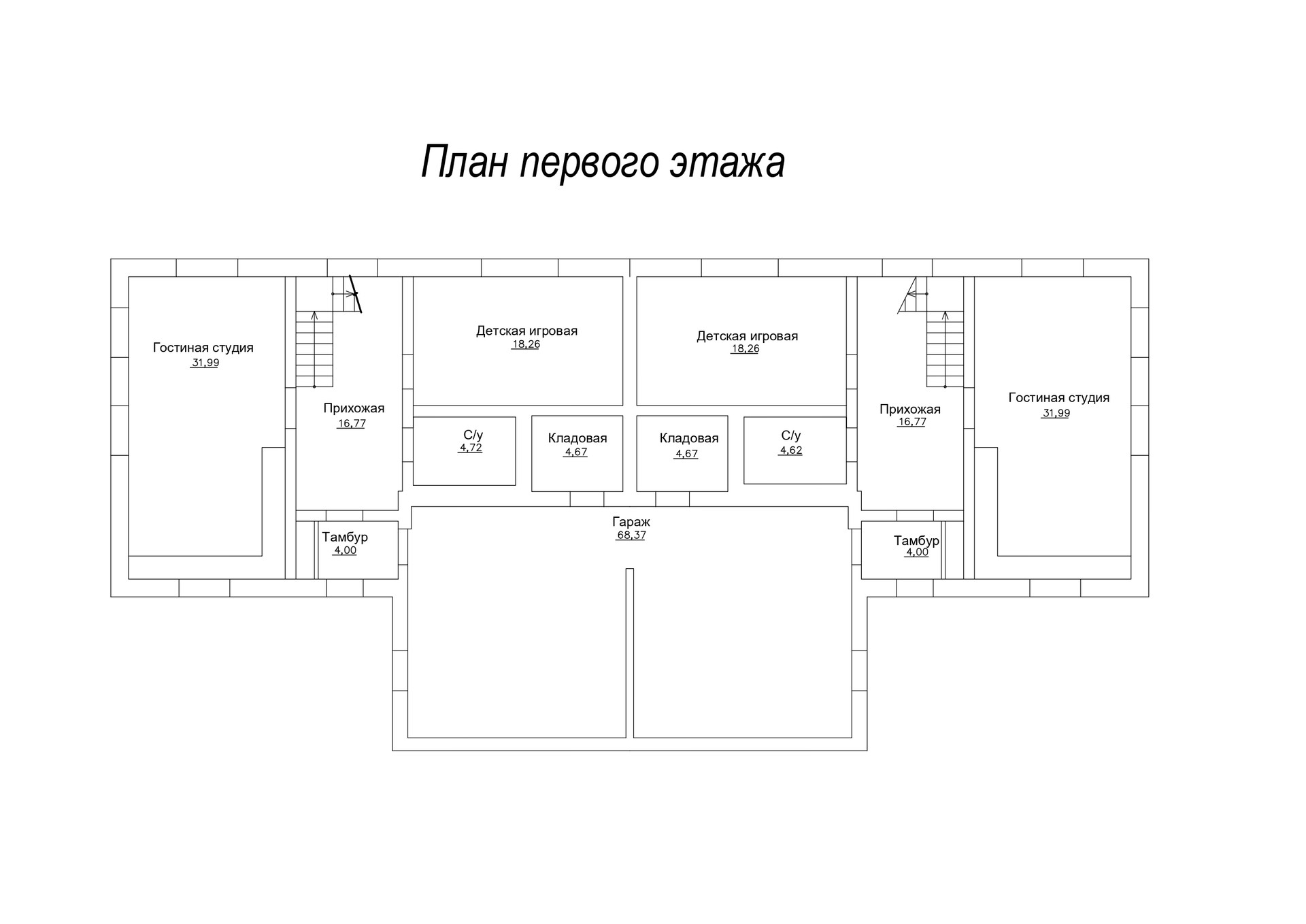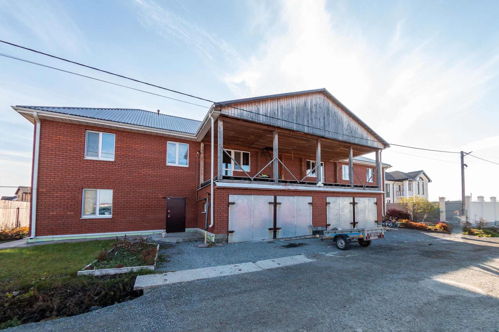 Дом состоит и 2 независимых одинаковых частей с двумя гаражами на 2 авто в каждом.