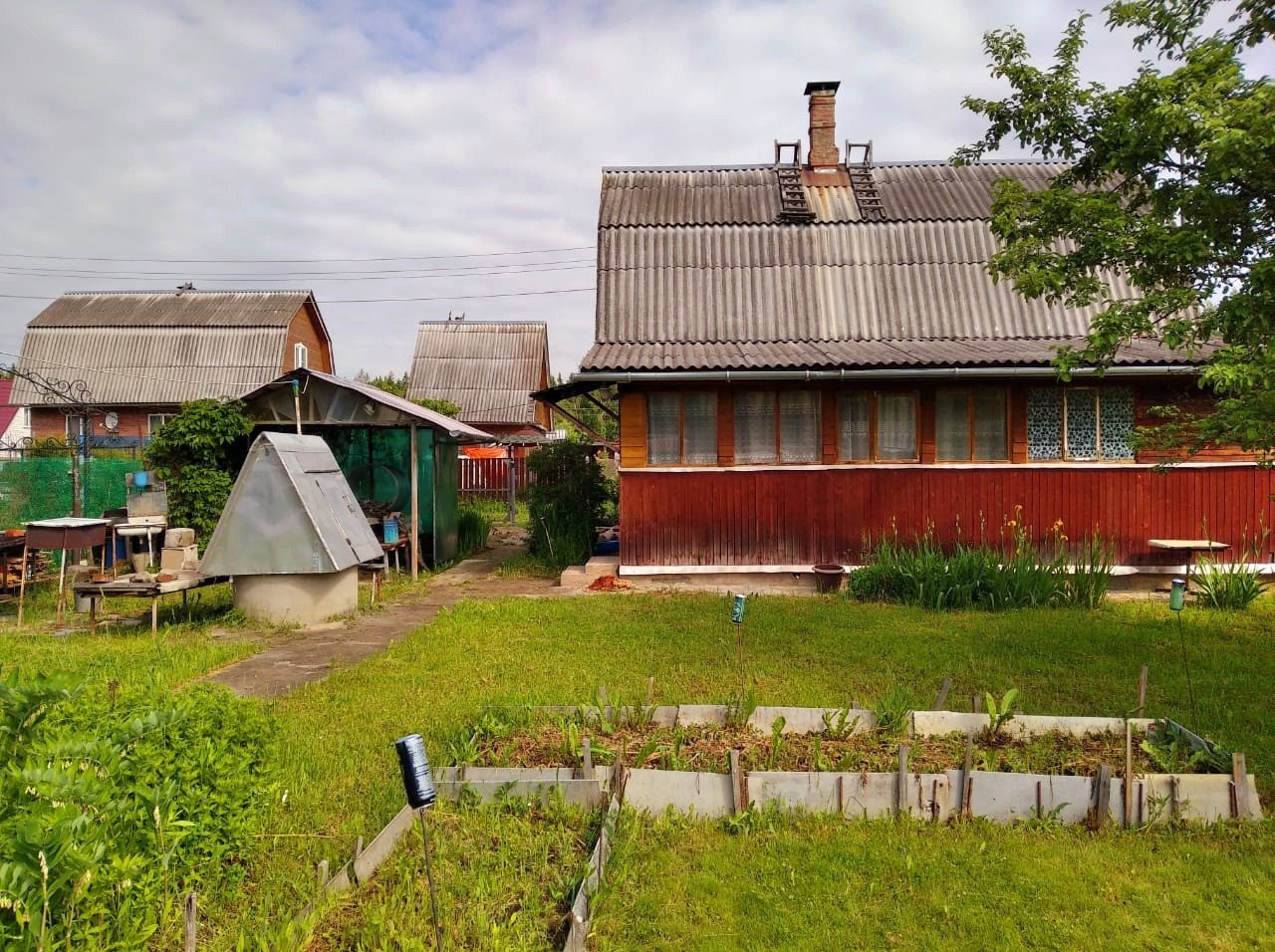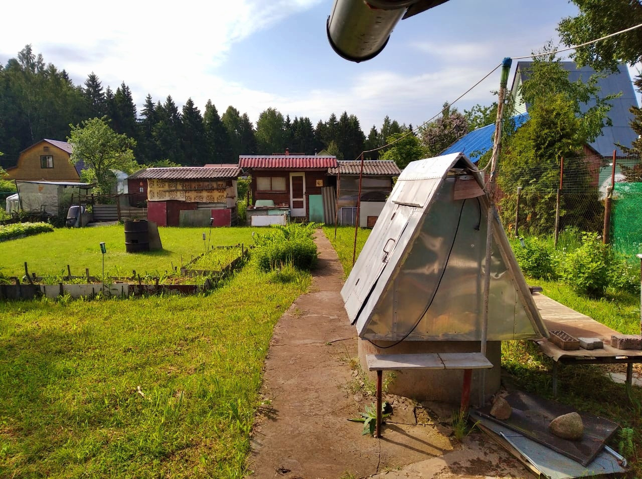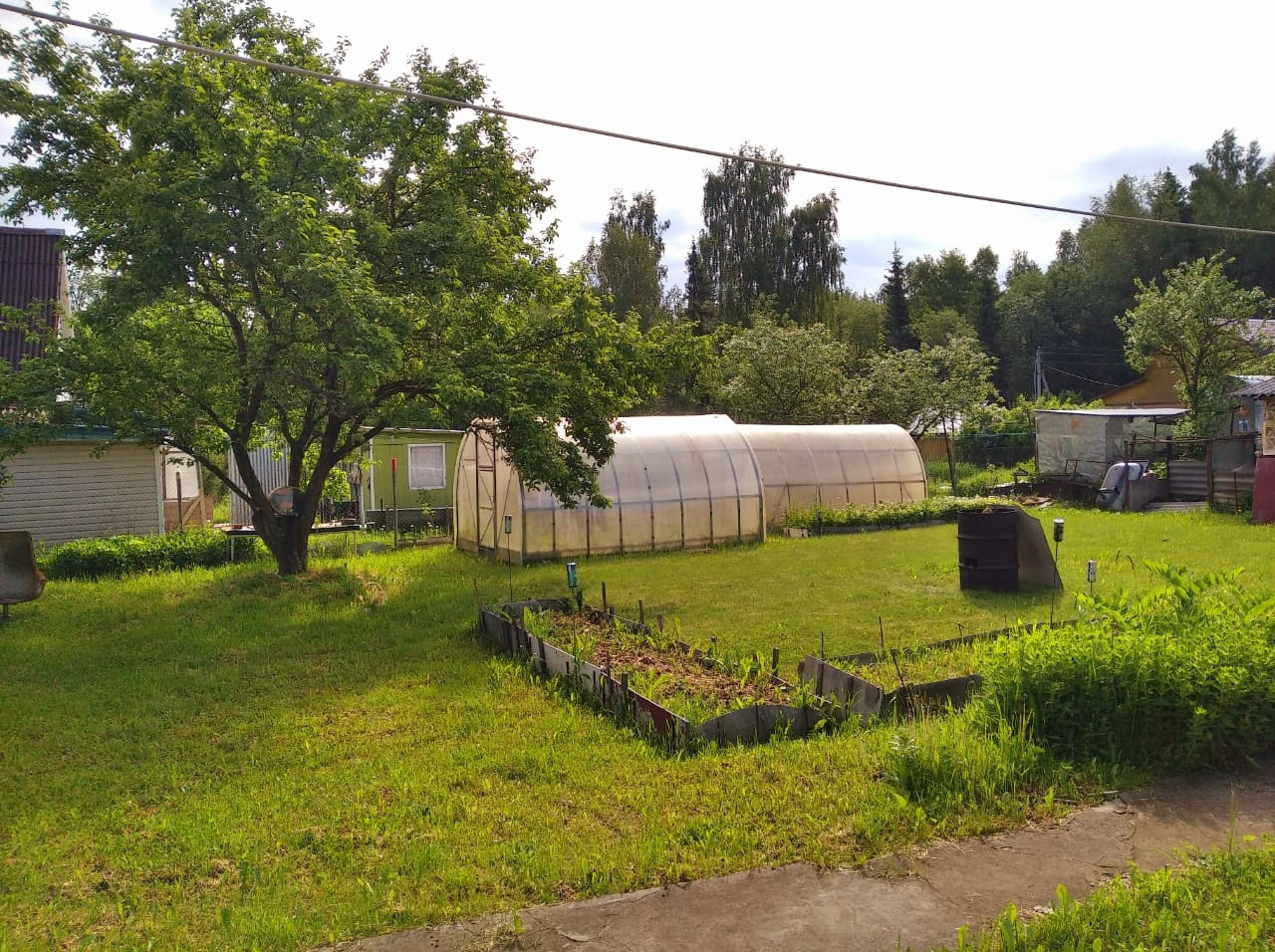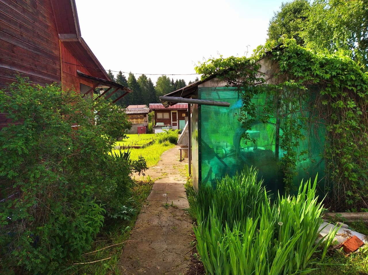 Около дома есть беседка, две теплицы, сарай, летний домик, навес для дров.