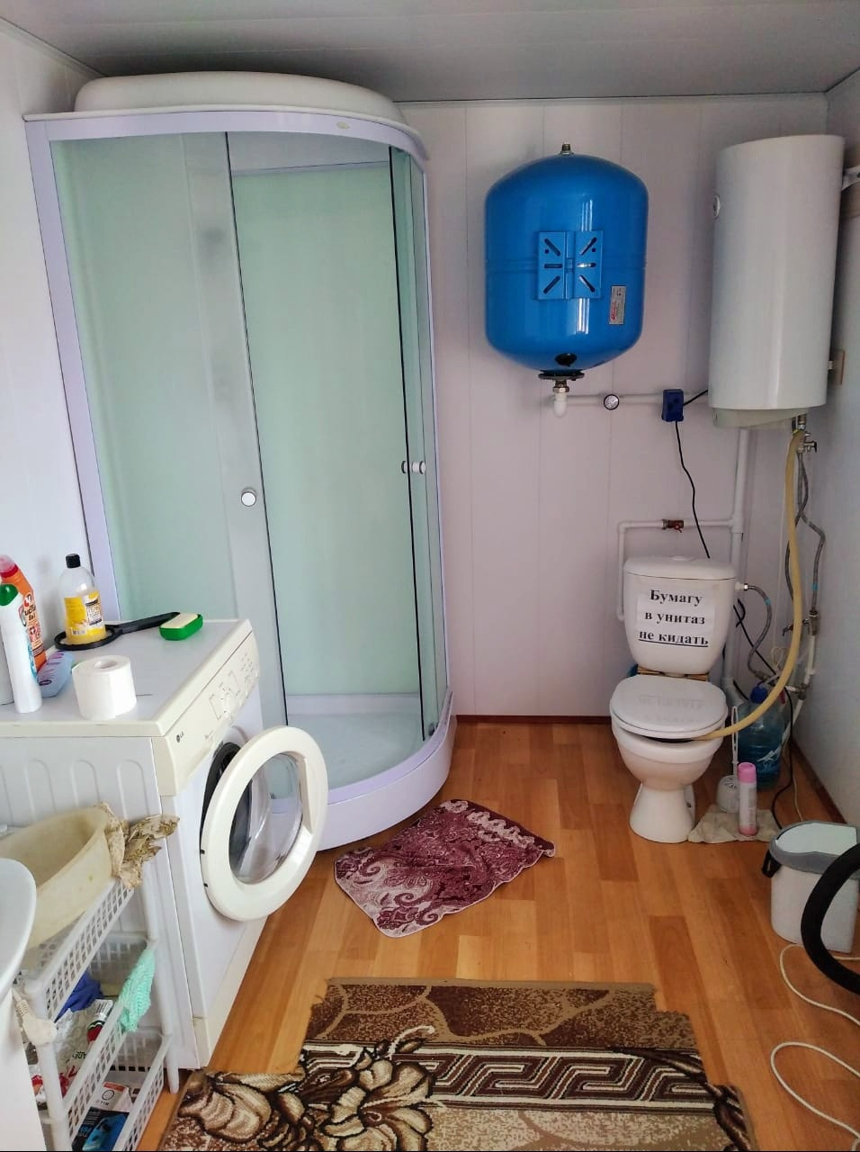 душевая кабина, туалет, стиральная машина, раковина, бойлер для горячей воды.