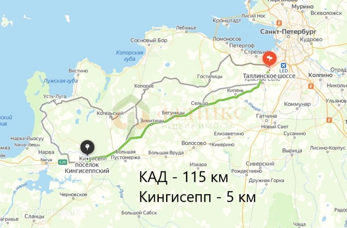 До г. Кингисепп - 5 км. Там же - ЖД станция Кингисепп (Балтийское направление)