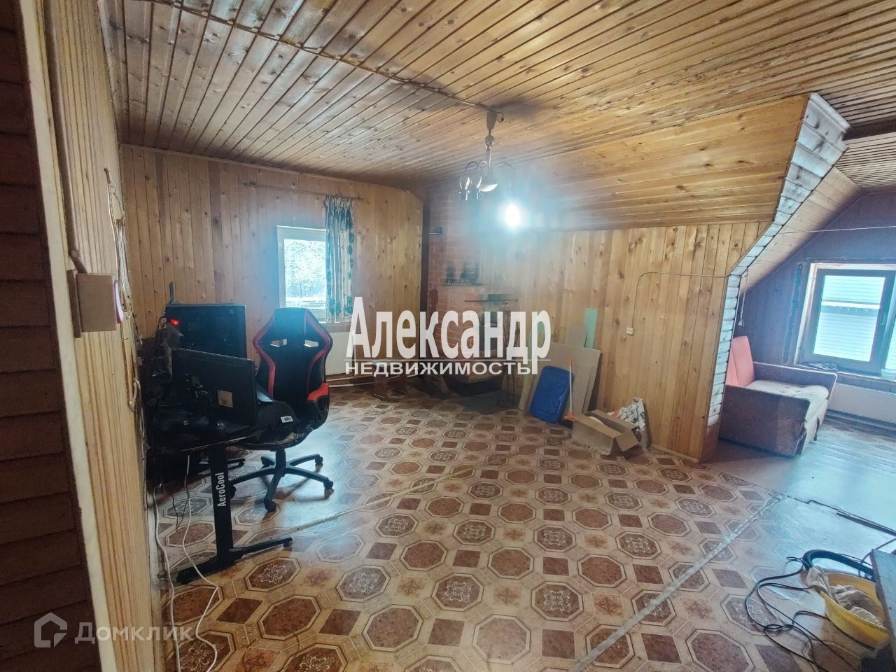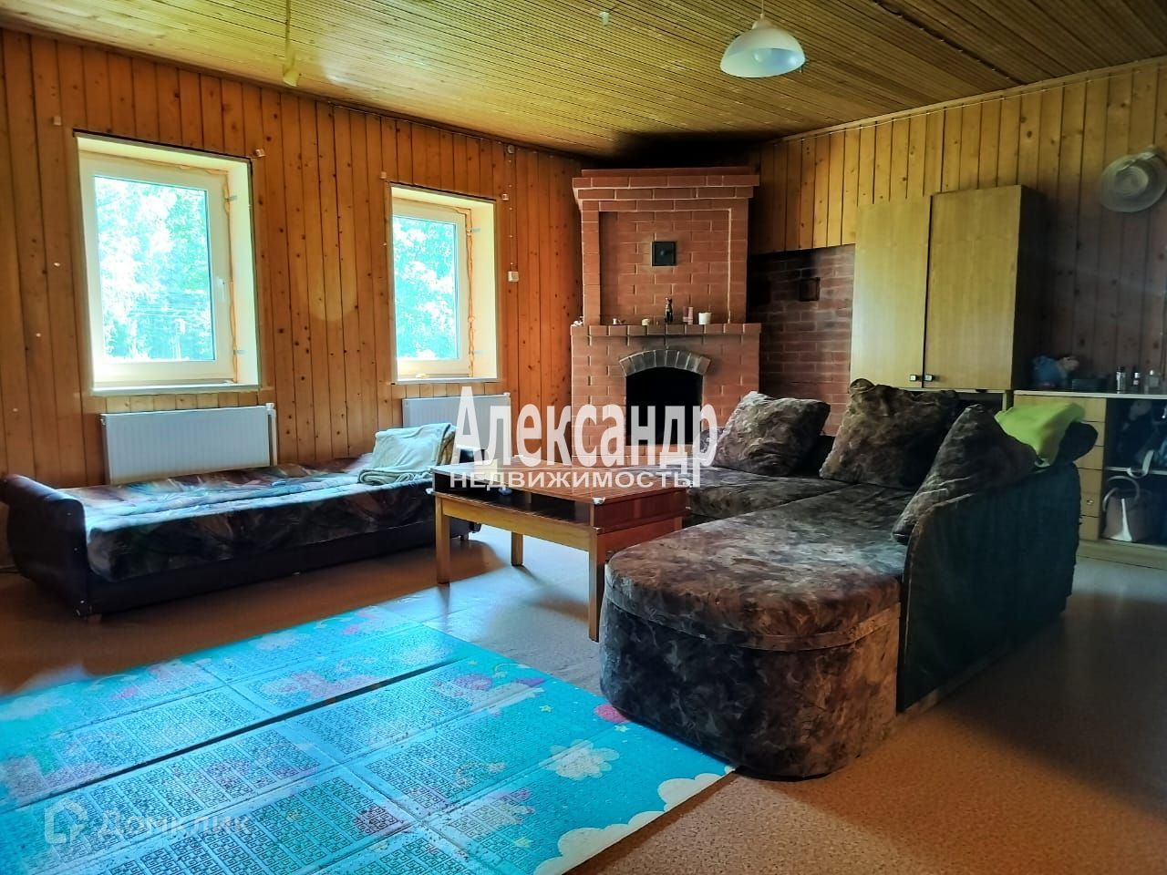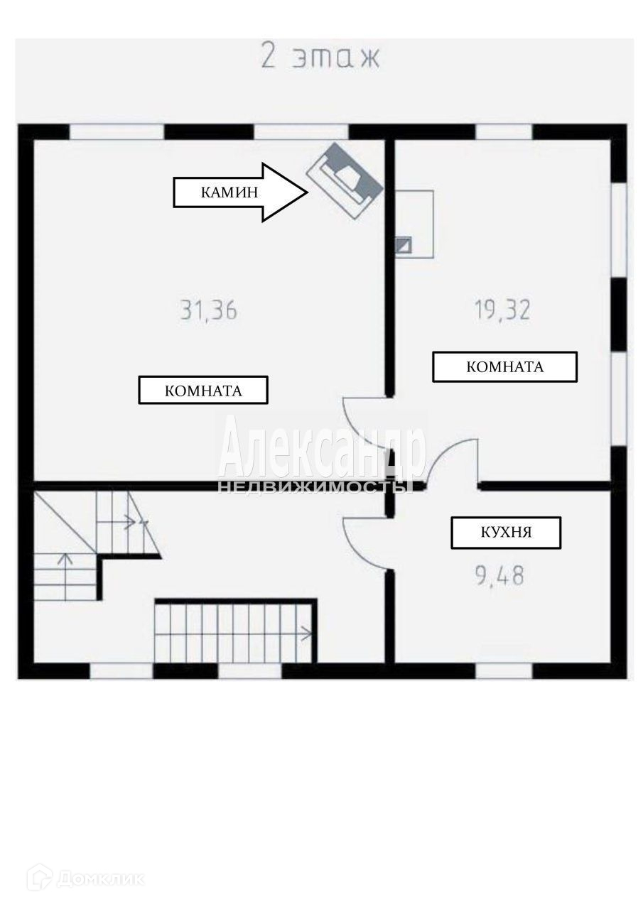 2 этаж- сруб бревно, внутренняя отделка- вагонка. Кухня 9,5 кв.м, комната 19 кв. м с печкой, вторая 31 кв.м с камином.. Есть комната для второго санузла, подведены все коммуникации.