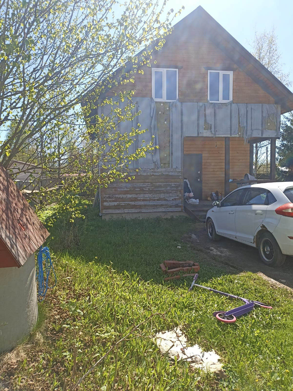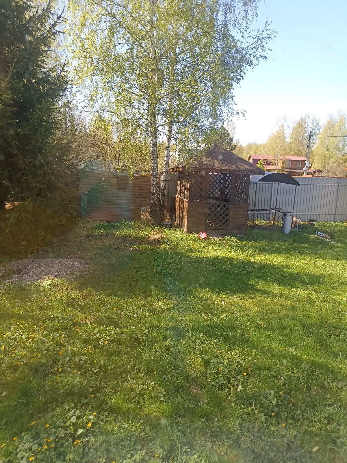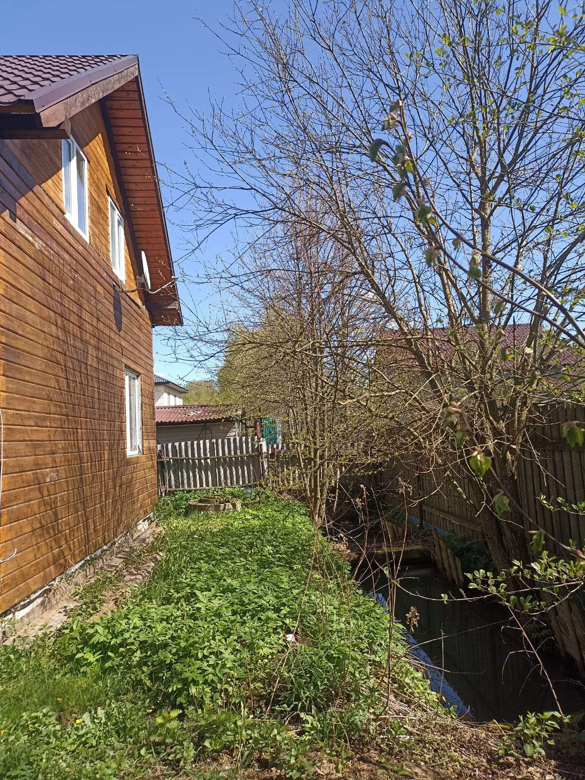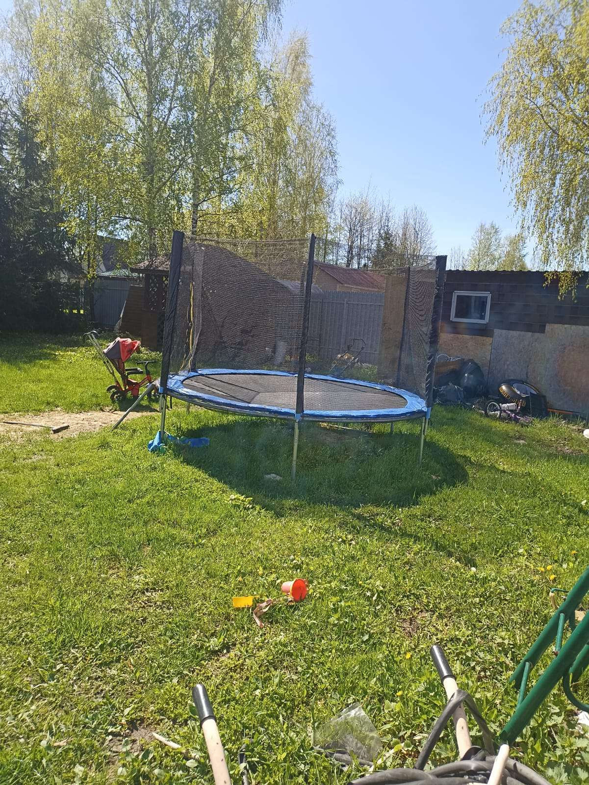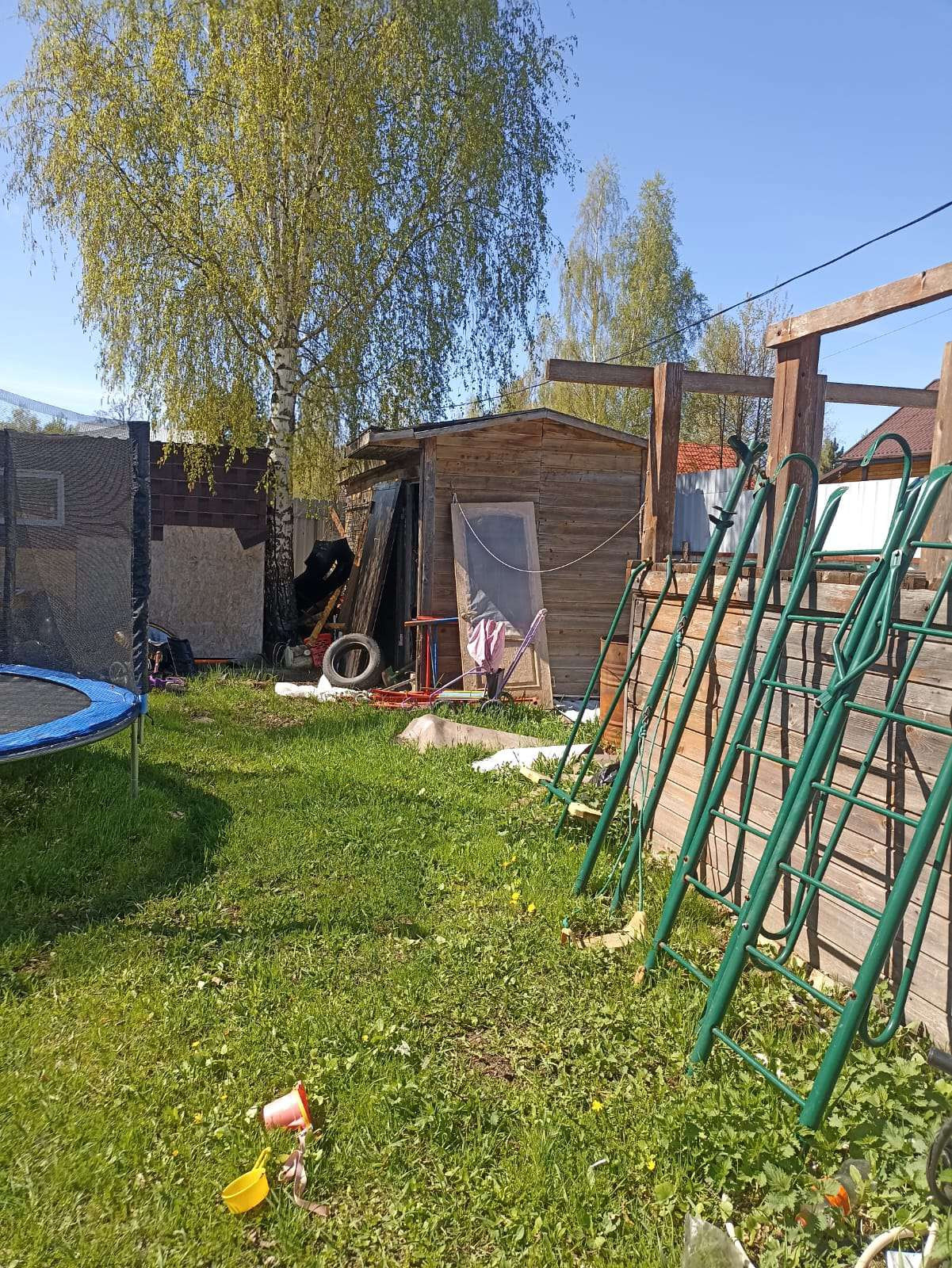 На территории участка есть место для парковки двух машин, беседка, мастерская/хозблок, детский батут.