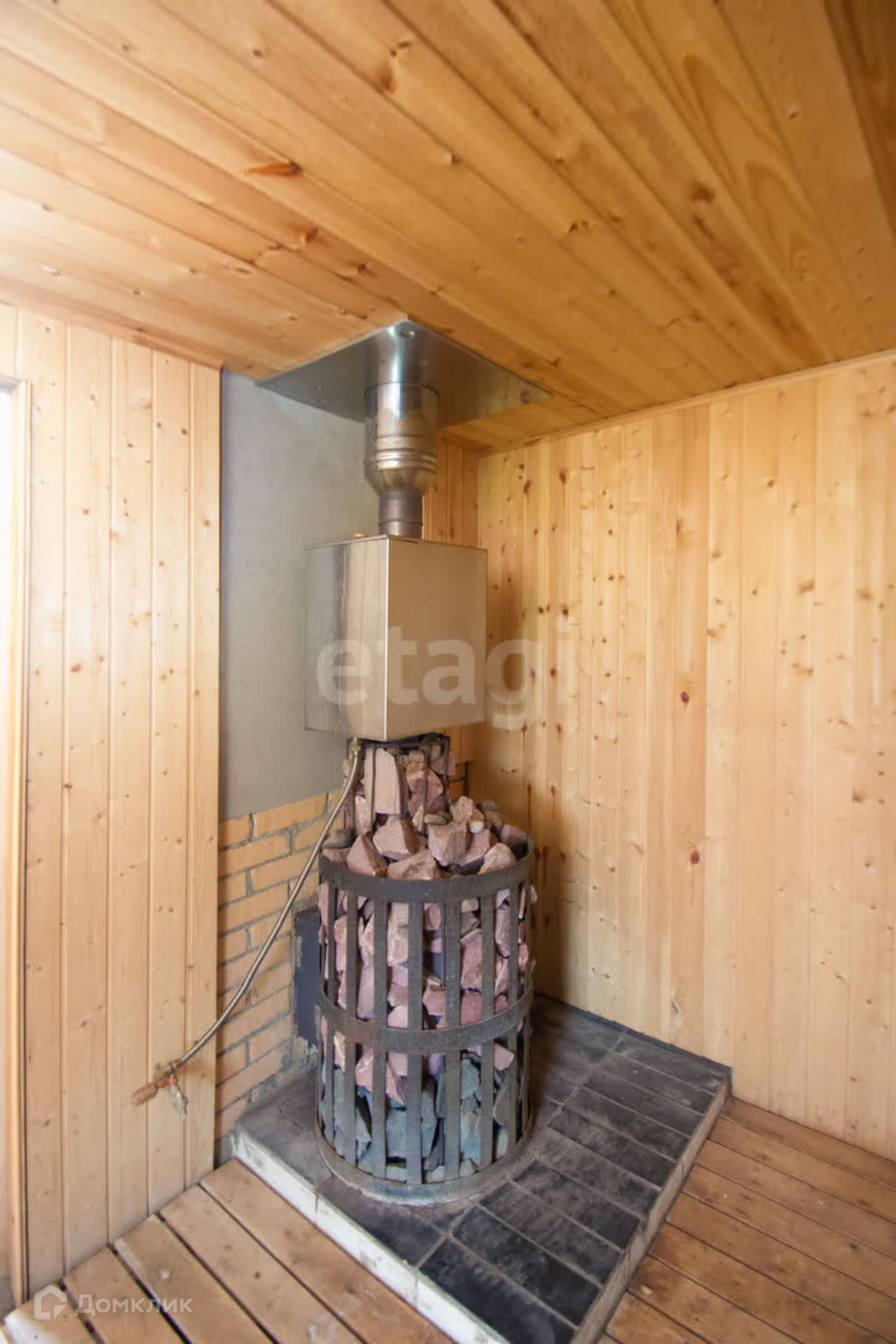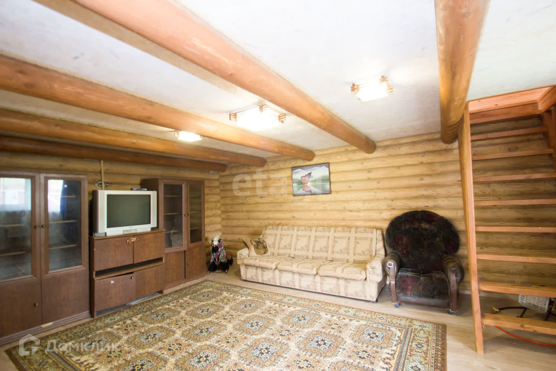 Внутри отделка: 1 -й этаж: пол - ламинат, стены - оцилиндрованное бревно, 2 -й этаж: потолок стены- вагонка, пол- половая доска.