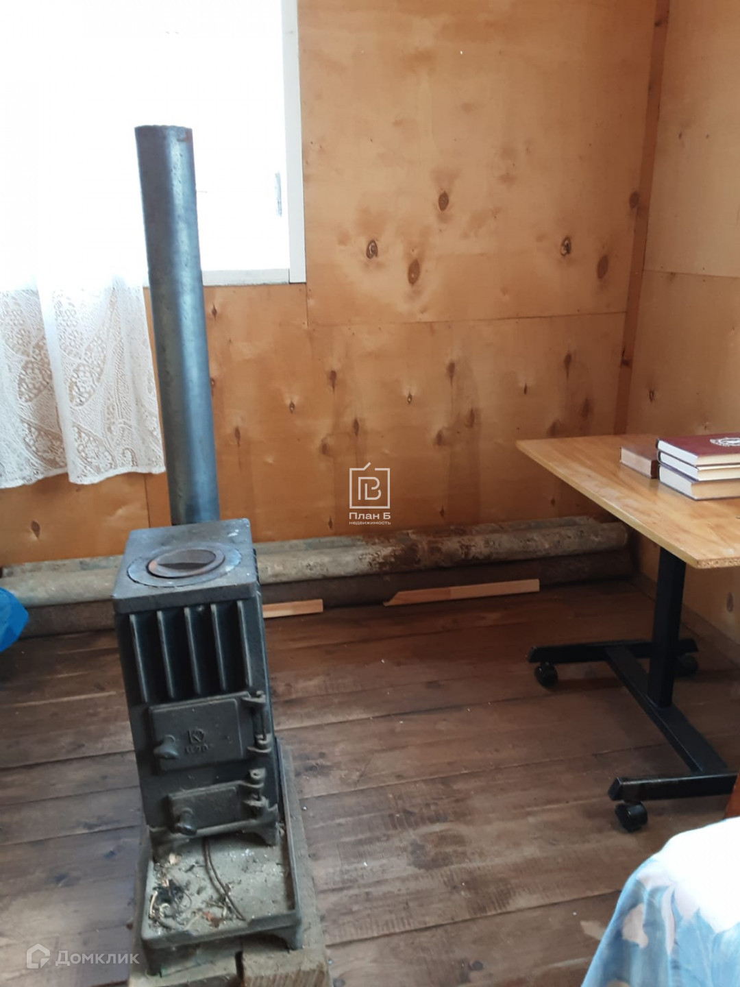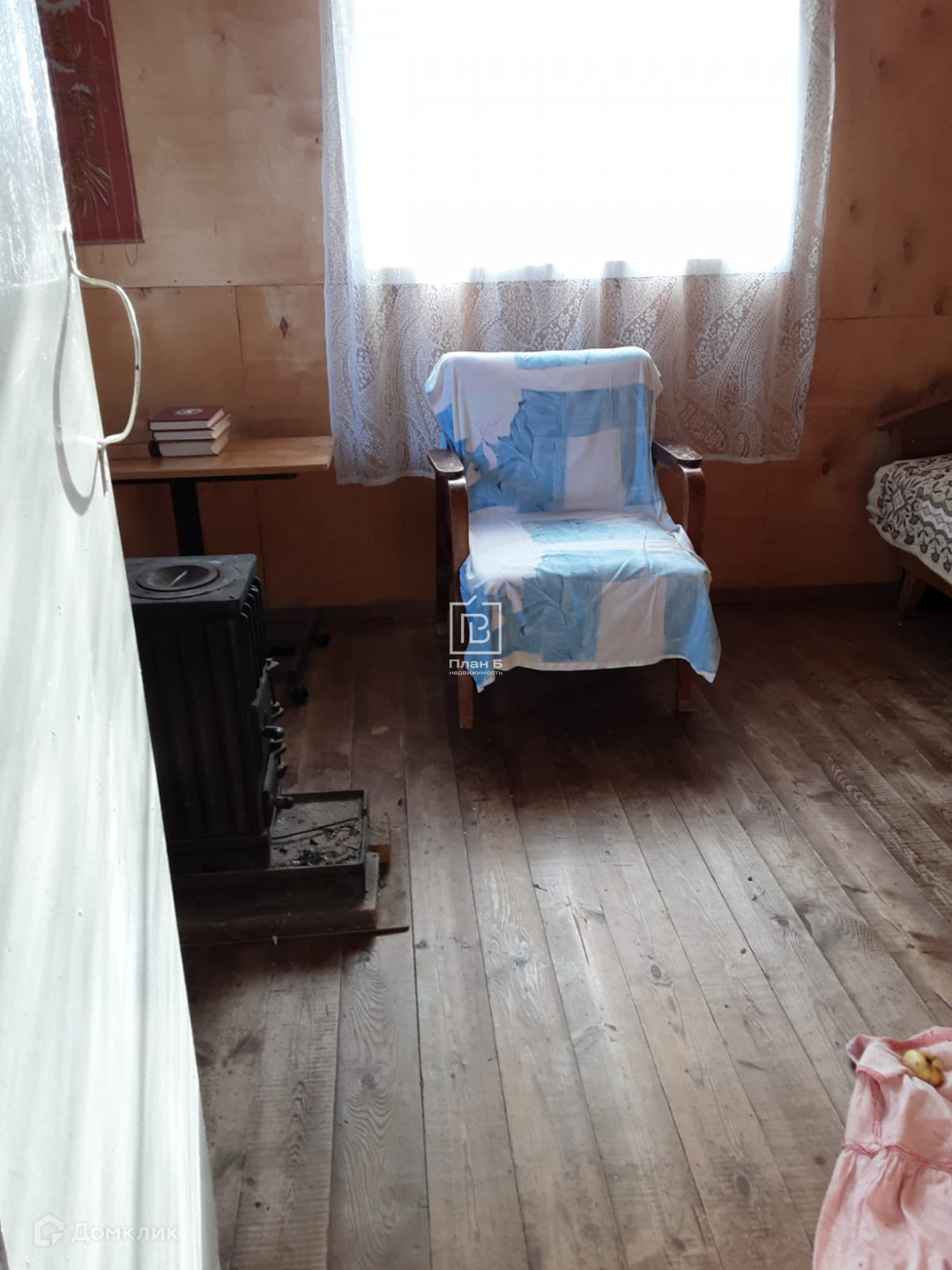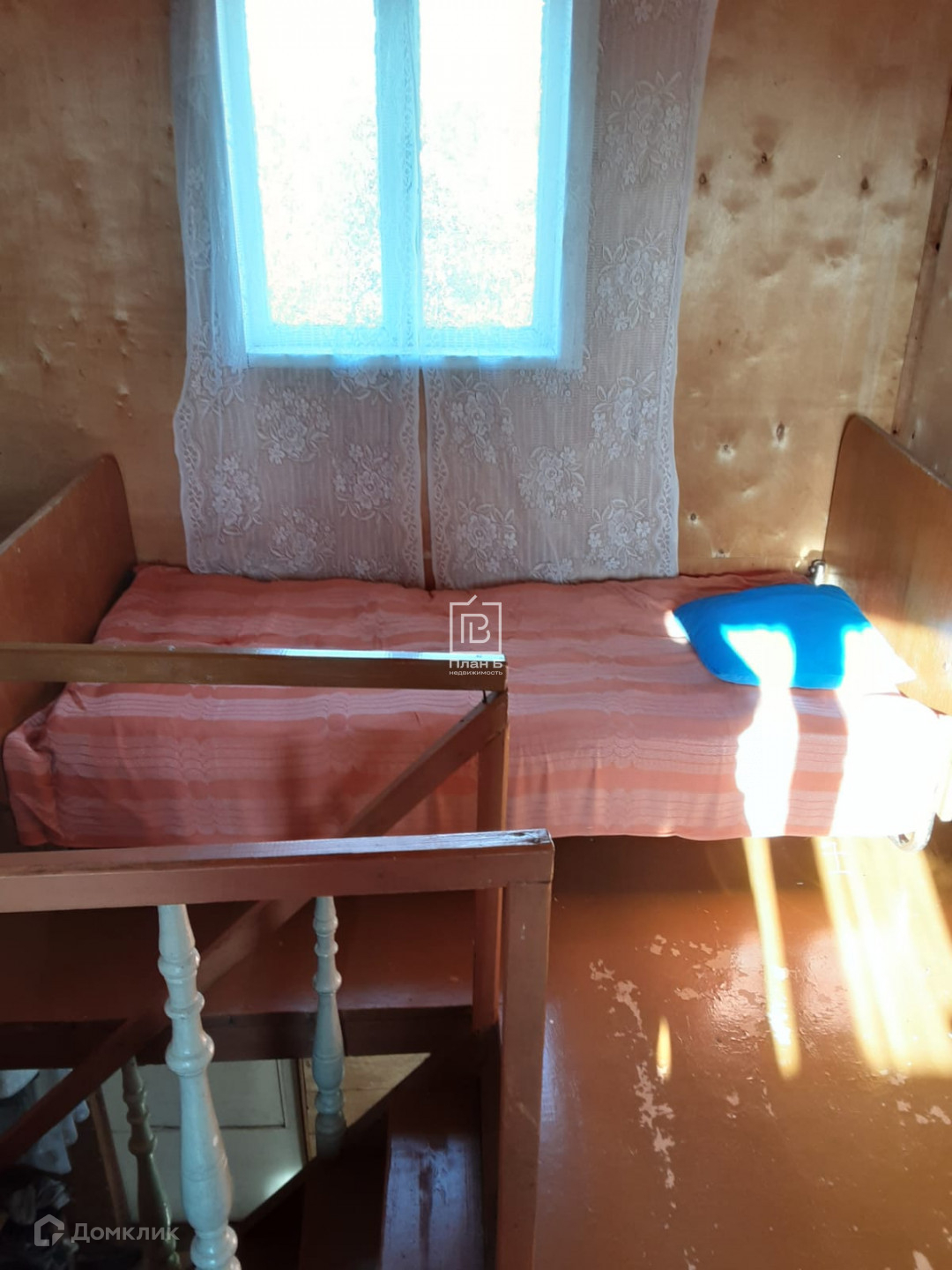 Дом каркасный, обитый досками и изнутри фанерой. Стоит на бетонных блоках. Дом с мансардой, вверху 1 комната, внизу комната и кухня.