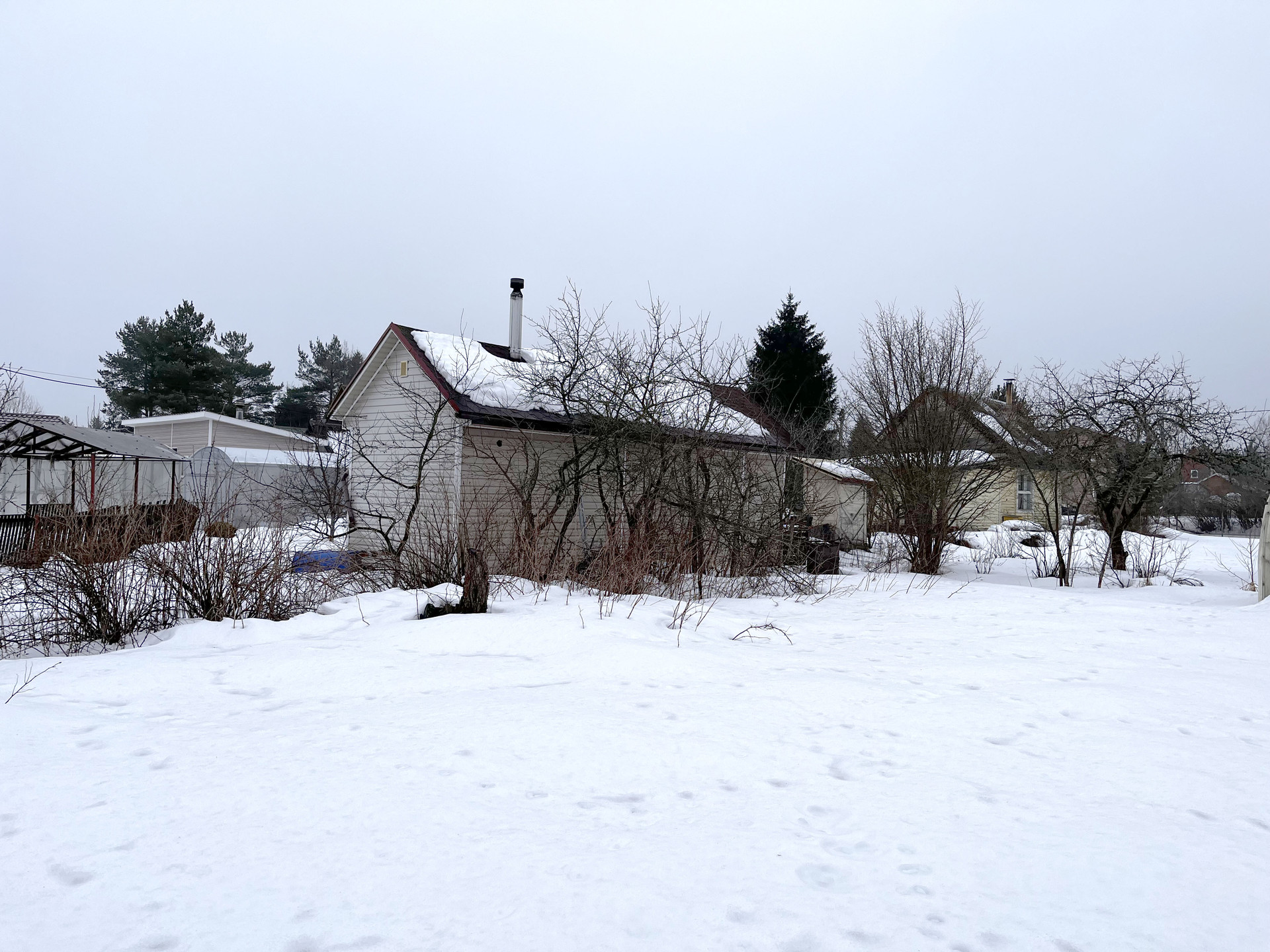 Наш участок имеет правильную форму, без перепадов. На участке расположен щитовой садовый дом, небольшой по размеру, но с пристроенной просторной верандой и крылечком. Снаружи дом обшит сайдингом.   В доме поставлена добротная печь и есть две уютные  комнаты-спальни. Можно благоустроить второй этаж. Так же, на участке, построена летняя кухня, туалет и баня. Имеется летний водопровод.