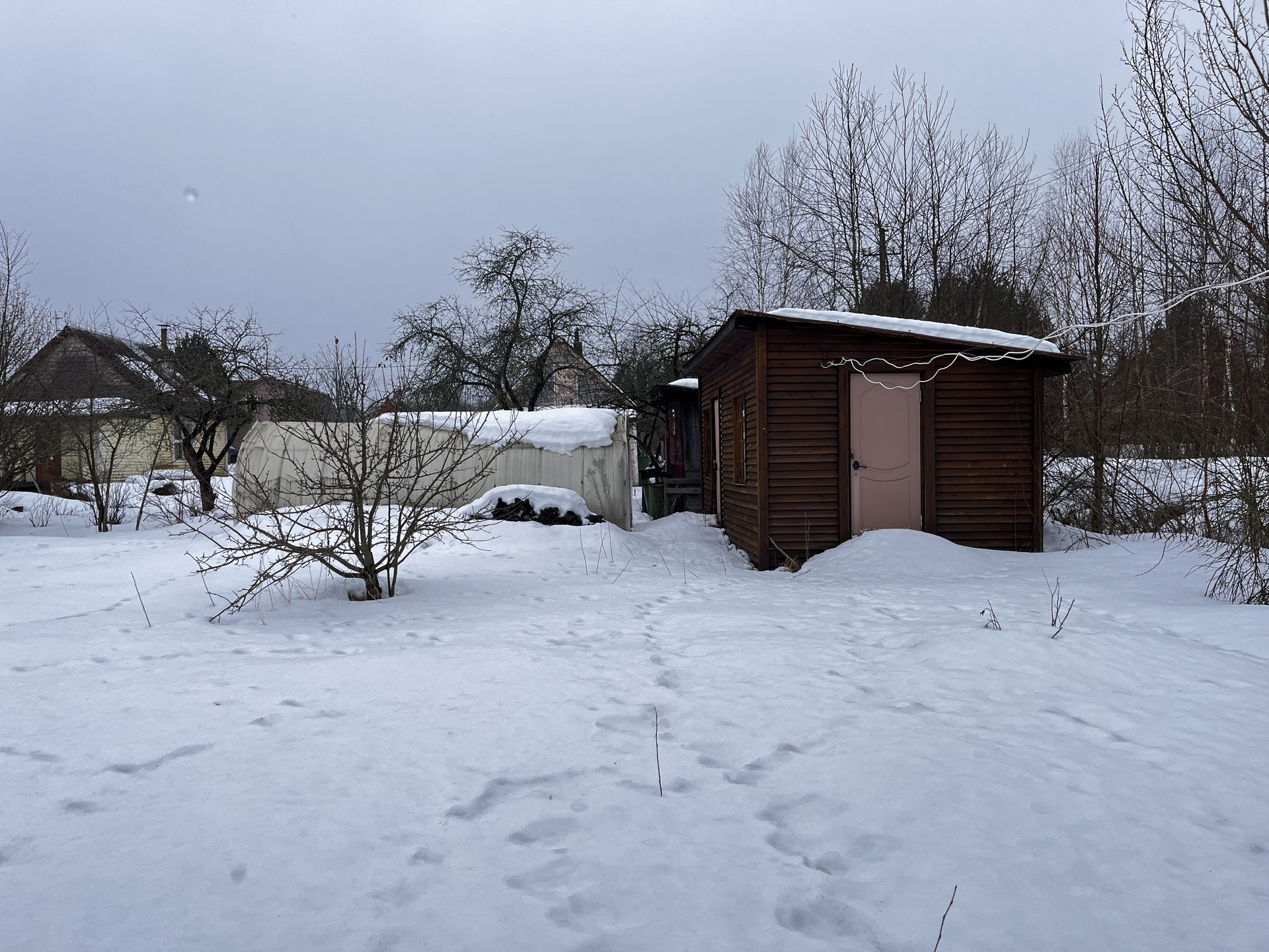 На участке посажены плодовые деревья и кустарники. Есть парник.
