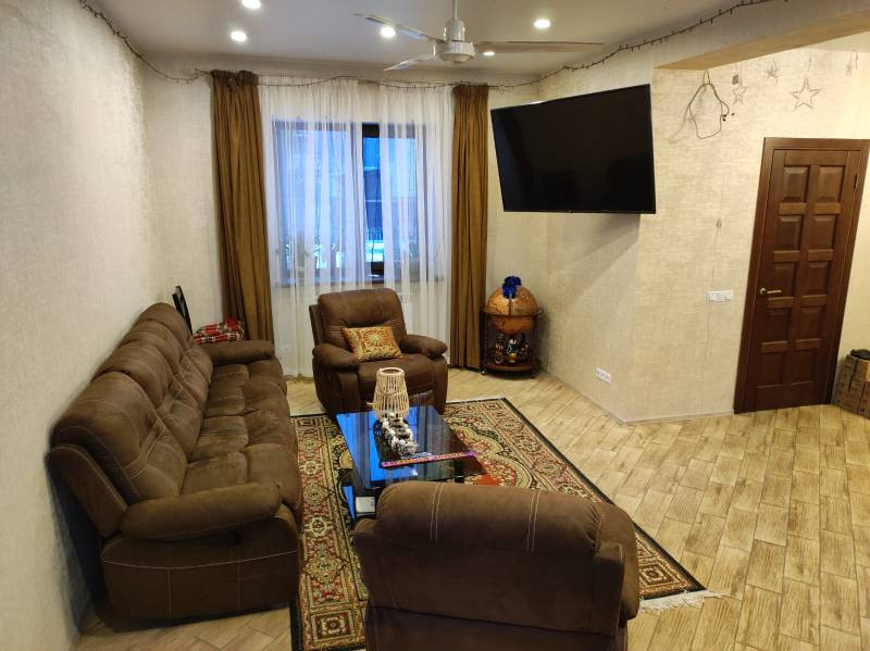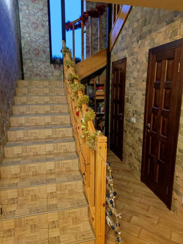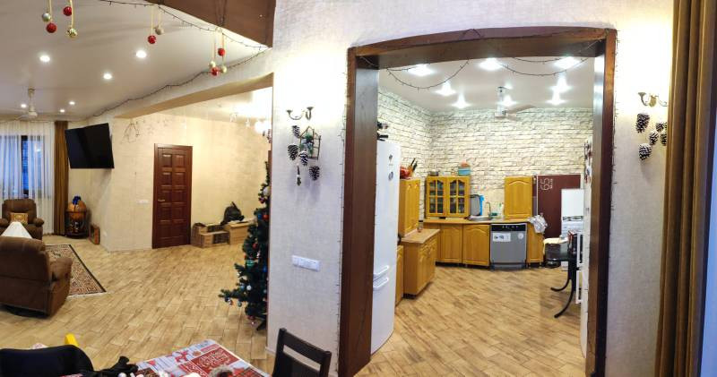 На 1 этаже: прихожая, большой холл, кухня-столовая с панорамными окнами (второй свет), 1 комната, раздельный санузел, помещение для хранения под лестницей, котельная (вход отдельный с улицы). Большая терраса 33 кв.м с плодоносящим виноградником. 2 этаж: холл, совмещённый санузел, 4 спальни, балкон 20 кв.м. 3 этаж - Мансарда: свободная планировка 51 кв.м