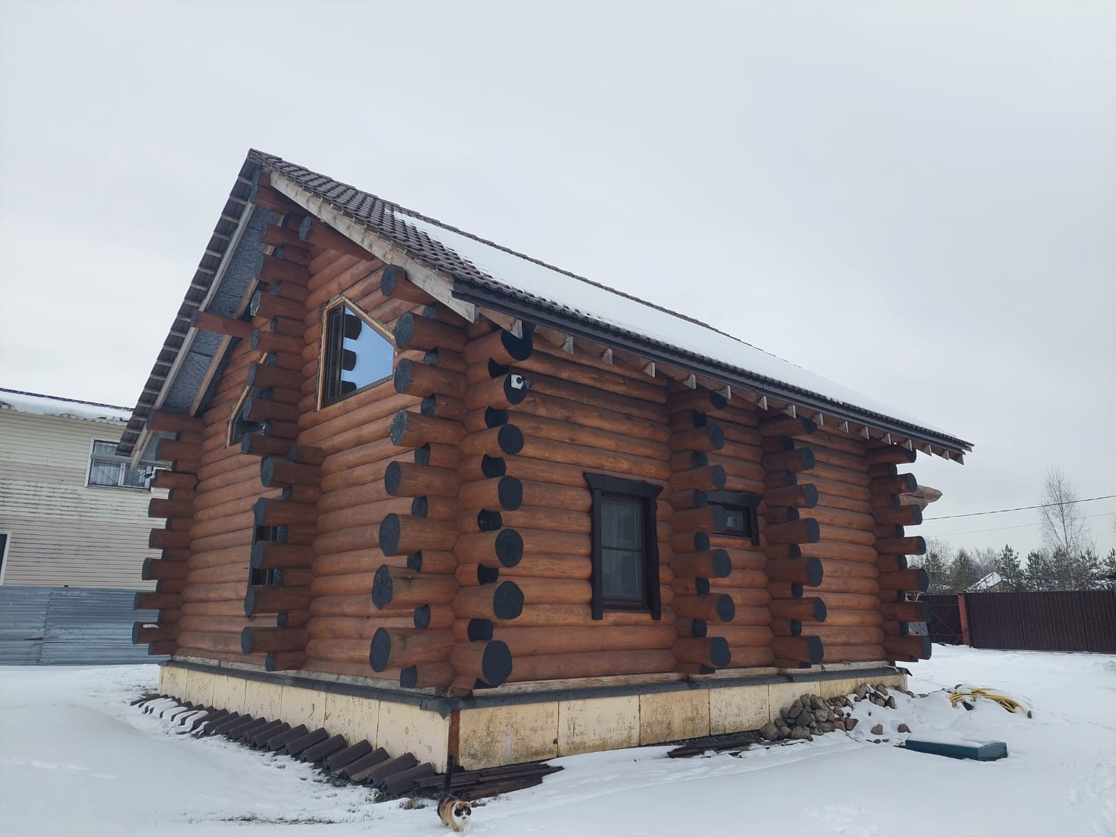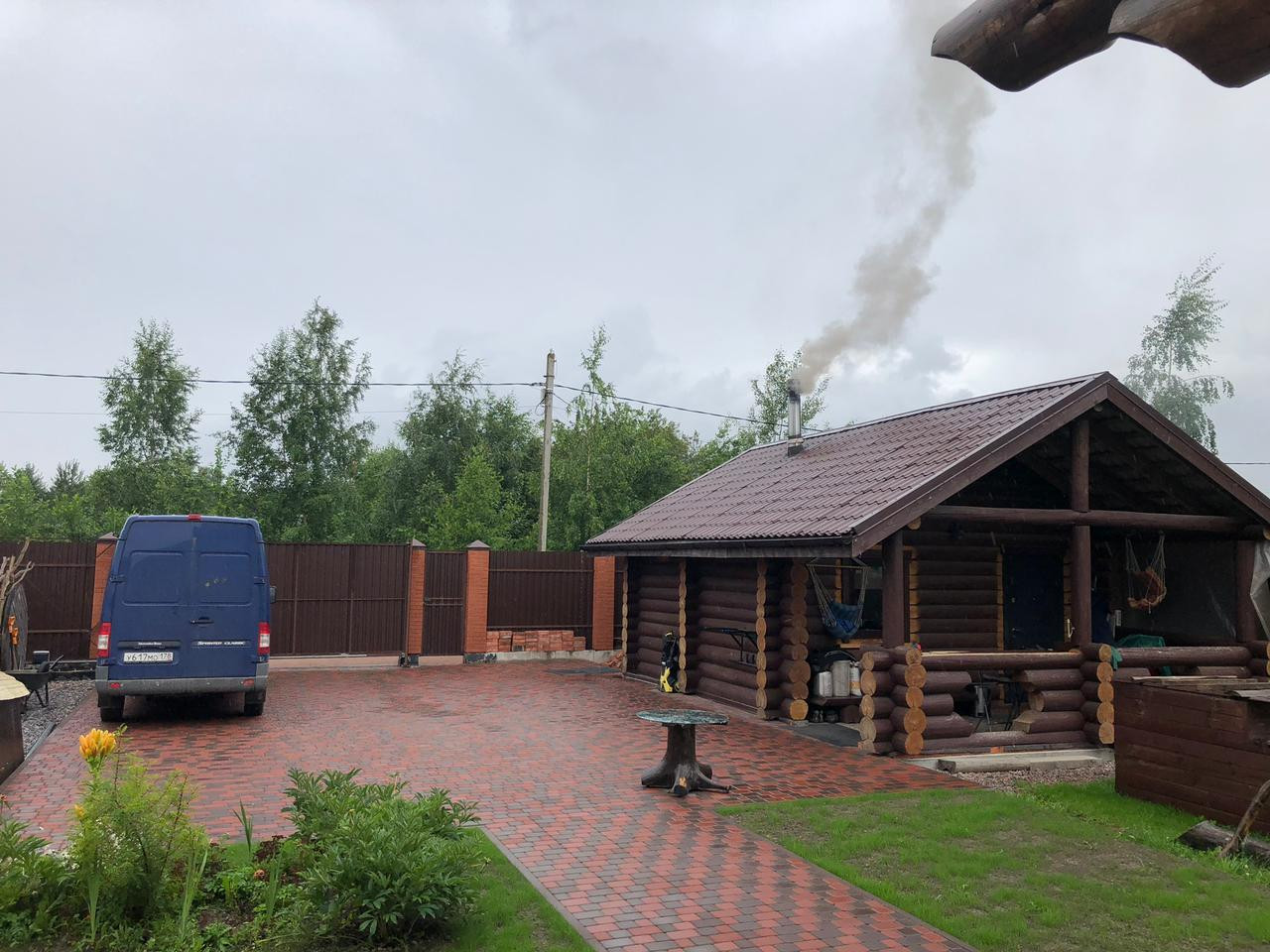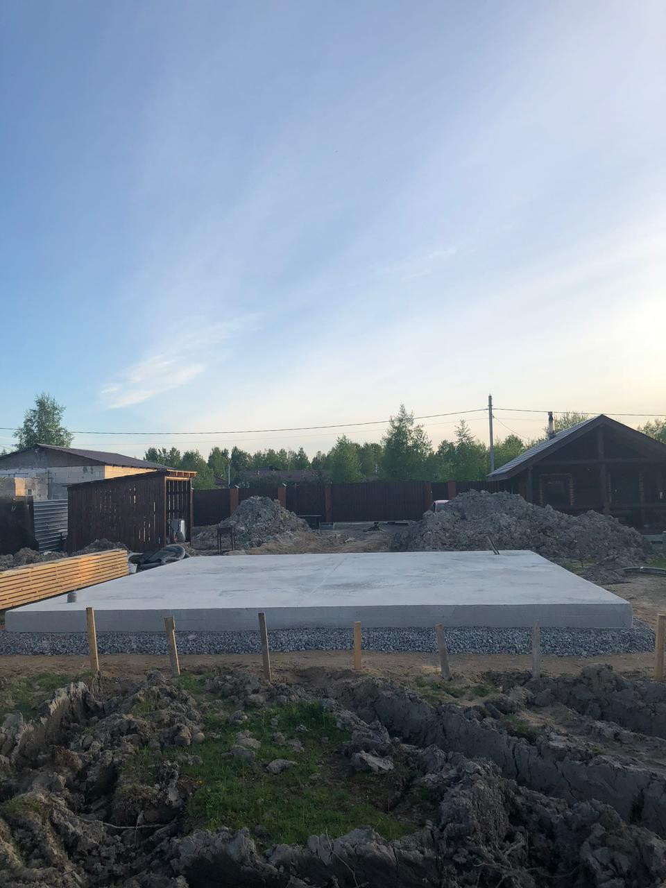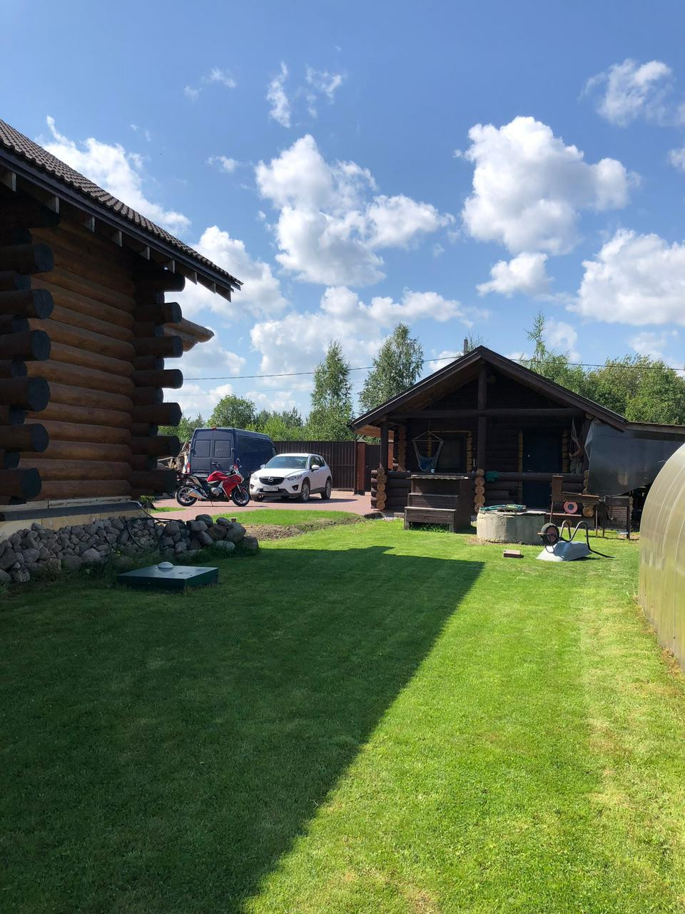 Дом -деревянный сруб, толщина бревна – 32/33 см, фундамент - монолитная плита, двойное армирование, толщина 40 см, дополнительно сделана кладка кирпича 4 ряда. Баня - деревянный сруб, толщина бревна 24/26 см, фундамент монолитная плита 20 см.