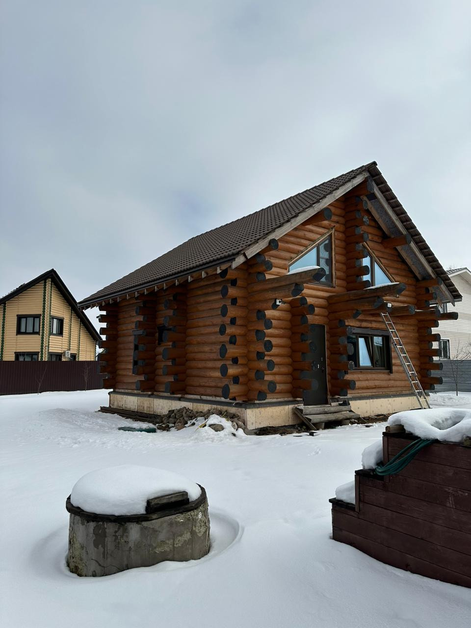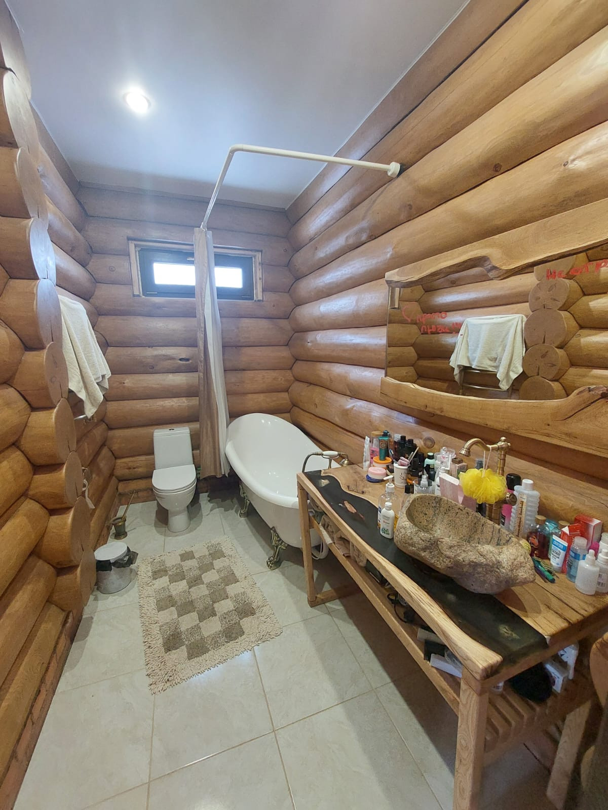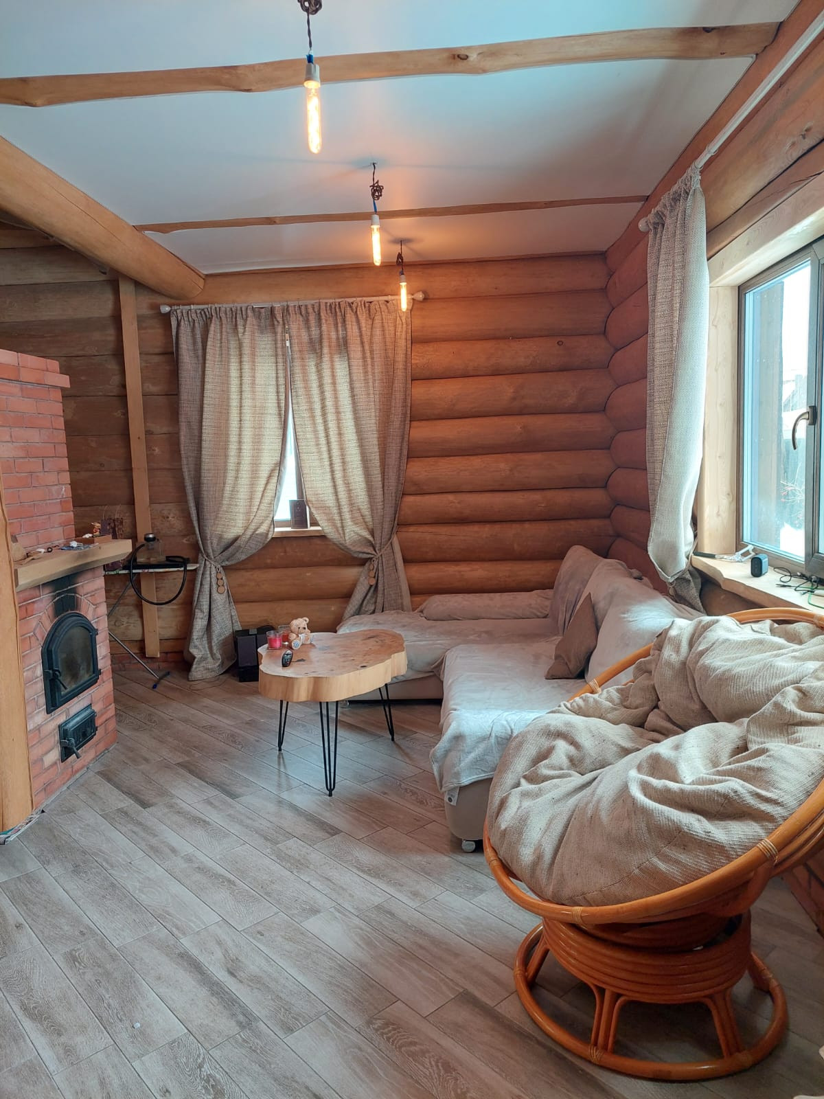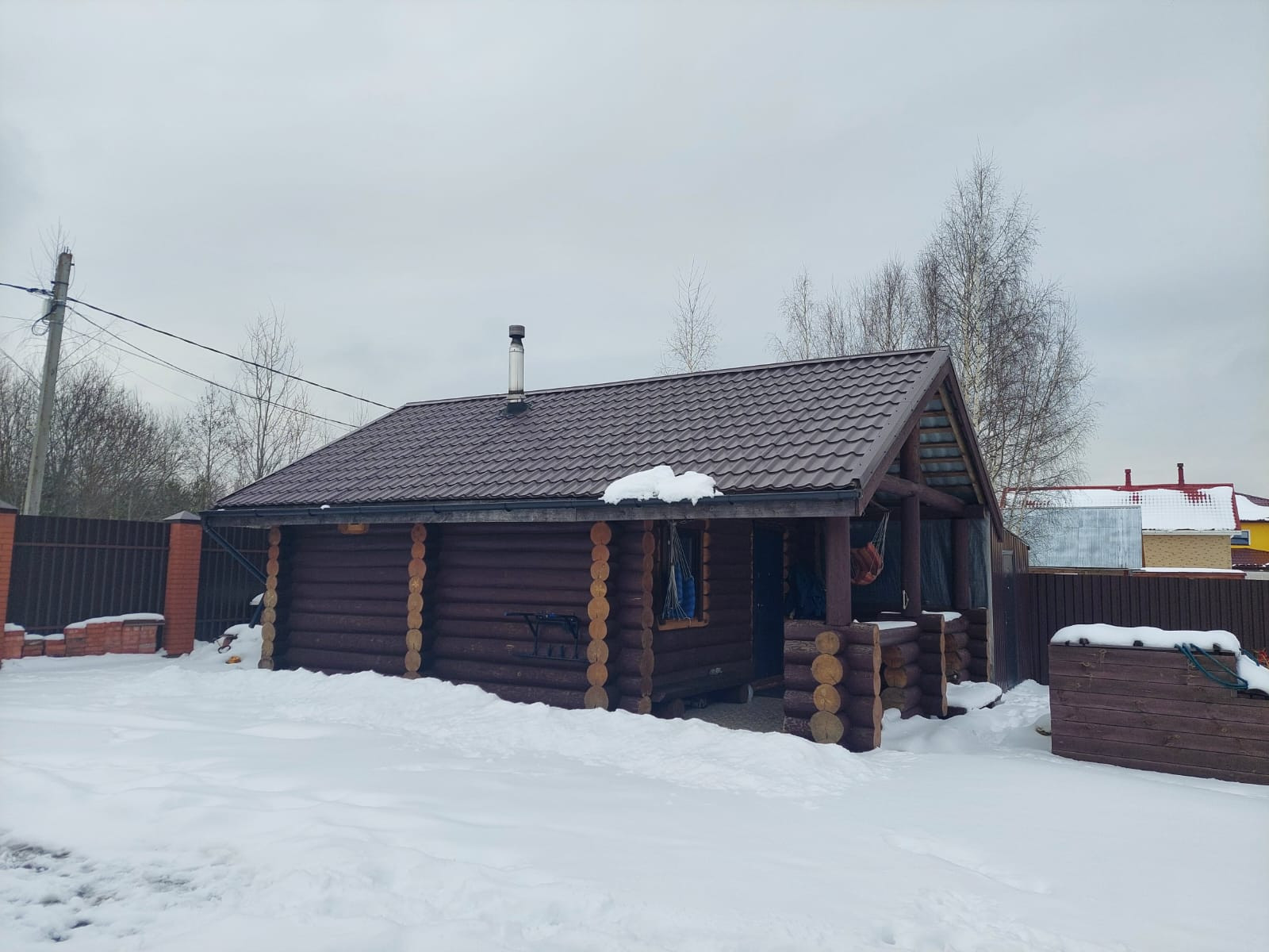 Дом -деревянный сруб, толщина бревна – 32/33 см, фундамент - монолитная плита, двойное армирование, толщина 40 см, дополнительно сделана кладка кирпича 4 ряда. Баня - деревянный сруб, толщина бревна 24/26 см, фундамент монолитная плита 20 см.
